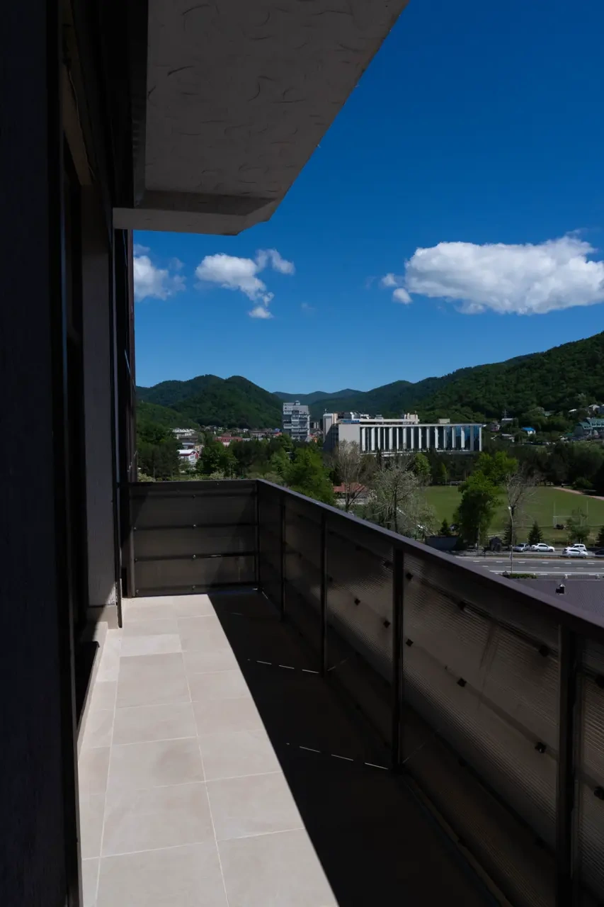 Гостиная: 2-х местный диван кровать, столик, телевизор, сплит-система, холодильник, чайная станция, вода, санузел, фен, тапочки, халаты, полотенца, мыло/шампунь. Балкон - столик со стульями, сушилка для белья. Спальня - двуспальная кровать, две прикроватные тумбочки, телефон, столик с зеркалом, шкаф для одежды, сплит-система, балкон. Общая площадь номера 50 кв.м.