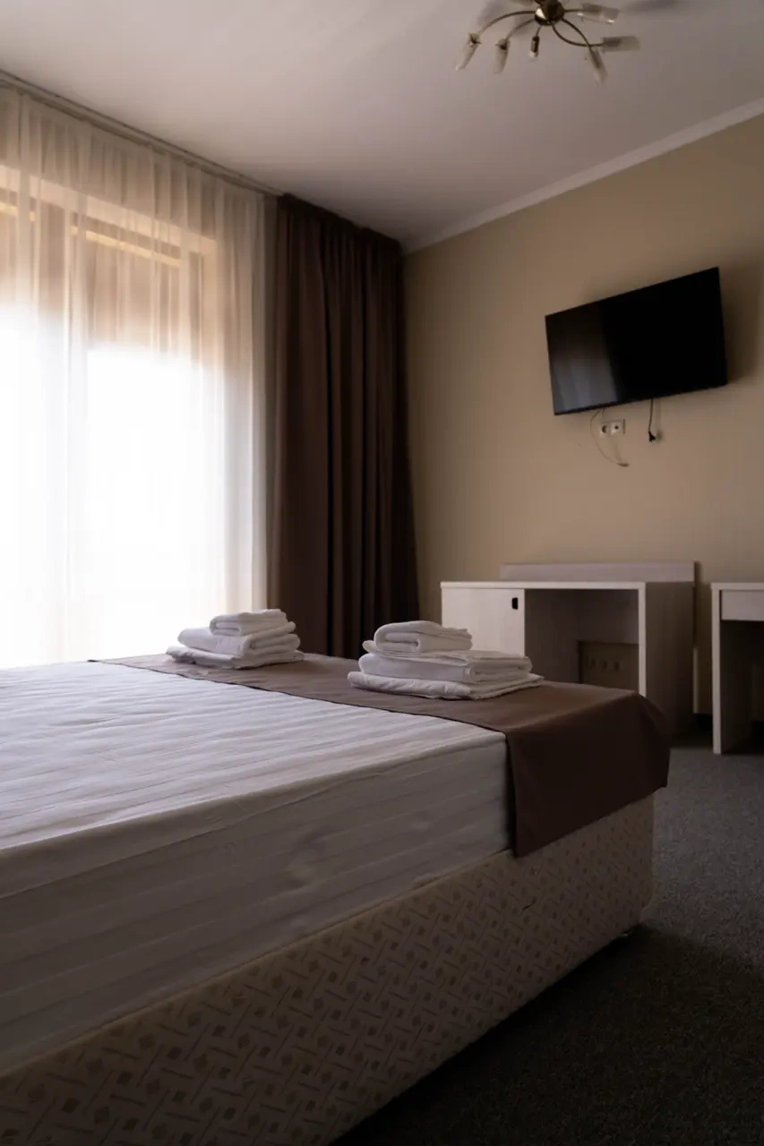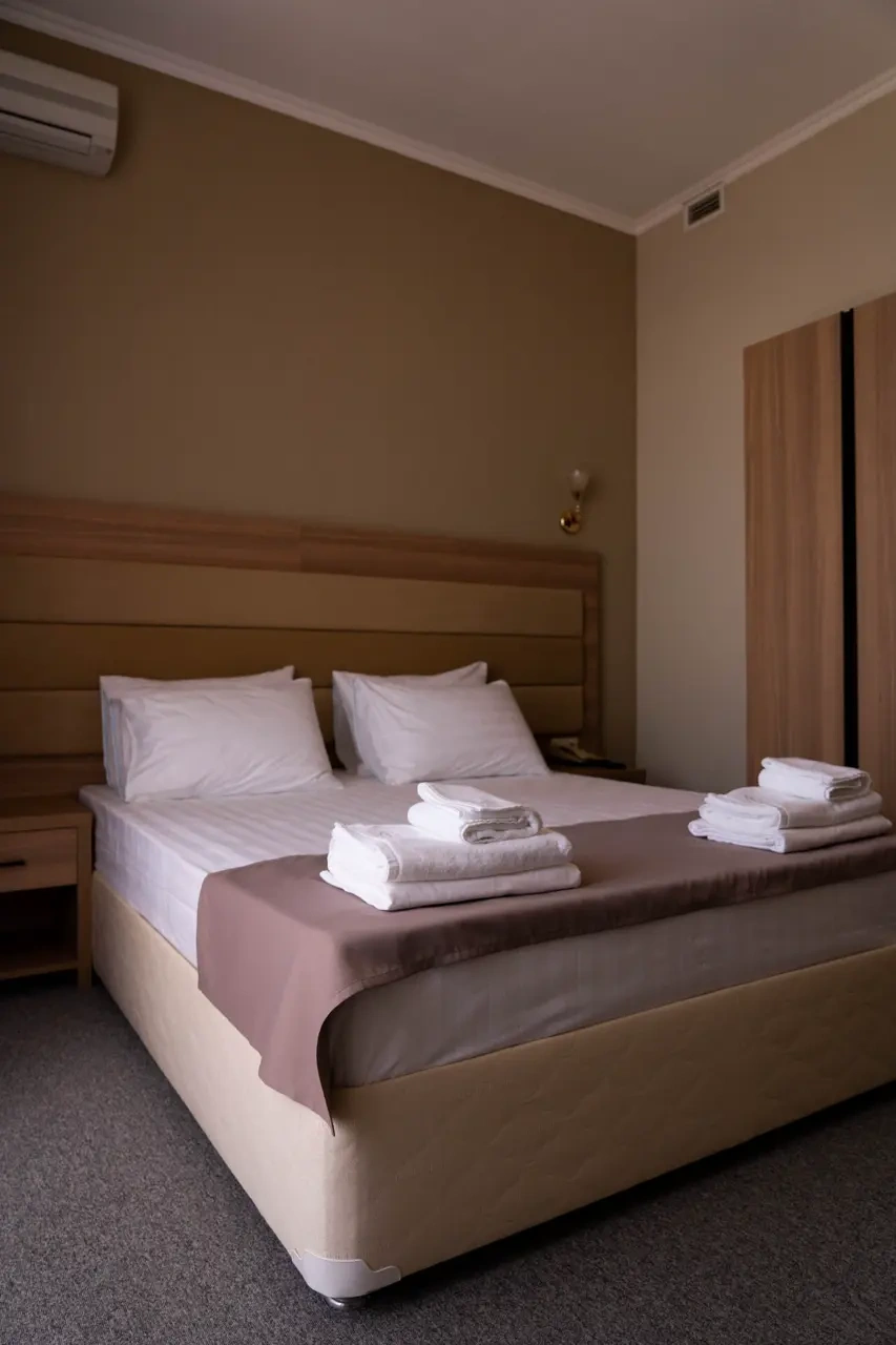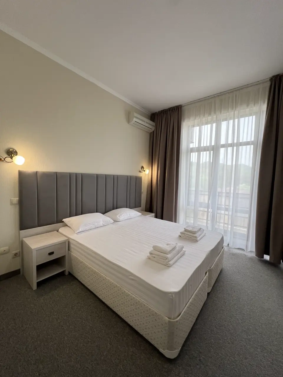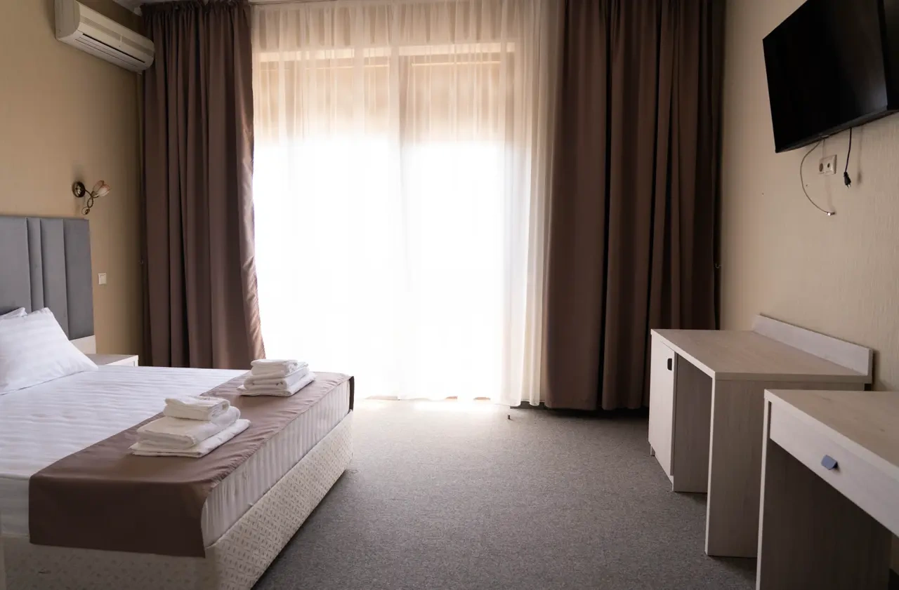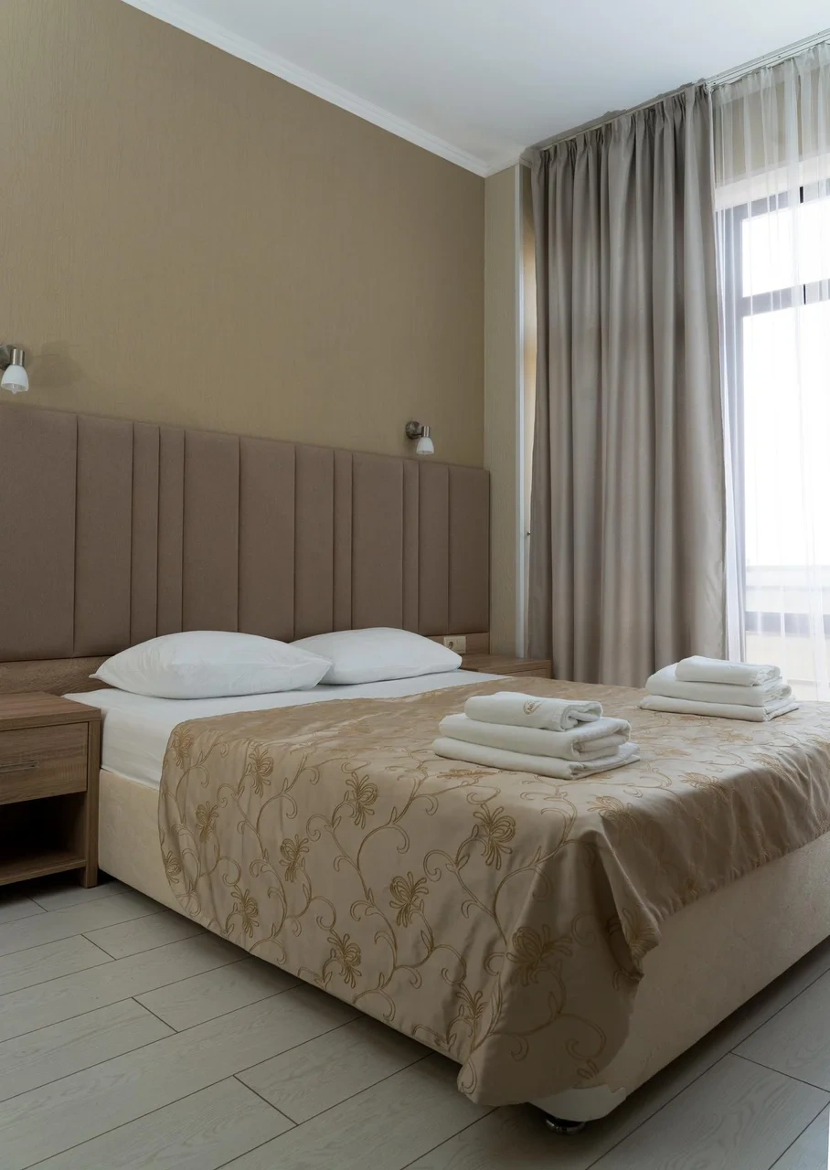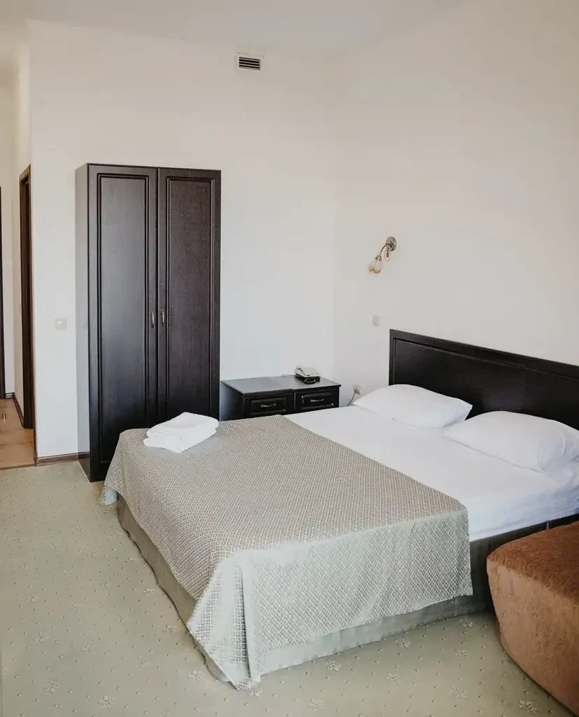 В стоимость проживания входит: - номер выбранной категории; - открытый бассейн (в сезон), 14 х 6 (1,65), без подогрева, вода пресная; - детская площадка; - круглосуточная стойка регистрации; - чайная станция, бутилированная вода (в номерах Корпус №3); - кулер с горячей и холодной водой на 1 этаже (Корпус №1, №2, №3); - предоставление утюга и гладильной доски (на этажах); - аптечка первой медицинской помощи у администратора; - wi-fi предоставляется в общественных зонах (служба приема и размещение); - автостоянка. Услуги, предоставляемые за дополнительную плату: - Кафе (Корпус №2) - Завтрак, Обед и Ужин – по меню кафе; - Бар - Пивоварня (Корпус №2) – пиво и квас собственного производства; - Аренда мангала – 3.000₽; - Депозитарий – 200₽/день; - Тапочки – 200₽; - Халат - 1.000₽; - Бритвенный набор – 100₽; - Зубной набор – 100₽; - Пляжные полотенца; - Услуги прачечной; - Дополнительная уборка номера или внеплановая смена постельного белья – 1.000₽; - Такси. Дополнительная информация: КУРОРТНЫЙ СБОР С 2024 ГОДА - 30₽ В СУТКИ ЗА 1 ЧЕЛОВЕКА. КУРЕНИЕ разрешено на территории гостиничного комплекса в строго отведенных местах КУРЕНИЕ В НОМЕРАХ ВСЕХ КАТЕГОРИЙ И НА БАЛКОНАХ СТРОГО ЗАПРЕЩЕНО! На основании с п. 5 ч. 1 ст. 12 Федерального закона от 23.02.2013 № 15-ФЗ «Об охране здоровья граждан от воздействия окружающего табачного дыма и последствий потребления табака» ШТРАФ ЗА КУРЕНИЕ В НОМЕРАХ - 5.000₽ Дети до 5 лет размещаются бесплатно, без занимания дополнительного места. При дополнительном размещении дополнительное место - 1.000₽/чел. в сутки (в не сезон - 500₽) ПРОЖИВАНИЕ С ЖИВОТНЫМИ ЗАПРЕЩЕНО!!!