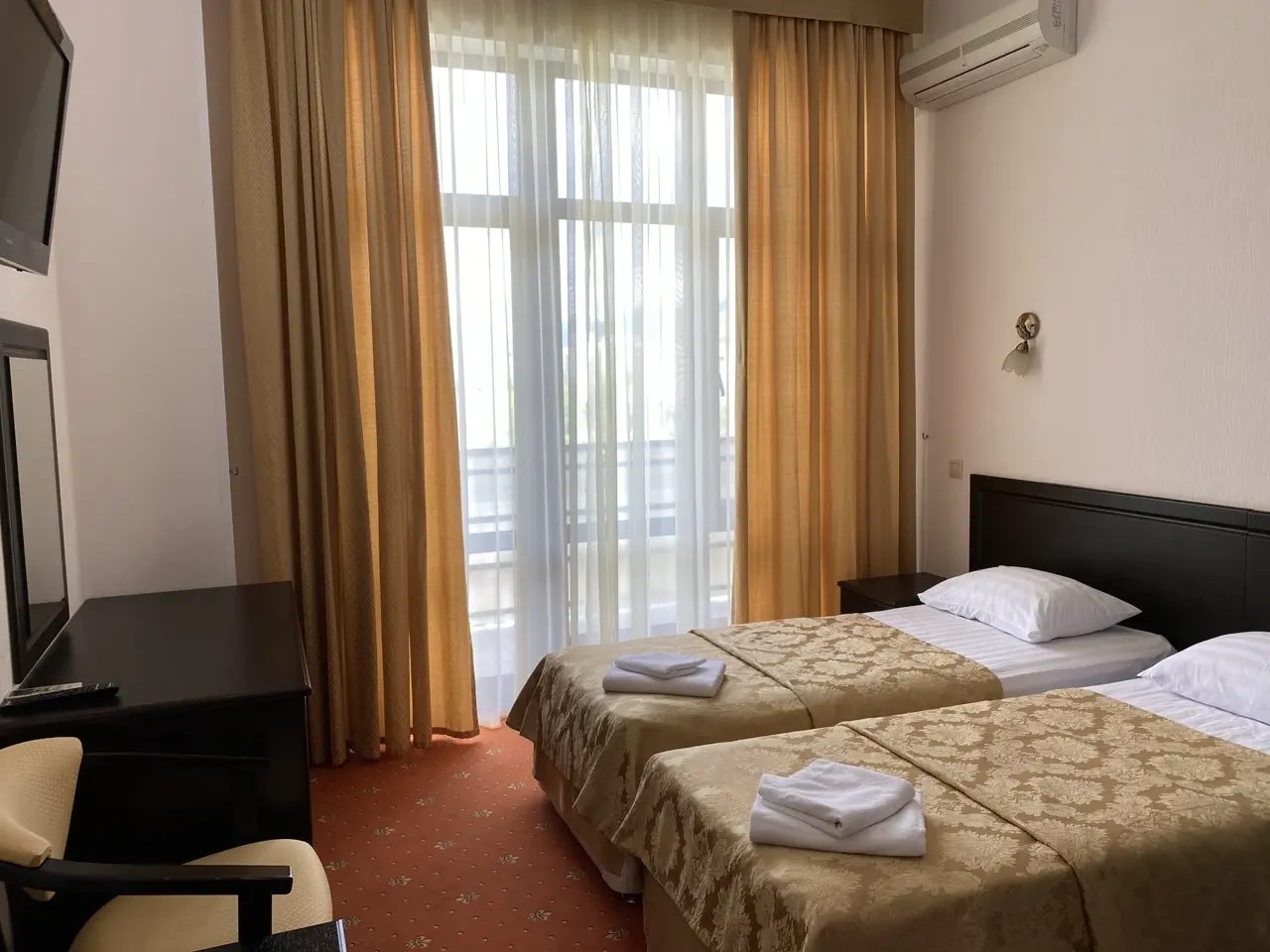 В номере — двуспальная или 2 раздельные кровати, 2 прикроватные тумбочки, столик с зеркалом, шкаф для одежды, сплит-система, телефон, телевизор, мини бар, чайная станция, вода, фен, санузел, полотенце, мыло/шампунь. В некоторых номерах предусмотрено дополнительное место (евро раскладушка). Балкон: сушилка для белья, стулья и столик. Общая площадь номера 20 кв.м.