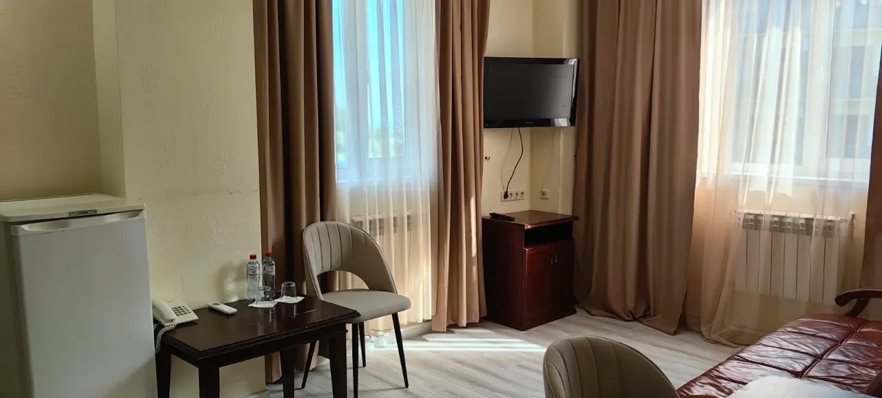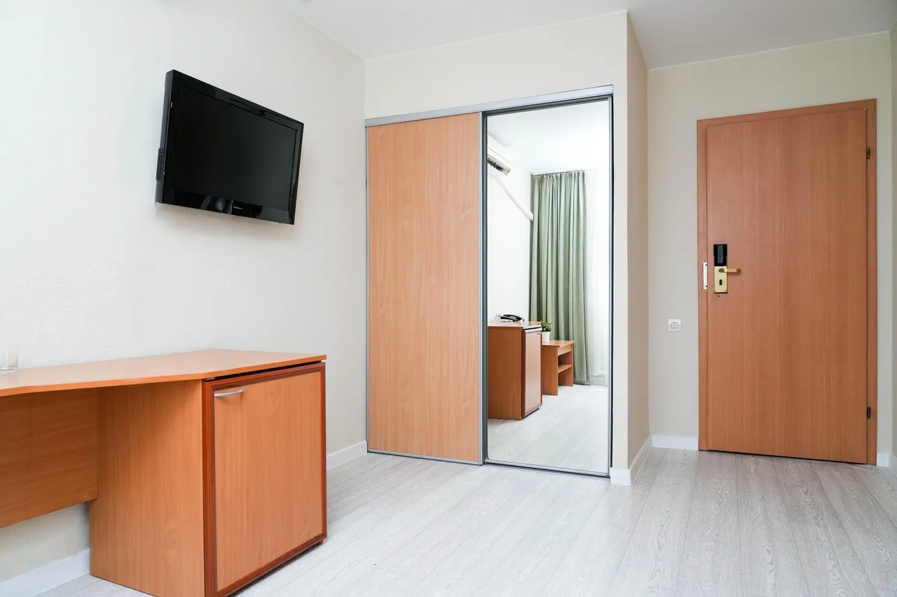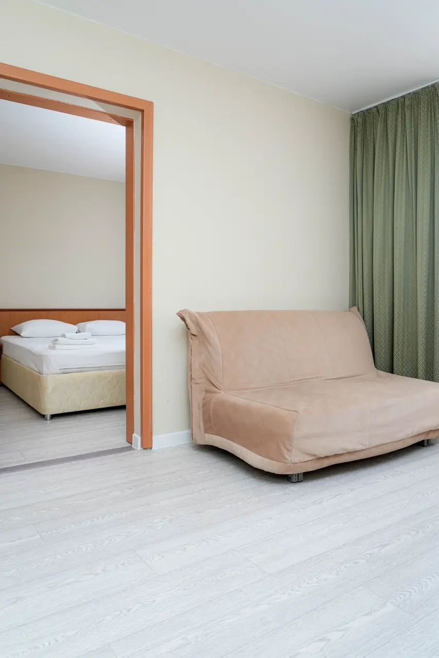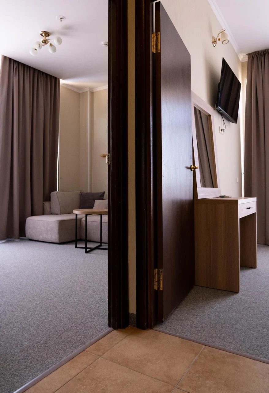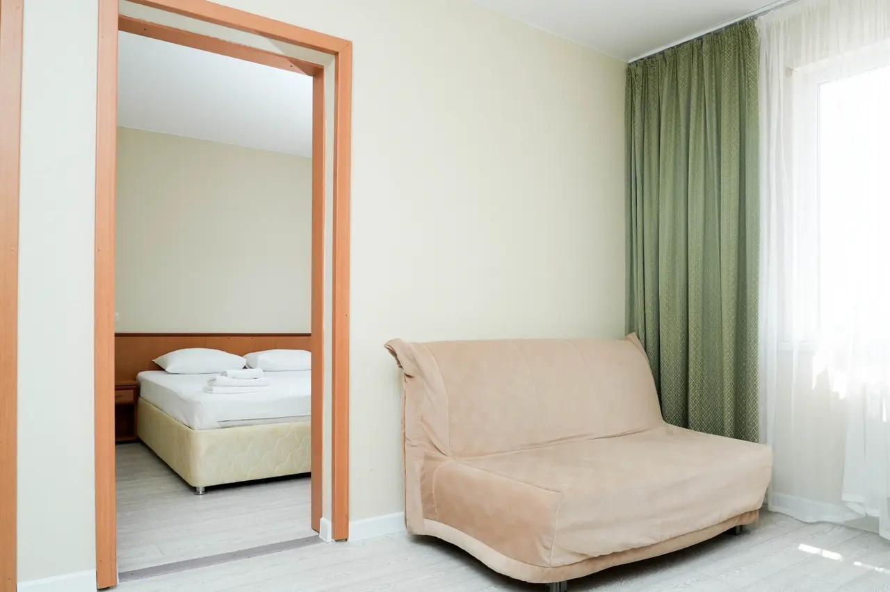 Гостиная - с мини кухней, одноместный диван, журнальный стол, шкаф для одежды, халаты, тапочки, телевизор, сплит-система, чайная станция, вода, микроволновая печь, холодильник. Спальня - двухместная кровать, прикроватные тумбочки, зеркало, сплит-система. Санузел — душевая кабина, фен, полотенце, мыло/шампунь. Общая площадь номера 26 кв.м.