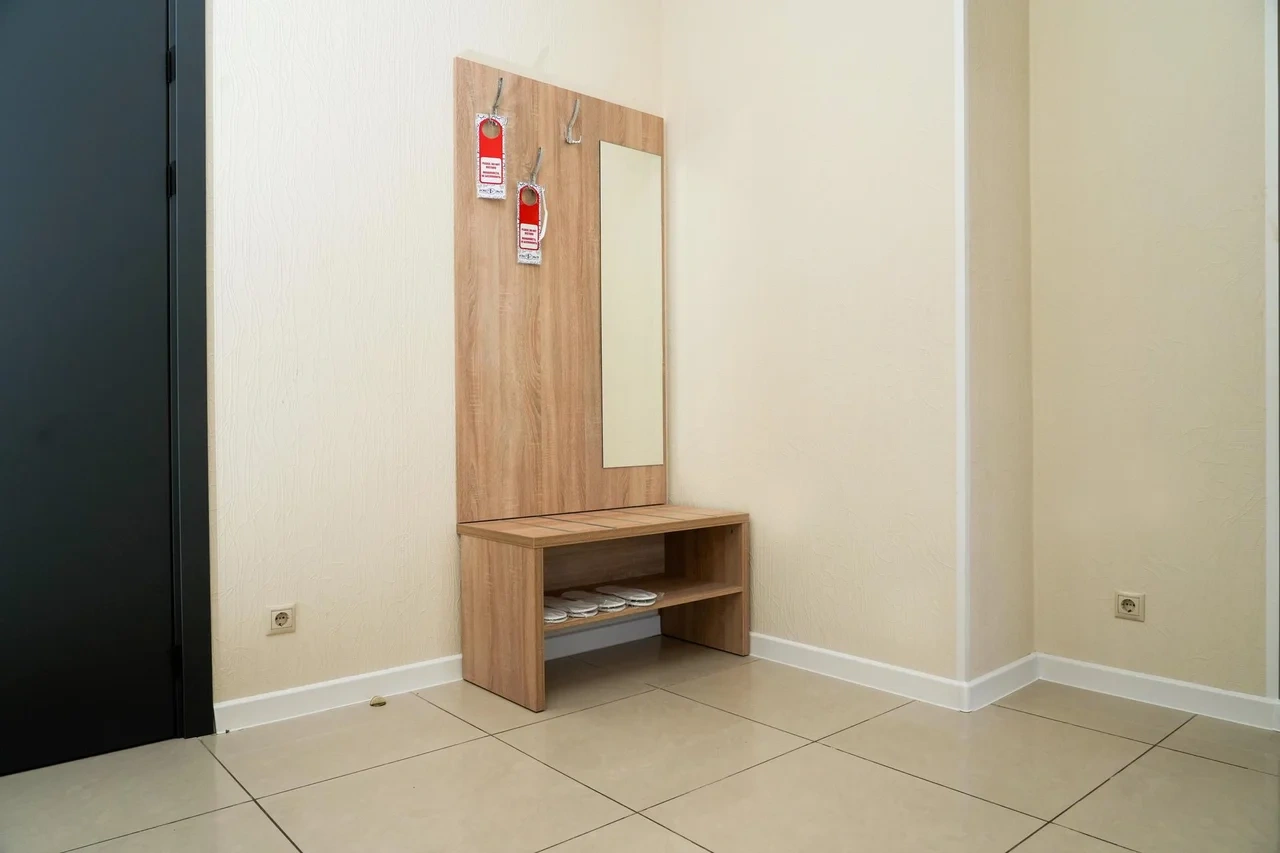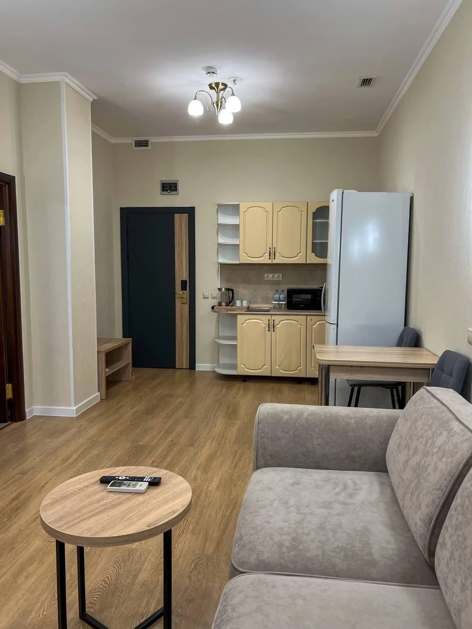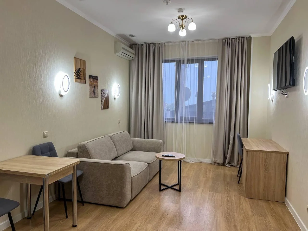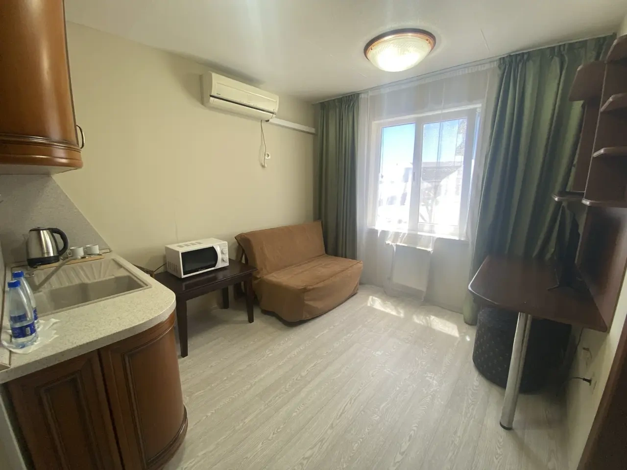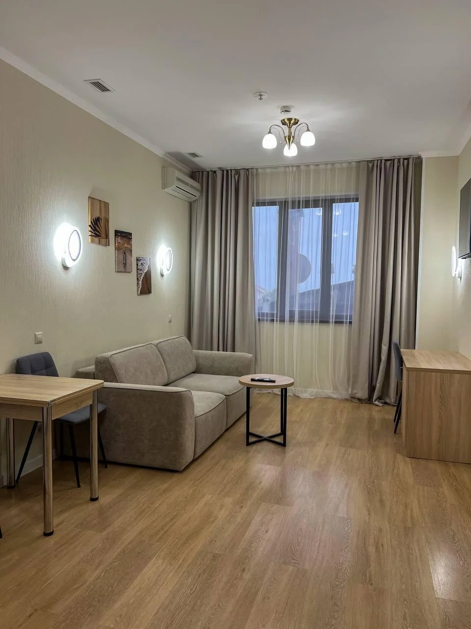 Гостиная - с мини кухней, одноместный диван, журнальный стол, шкаф для одежды, халаты, тапочки, телевизор, сплит-система, чайная станция, вода, микроволновая печь, холодильник. Спальня - двухместная кровать, прикроватные тумбочки, зеркало, сплит-система. Санузел — душевая кабина, фен, полотенце, мыло/шампунь. Общая площадь номера 26 кв.м.