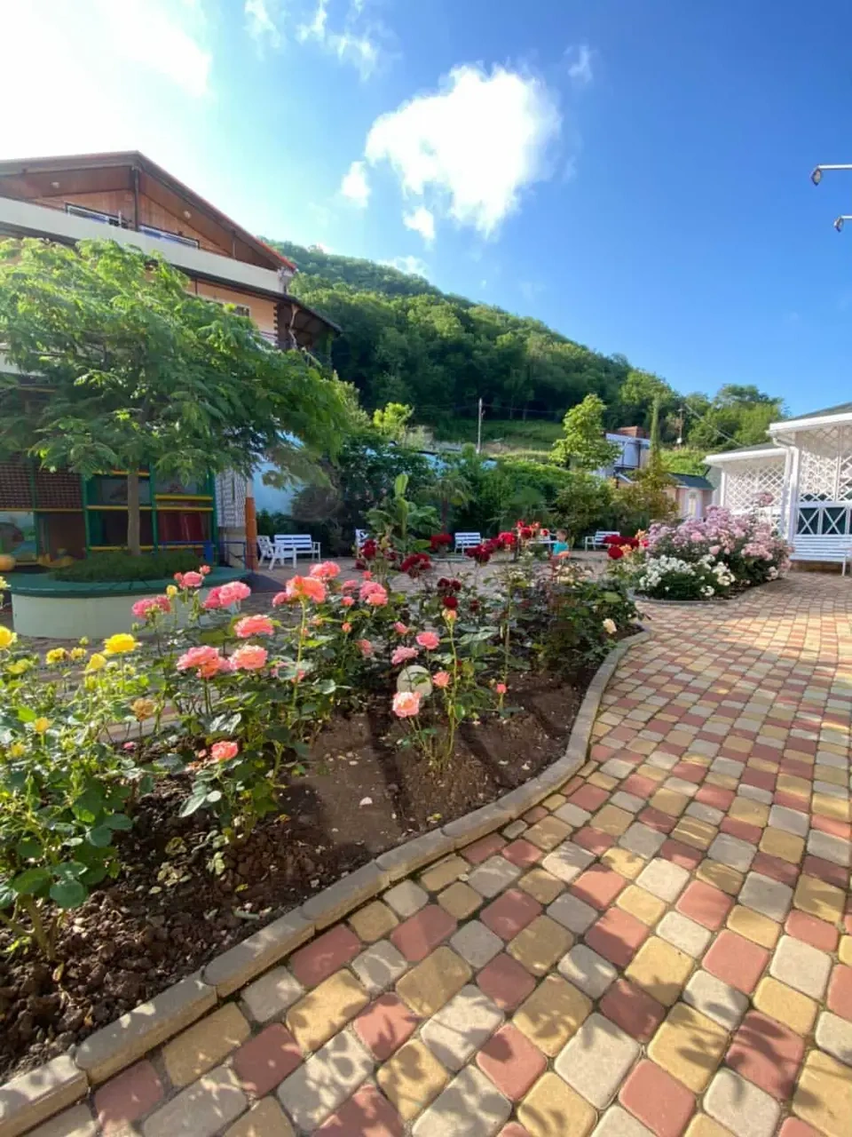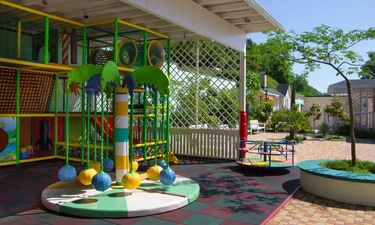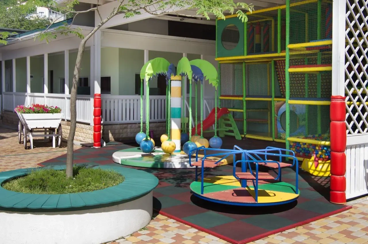 Красивая зеленая территория, отличная игровая зона. Есть возможность питаться в столовой (цены средние, вкус тоже).