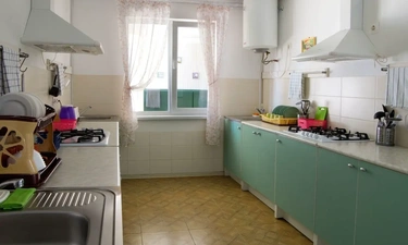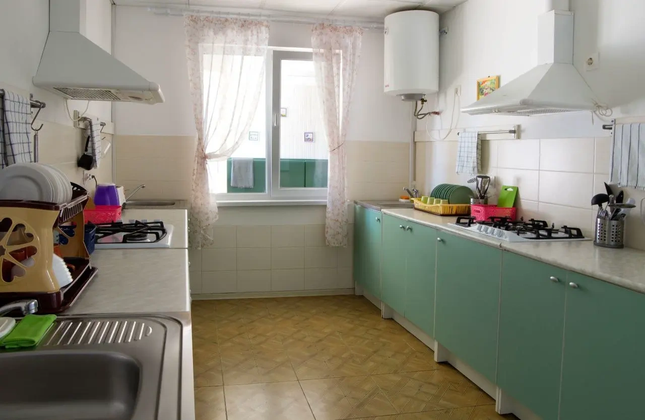 Парковка платная, кухня отдельная для всех, бывает очередь у газ. плит. За 5 ночей убирались один раз, но это норм для нашего юга/моря.
