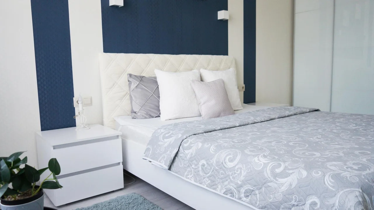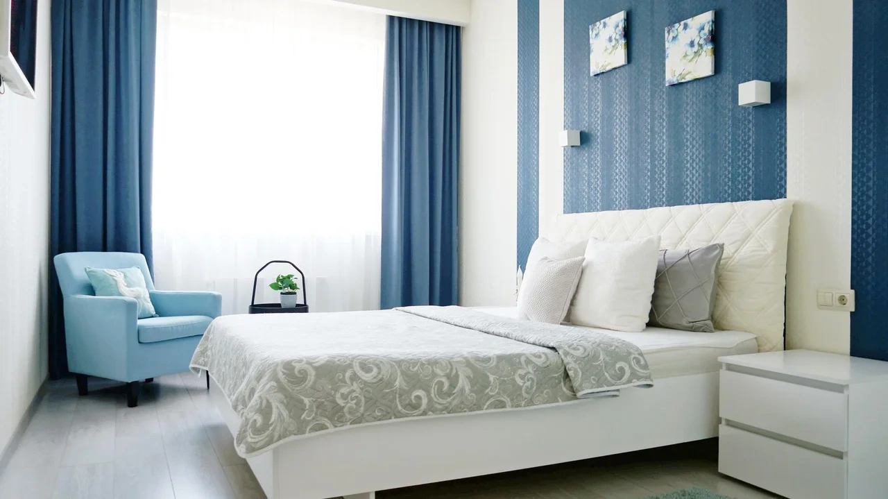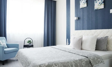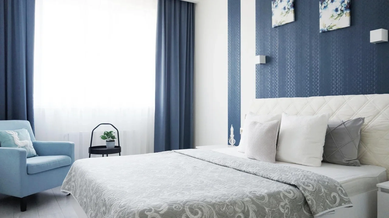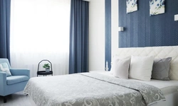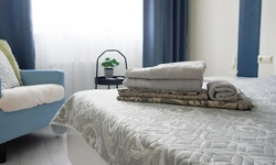 В комнате большая кровать с ортопедическим матрасом, телевизор, шкаф, кресло для отдыха, столик. Кондиционер.