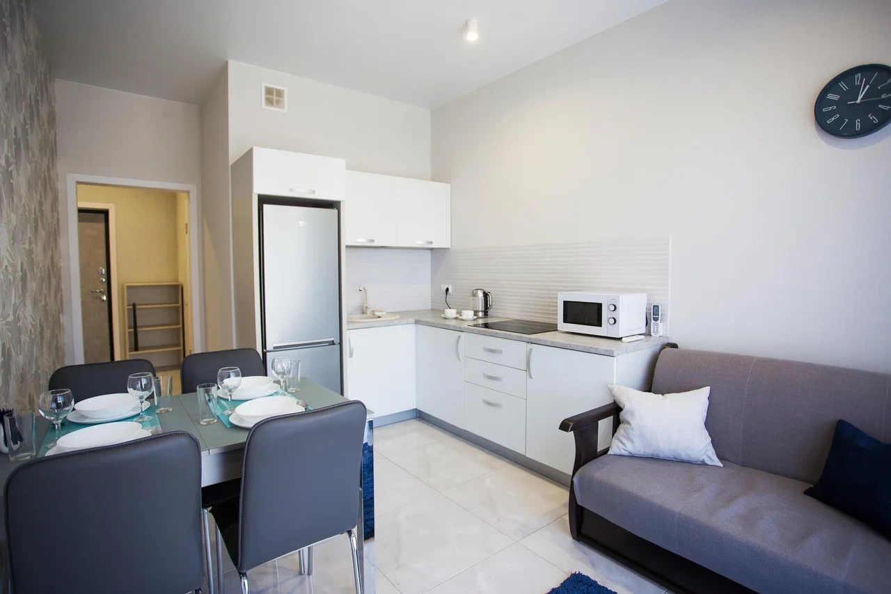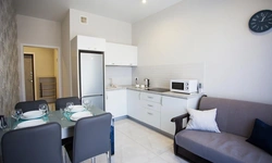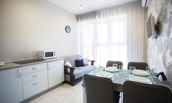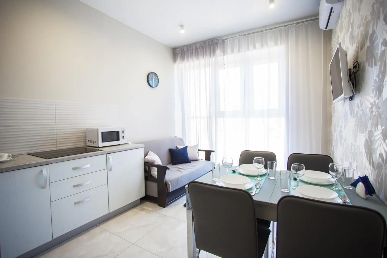 Кухня со всем необходимым для приготовления пищи (плита, микроволновая печь, чайник, холодильник, посуда и прочее). Удобный диван (раскладывается, двуспальный). Кондиционер.