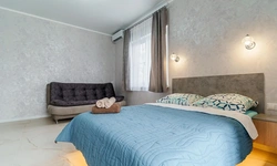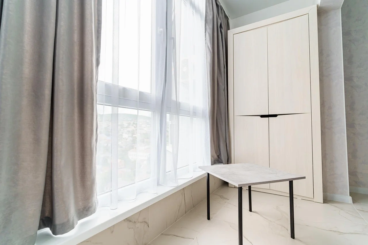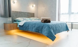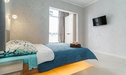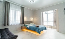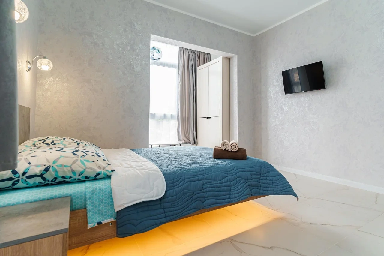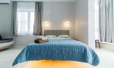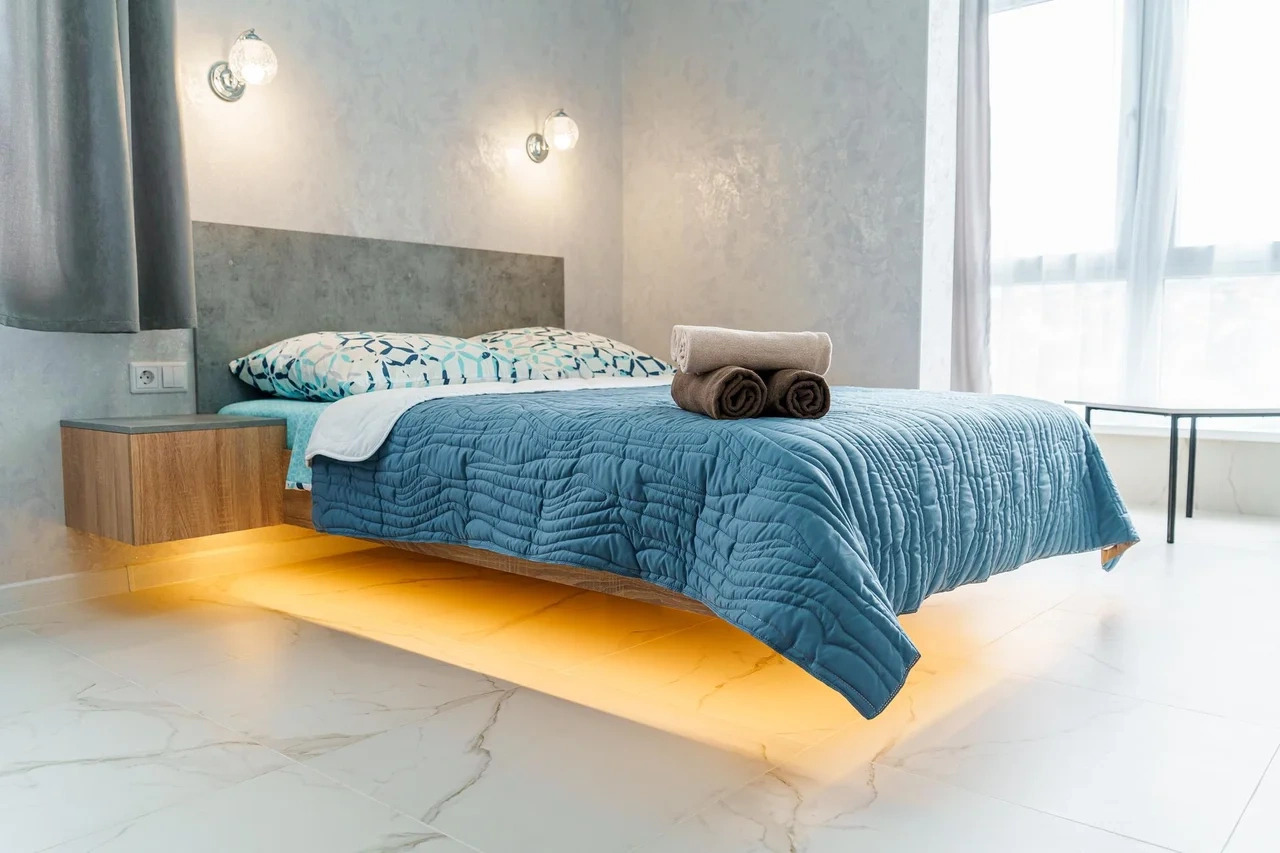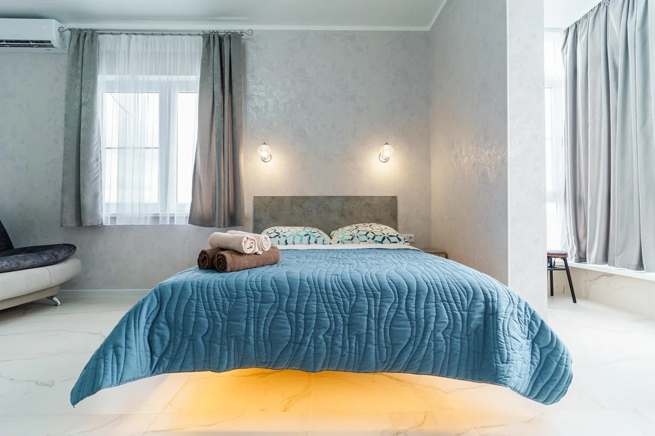 Просторные комнаты, в спальне парящая кровать.