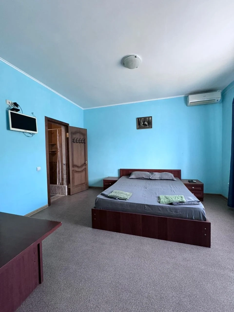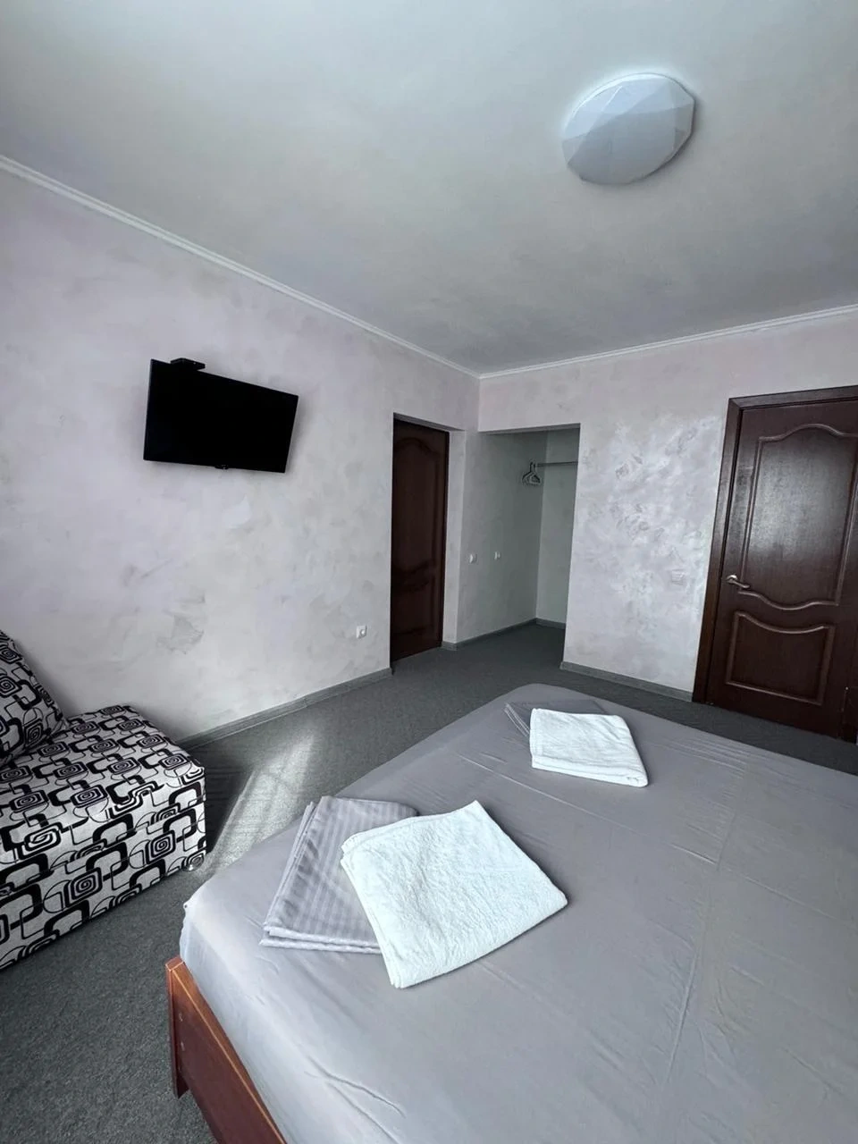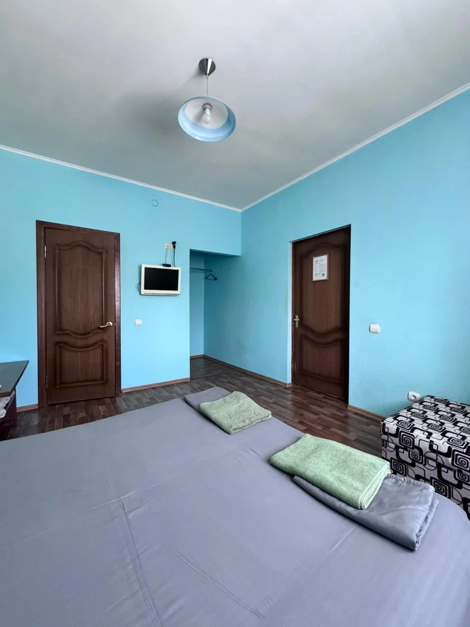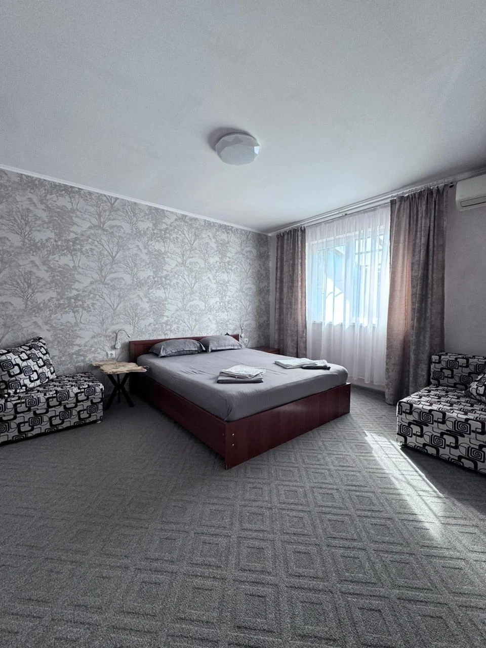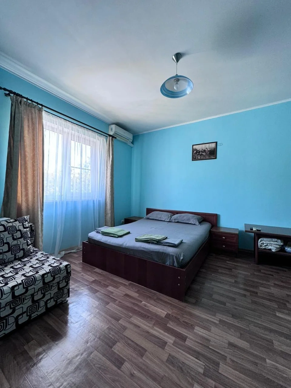 У нас в гостевом доме предлагается двухместный номер с двухспальной кроватью. В дополнение к этому, в номере имеется 2 кресло-кровати для дополнительного размещения гостей. В номере также есть кондиционер, холодильник, телевизор и Wi-Fi для вашего комфорта и развлечения. Ванная комната оснащена душем, туалетом и раковиной, а также в номере есть кондиционер, чтобы обеспечить свежесть в жаркую погоду. На территории нашего гостевого дома есть бесплатная парковка для удобства наших гостей, а также мангальная зона, где вы можете приготовить шашлык и насладиться вкусом на открытом воздухе. Остановка общественного транспорта, аптека и супермаркет находятся всего в 150 метрах от гостевого дома, что делает ваше пребывание у нас еще более удобным. Мы будем рады приветствовать вас в нашем гостевом доме и сделать ваше пребывание здесь приятным и комфортным.