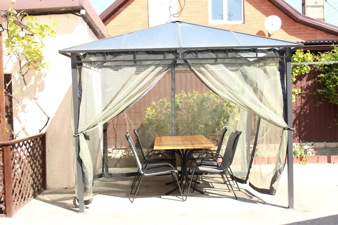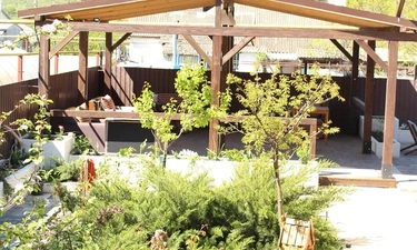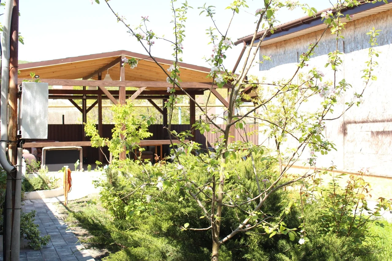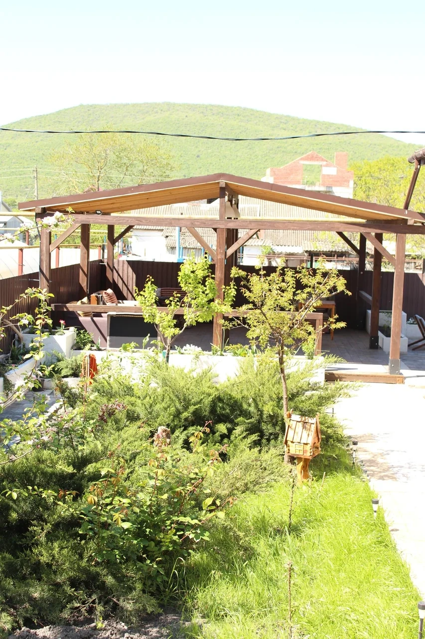 На заднем дворе располагается терраса, отдельно стоящая беседка с цветущими клумбами по краям, так же есть крытый мангал, где в непогоду можно пожарить шашлык.