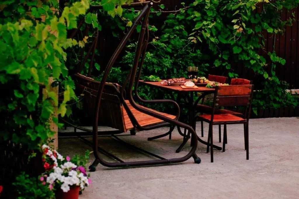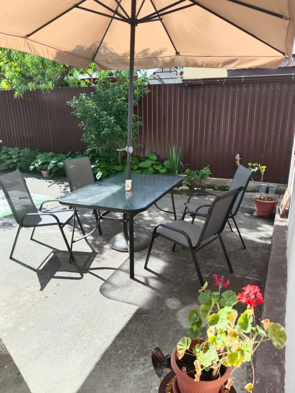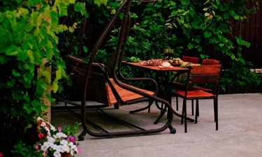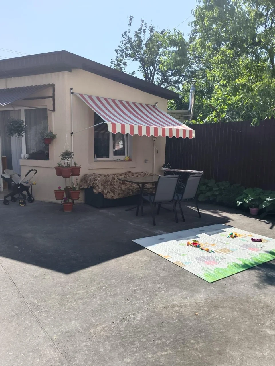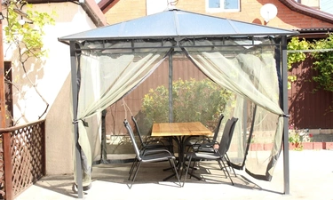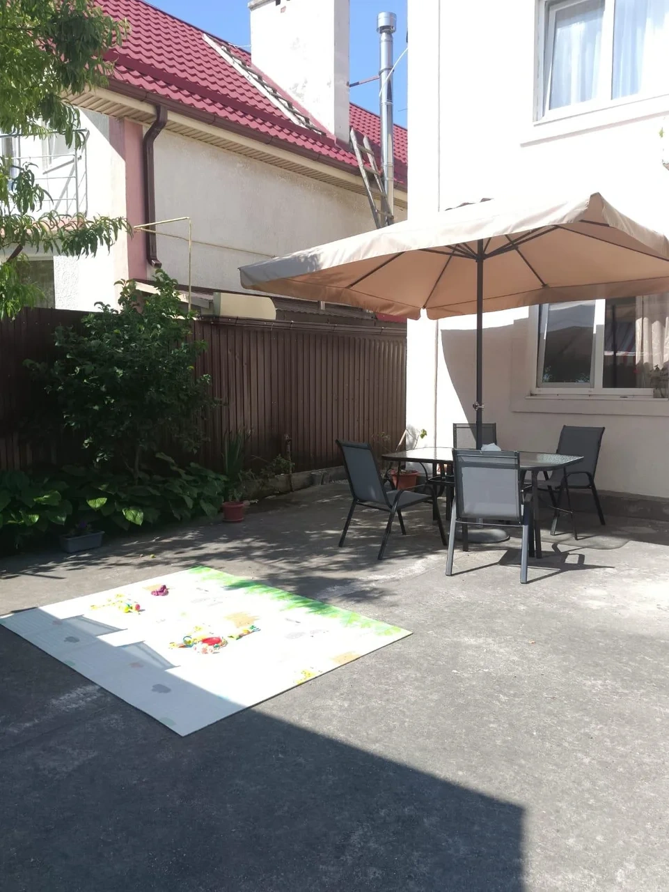 На заднем дворе располагается терраса, отдельно стоящая беседка с цветущими клумбами по краям, так же есть крытый мангал, где в непогоду можно пожарить шашлык.