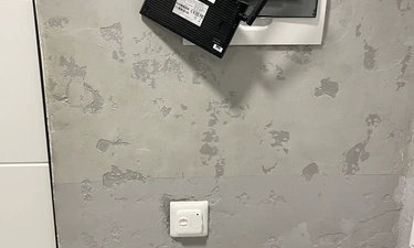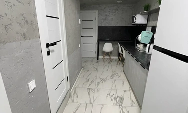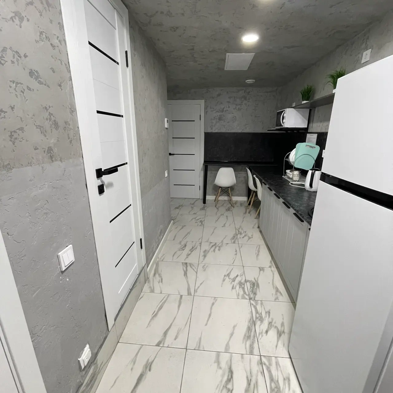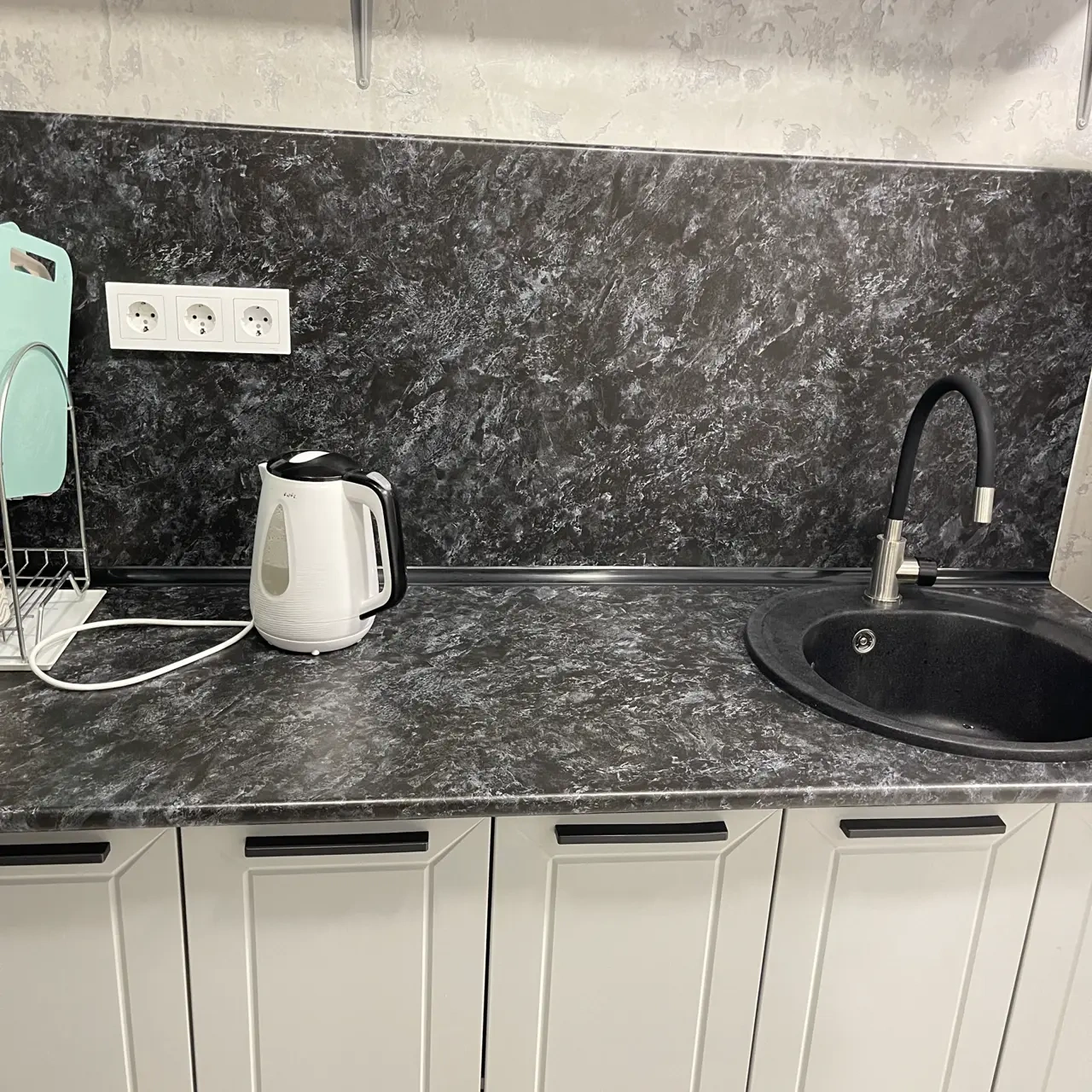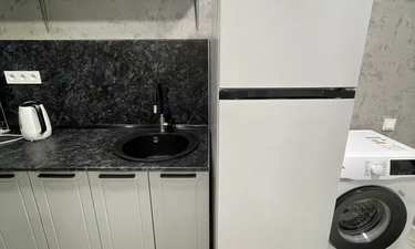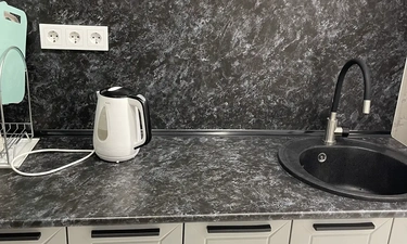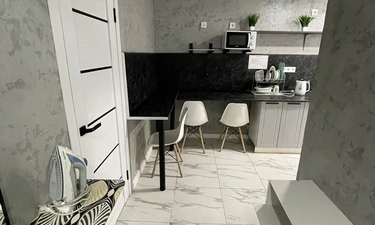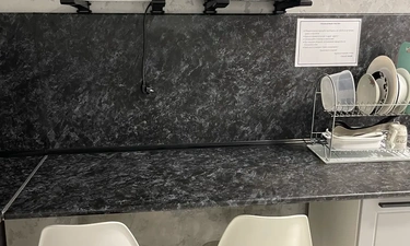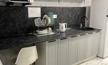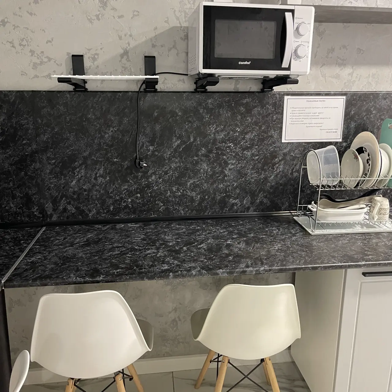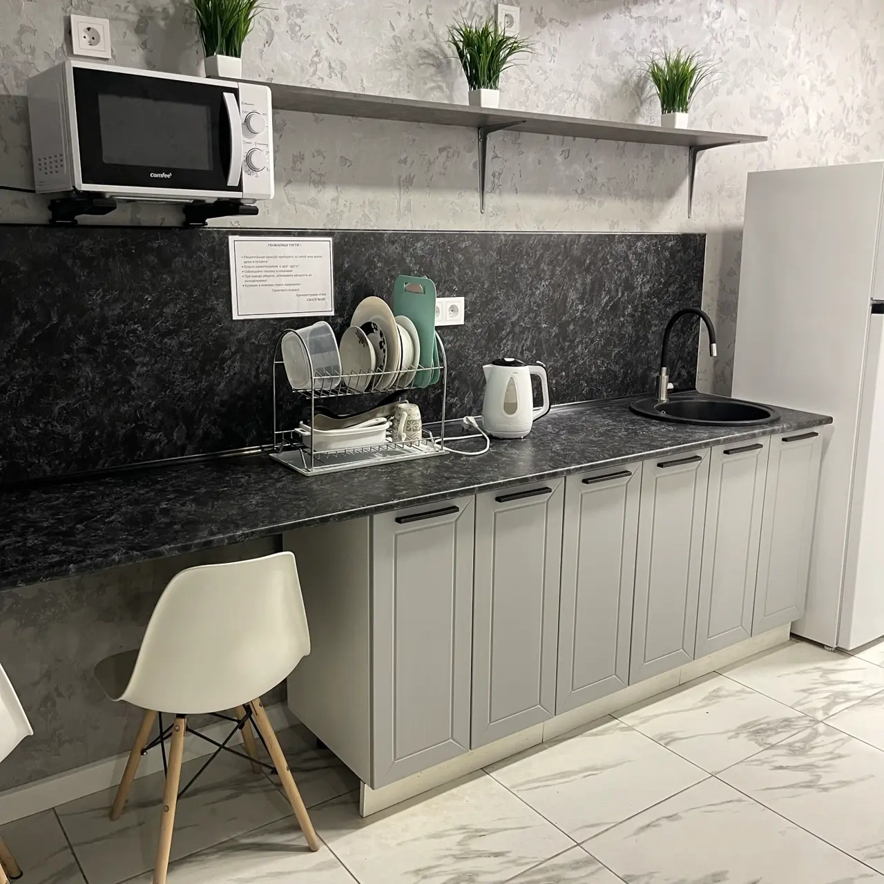 Кухонная зона состоит из микроволновой печи, посуды, мультиварки, фильтра для воды, холодильника
