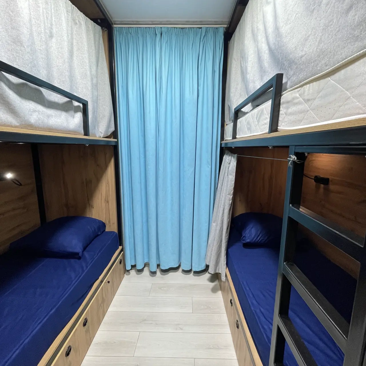 Каждая капсула оснащена - чистым постельным бельем, подушкой, одеялом, светильником, розеткой, крючком для одежды