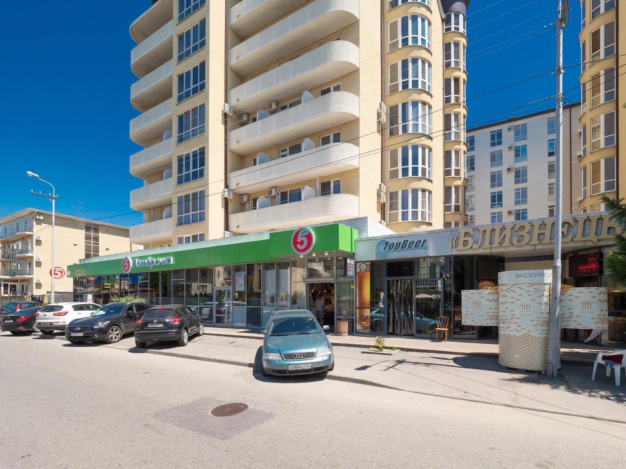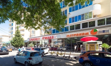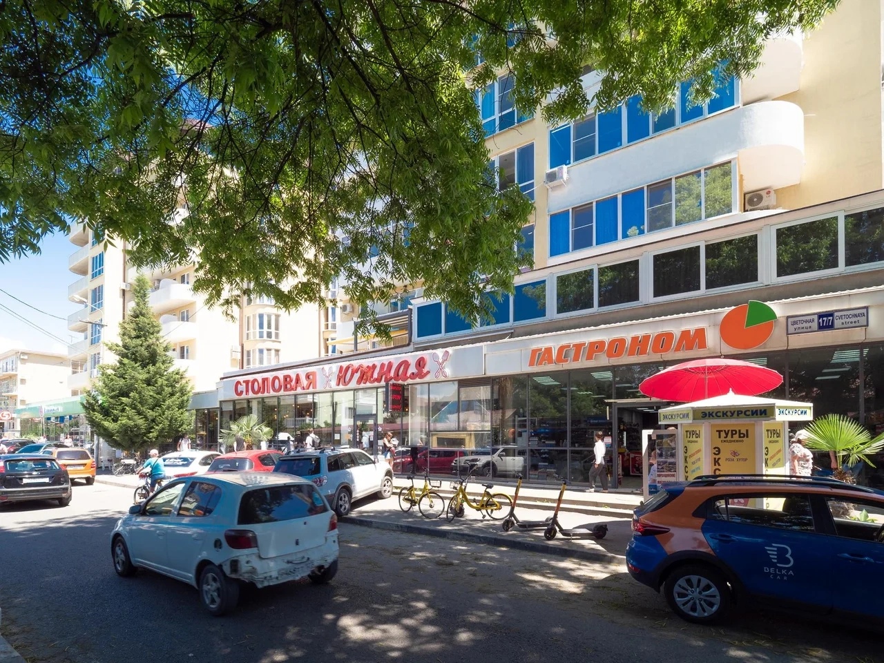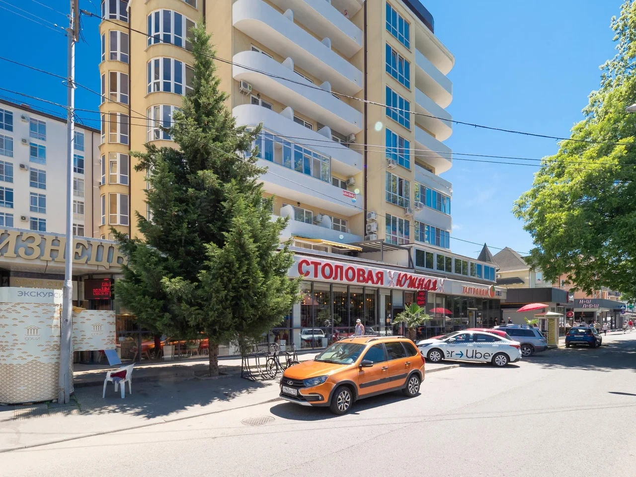 Рядом много магазинов: Магнит, Пятерочка, столовая Южная, мнoжecтво кaфe и pecтopанов.