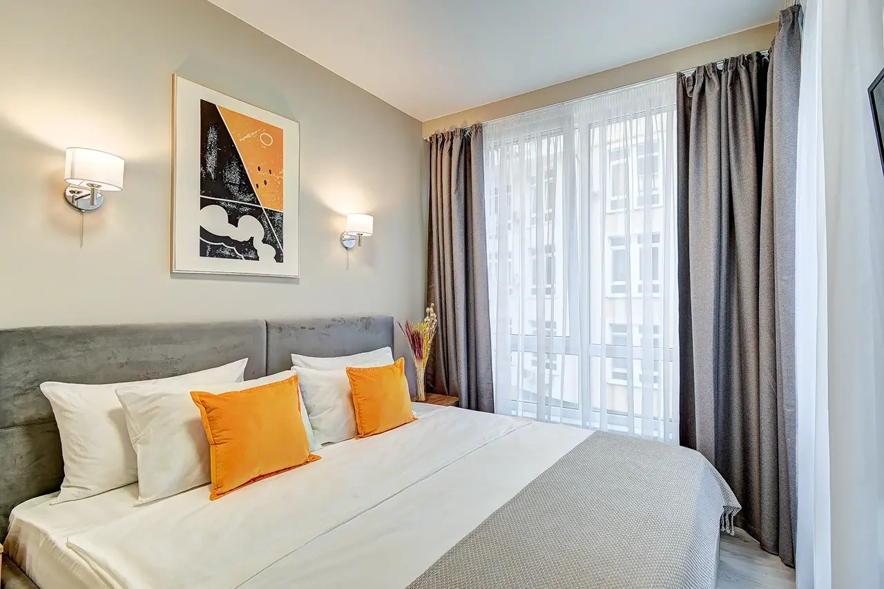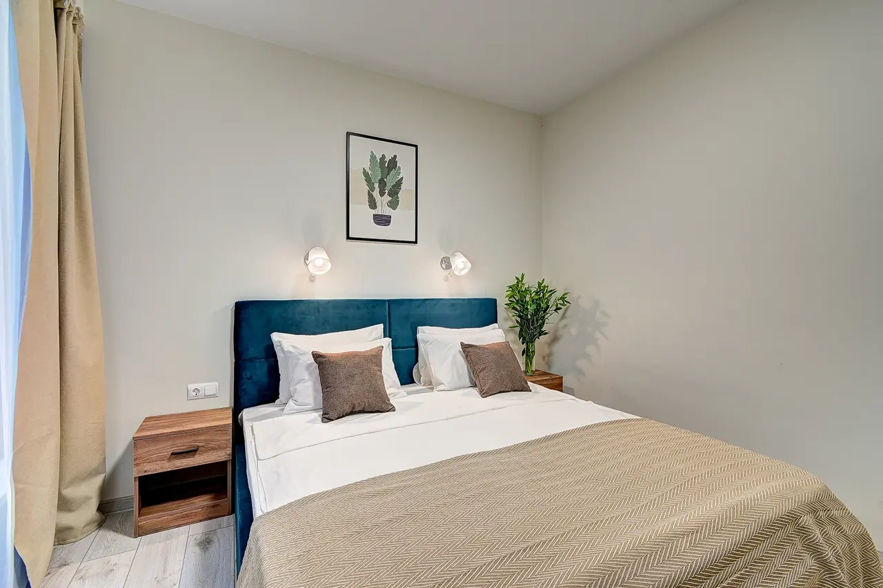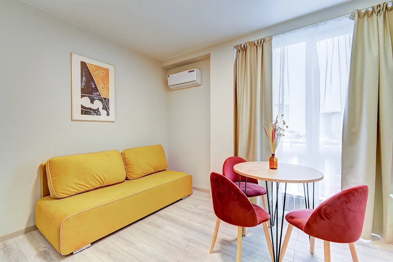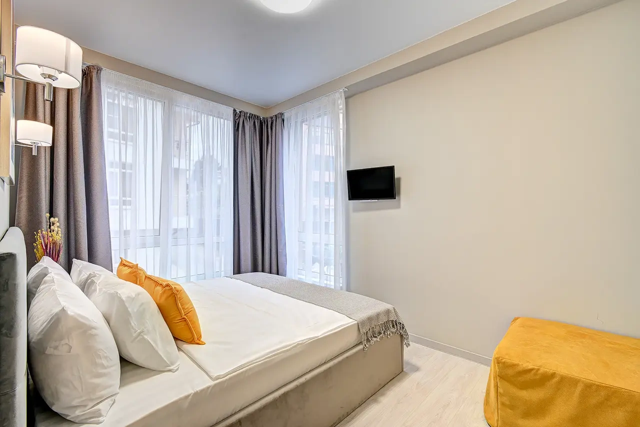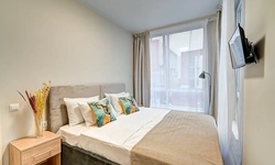 Уютные апартаменты для размещения одного, двух, трех или четырех гостей 34 кв.м. Возможно дополнительное пятое место. В номере: одна двуспальная кровать с ортопедическим матрасом, диван, качественное постельное белье, удобные подушки и одеяла. Прикроватные тумбочки, шкаф, ТВ, холодильник, посуда, кондиционер. Кухня, полностью укомплектованная. Санузел оснащен душем и всем необходимым. Косметические принадлежности, набор полотенец
