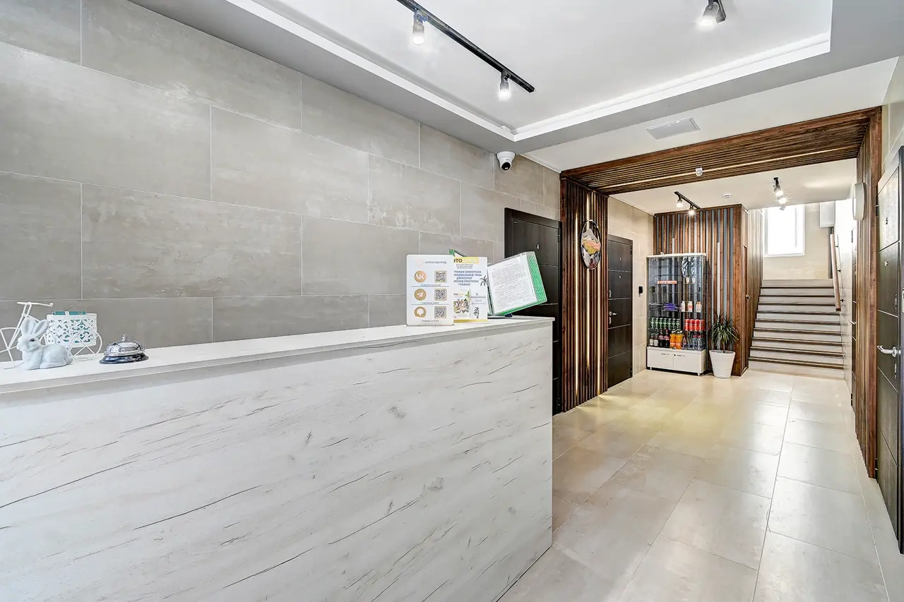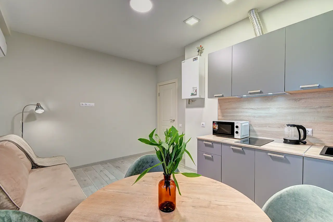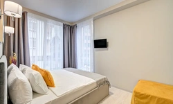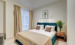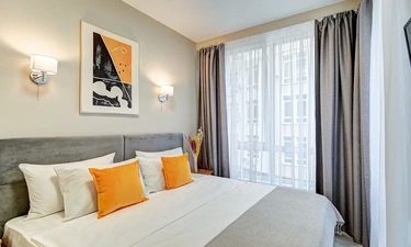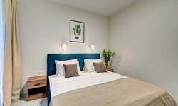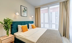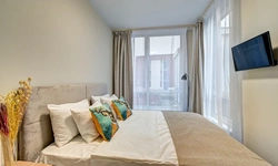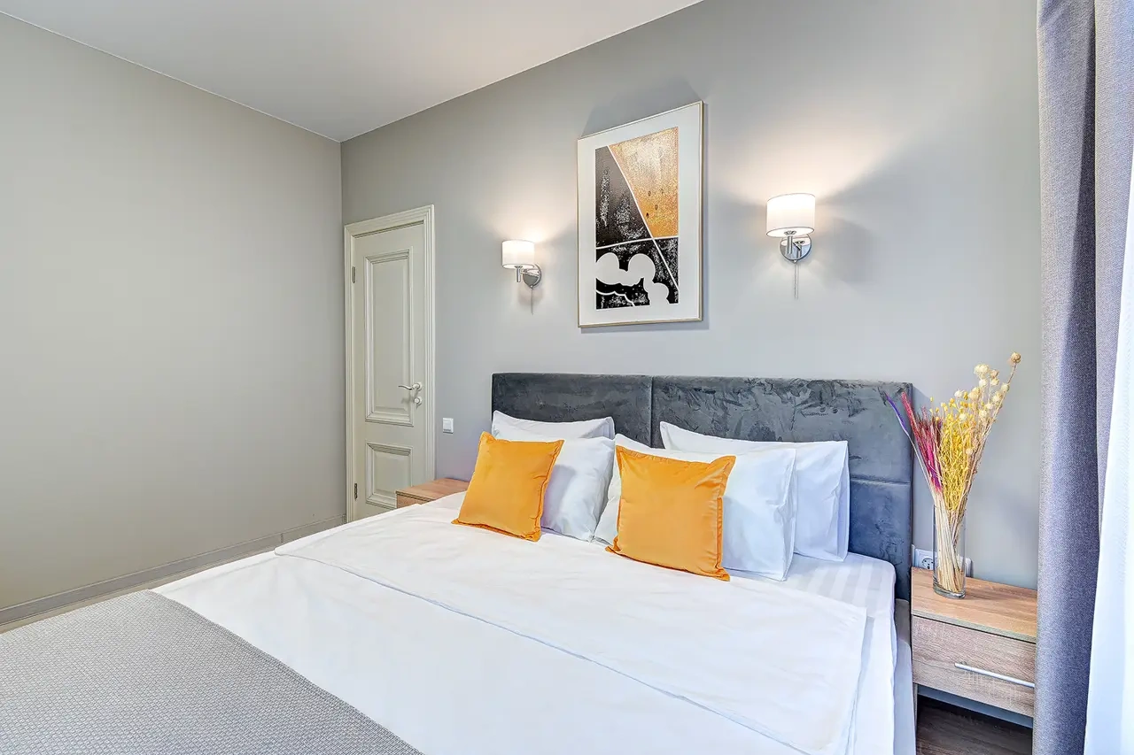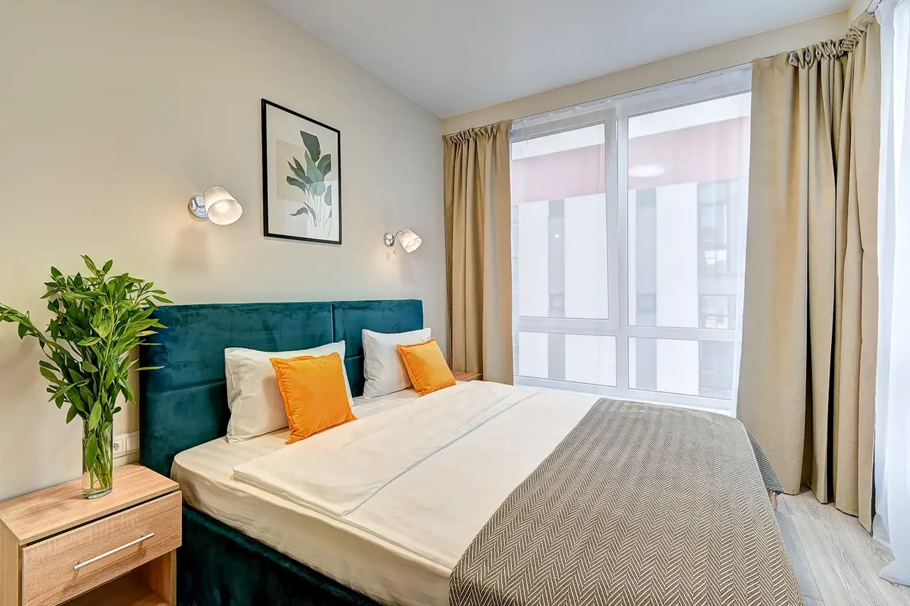 Уютные апартаменты для размещения одного, двух, трех или четырех гостей 34 кв.м. Возможно дополнительное пятое место. В номере: одна двуспальная кровать с ортопедическим матрасом, диван, качественное постельное белье, удобные подушки и одеяла. Прикроватные тумбочки, шкаф, ТВ, холодильник, посуда, кондиционер. Кухня, полностью укомплектованная. Санузел оснащен душем и всем необходимым. Косметические принадлежности, набор полотенец