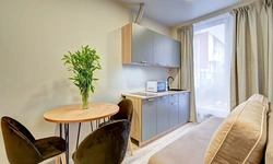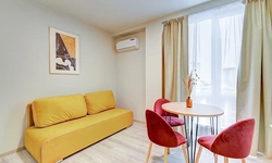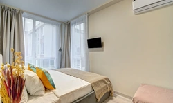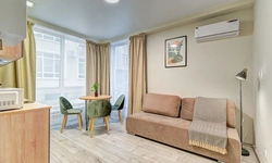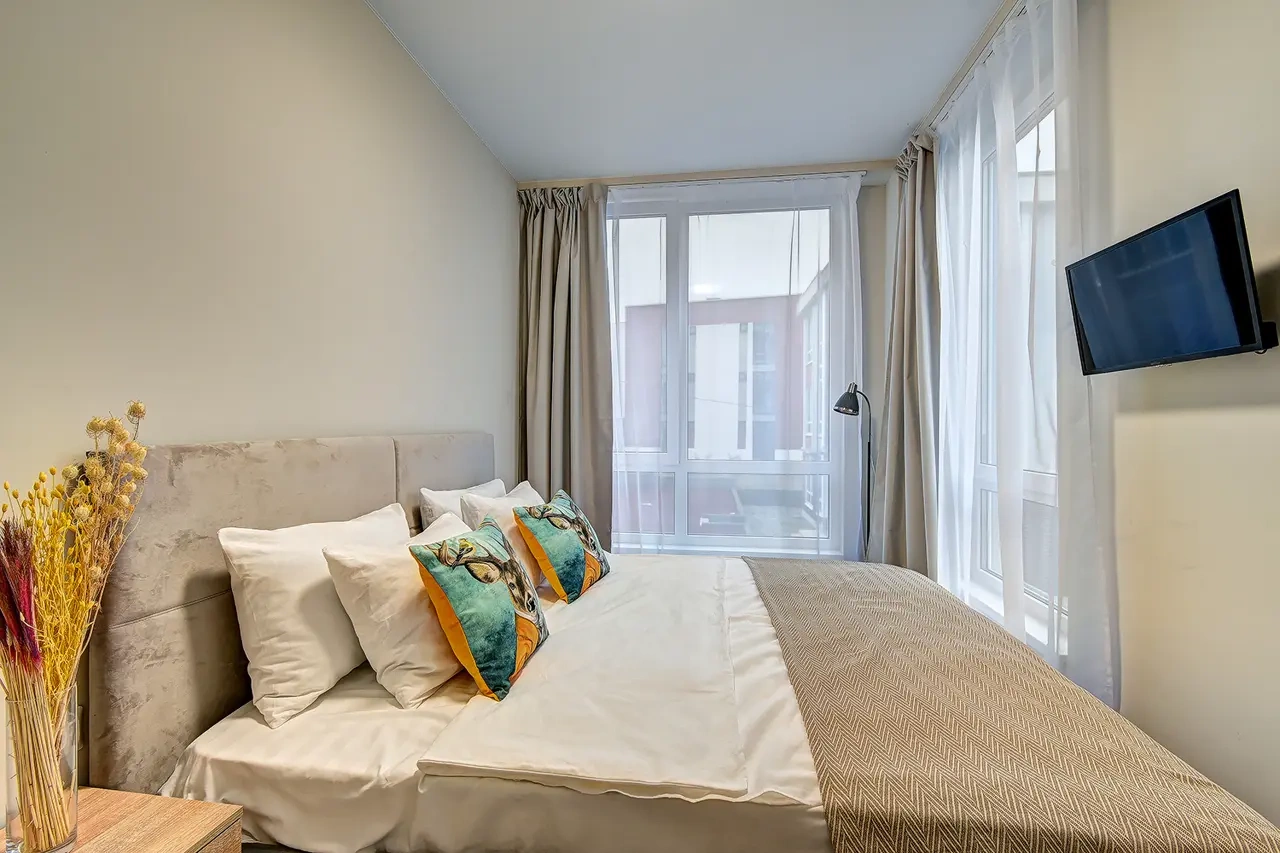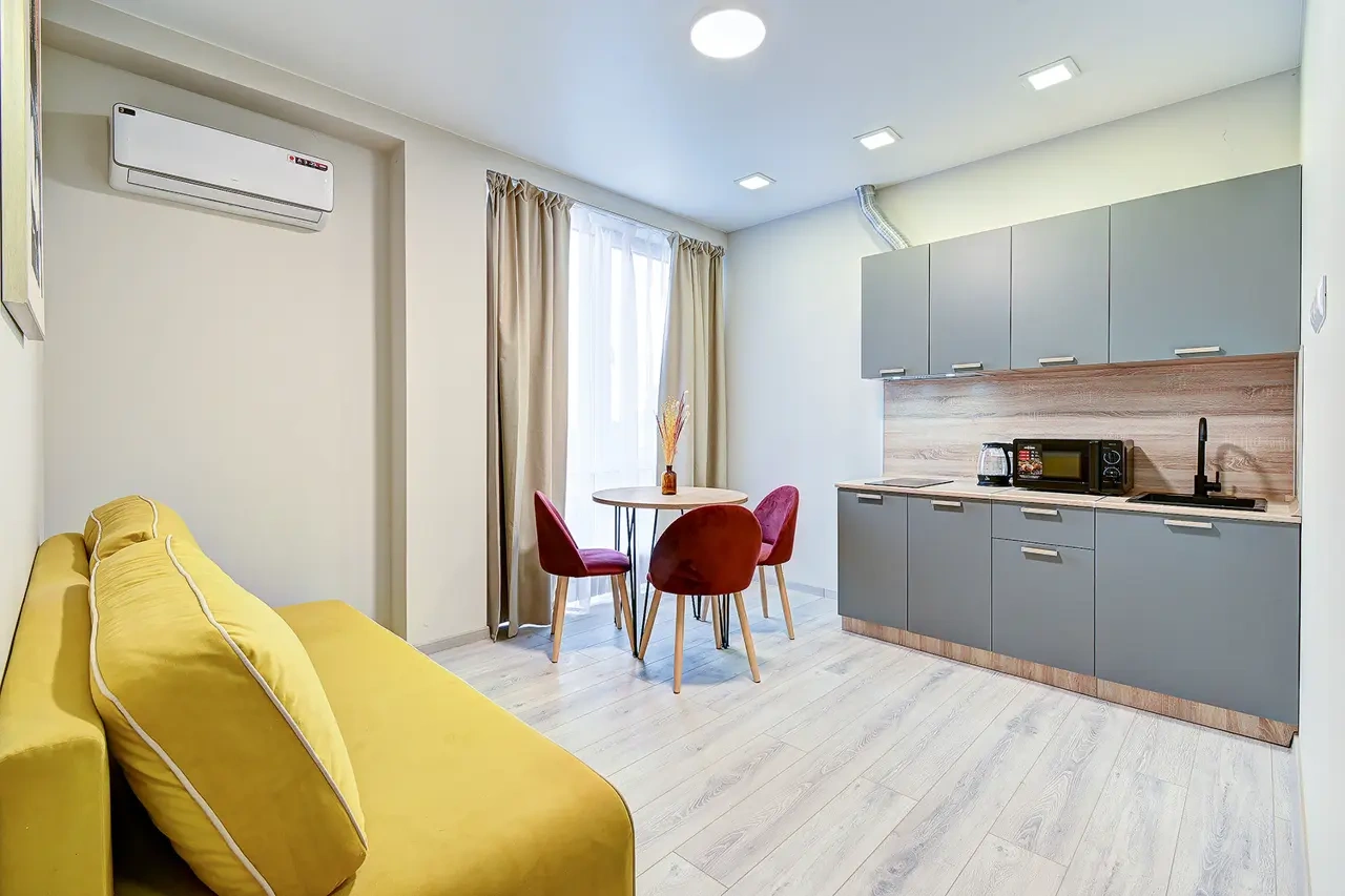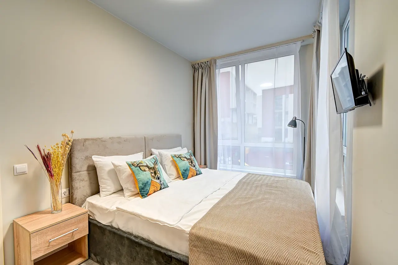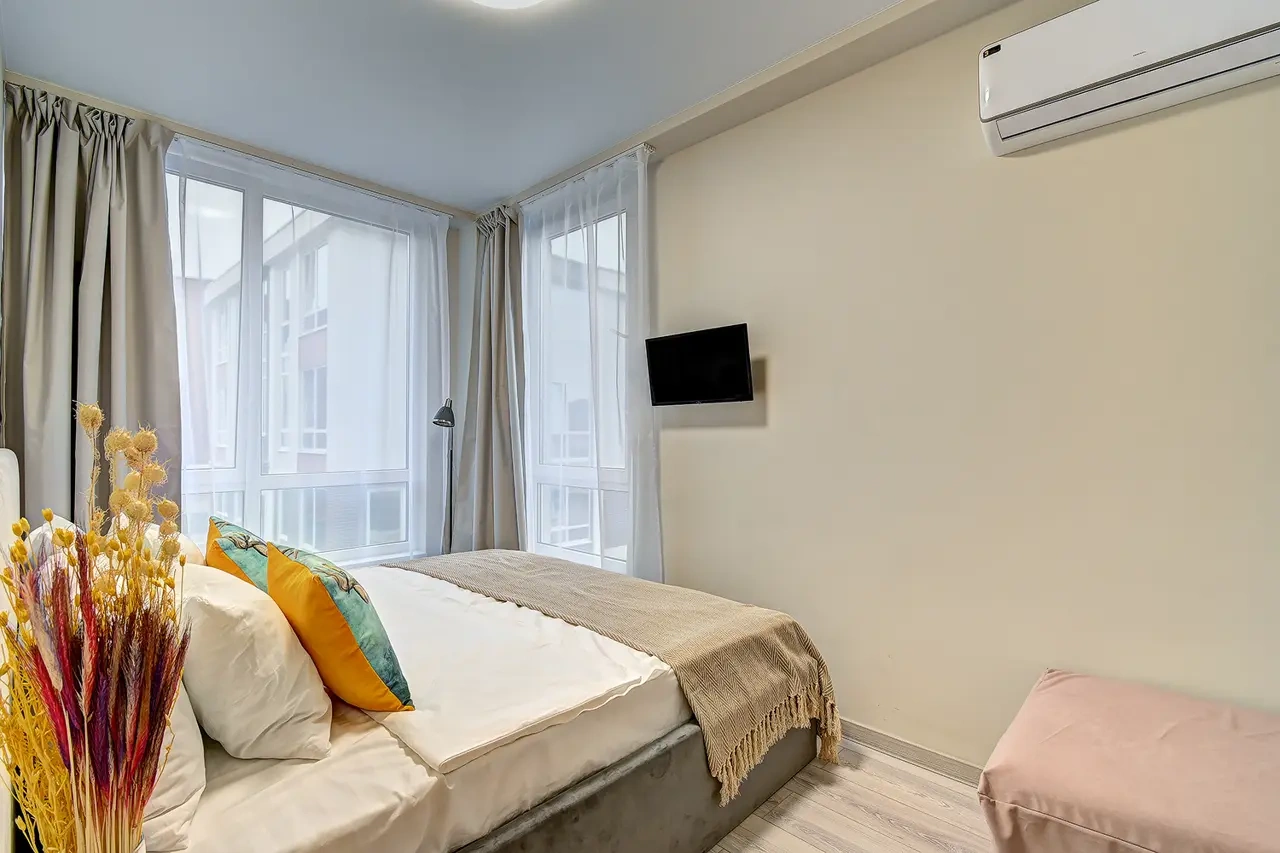 Уютные апартаменты для размещения одного, двух или трех гостей 28 кв.м. В номере: одна двуспальная кровать с ортопедическим матрасом, раскладывающийся пуф (доп место), качественное постельное белье, удобные подушки и одеяла. Прикроватные тумбочки, шкаф, ТВ, холодильник, посуда, кондиционер. Кухня, полностью укомплектованная. Санузел оснащен душем и всем необходимым. Косметические принадлежности, набор полотенец.