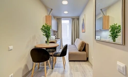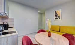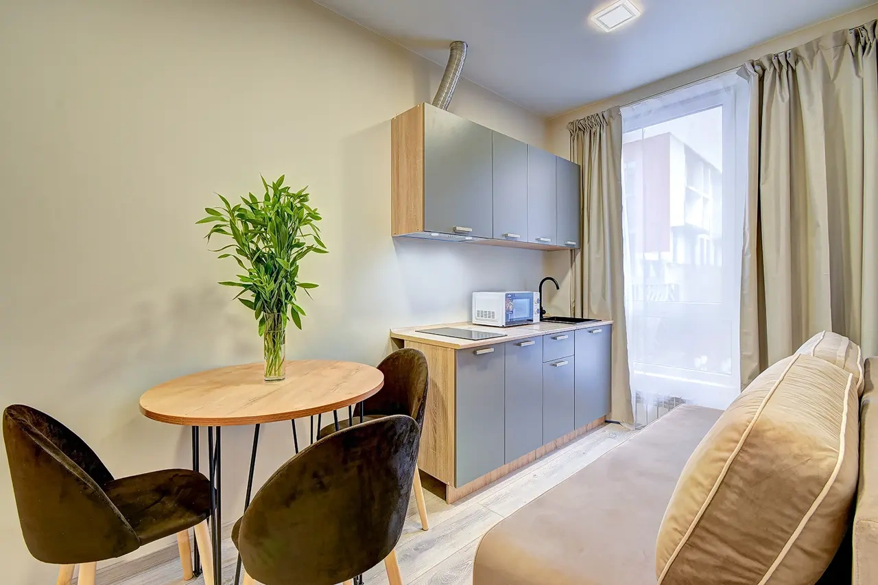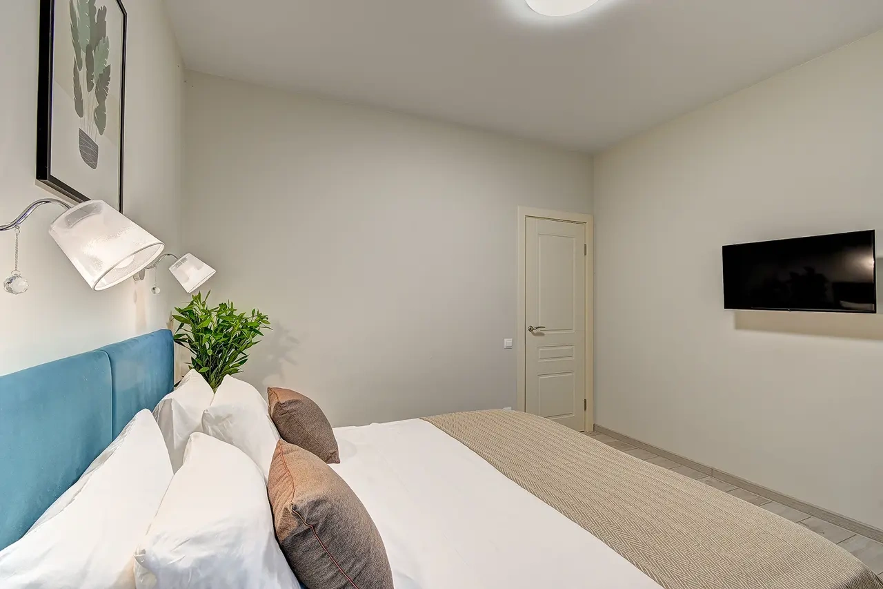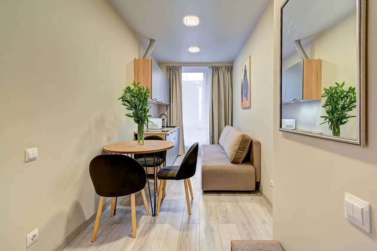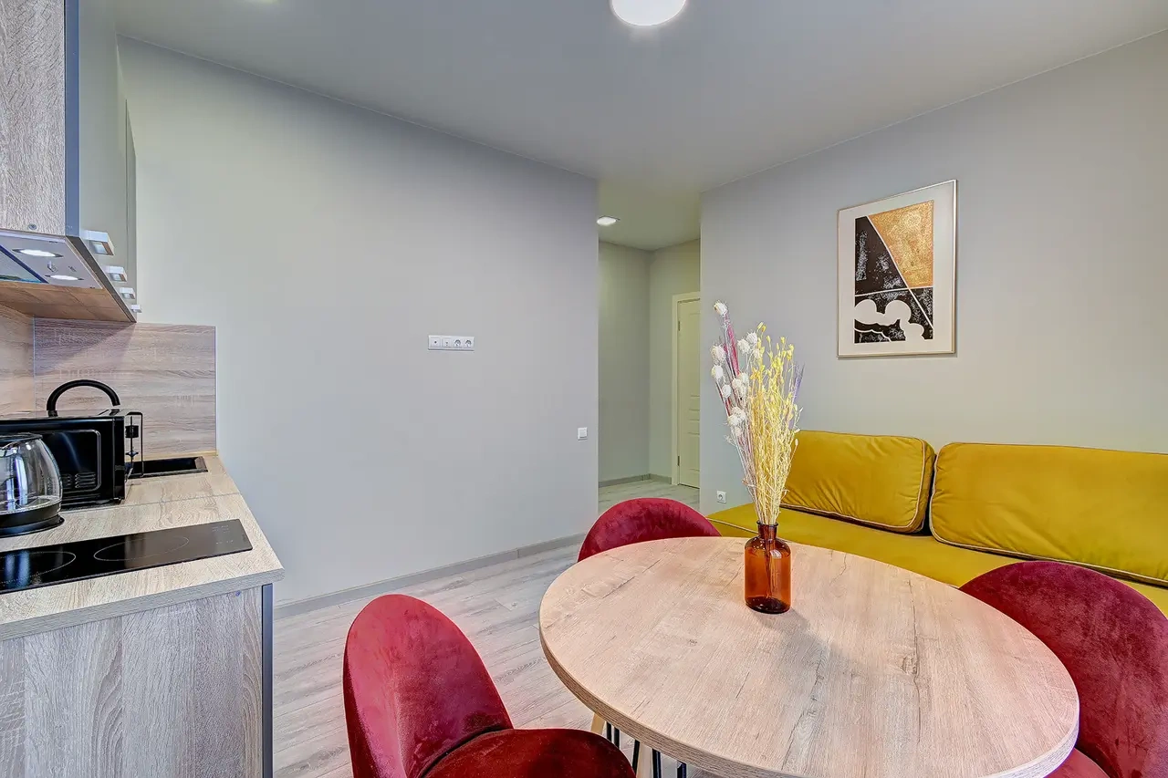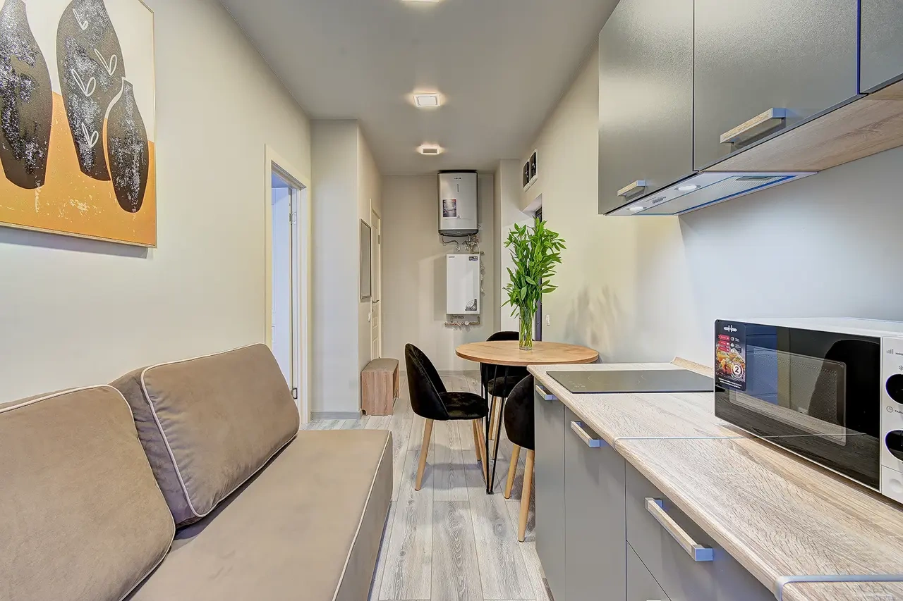 Уютные апартаменты для размещения одного, двух или трех гостей 28 кв.м. В номере: одна двуспальная кровать с ортопедическим матрасом, раскладывающийся пуф (доп место), качественное постельное белье, удобные подушки и одеяла. Прикроватные тумбочки, шкаф, ТВ, холодильник, посуда, кондиционер. Кухня, полностью укомплектованная. Санузел оснащен душем и всем необходимым. Косметические принадлежности, набор полотенец.