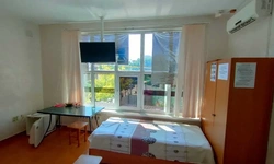 В номер 2-местный стандарт входит телевизор, холодильник, две кровати, шкаф, журнальный стол, стулья, санузел, балкон (санузел на балконе), вентилятор