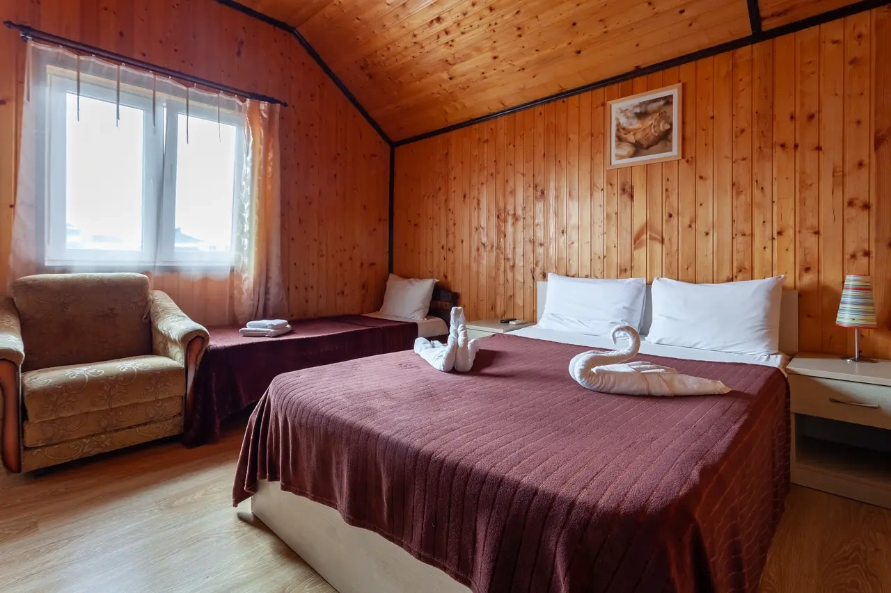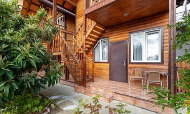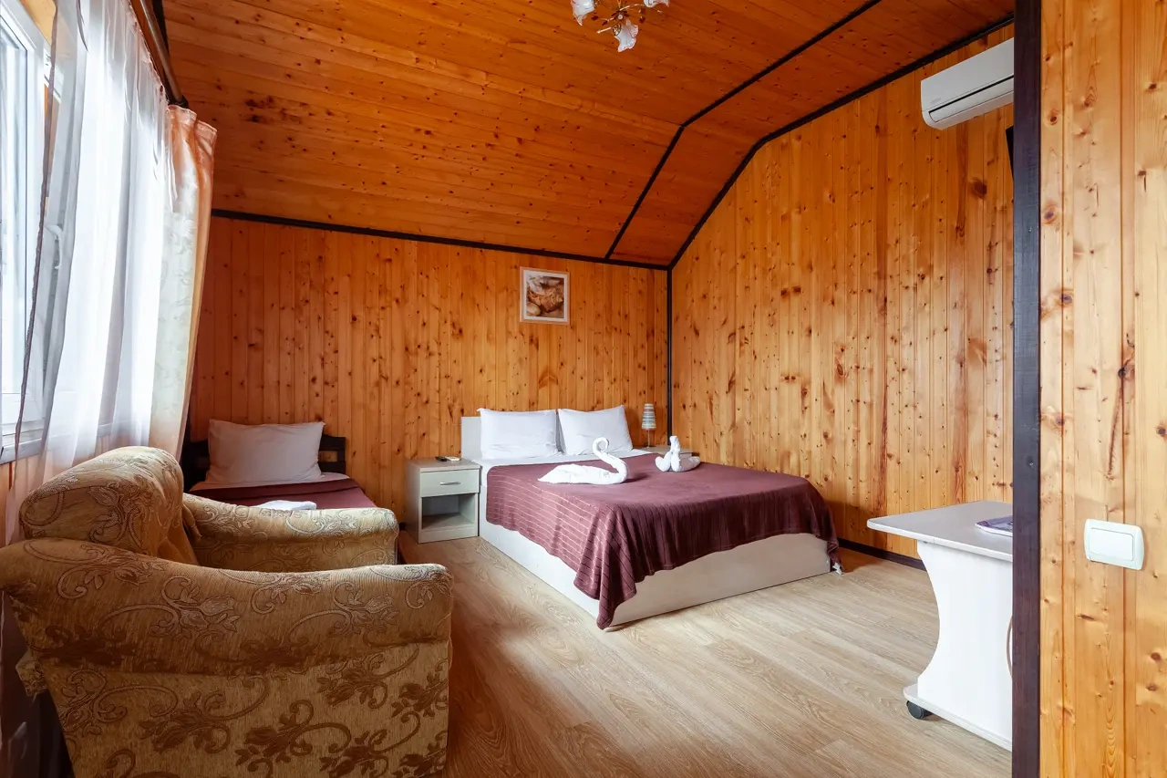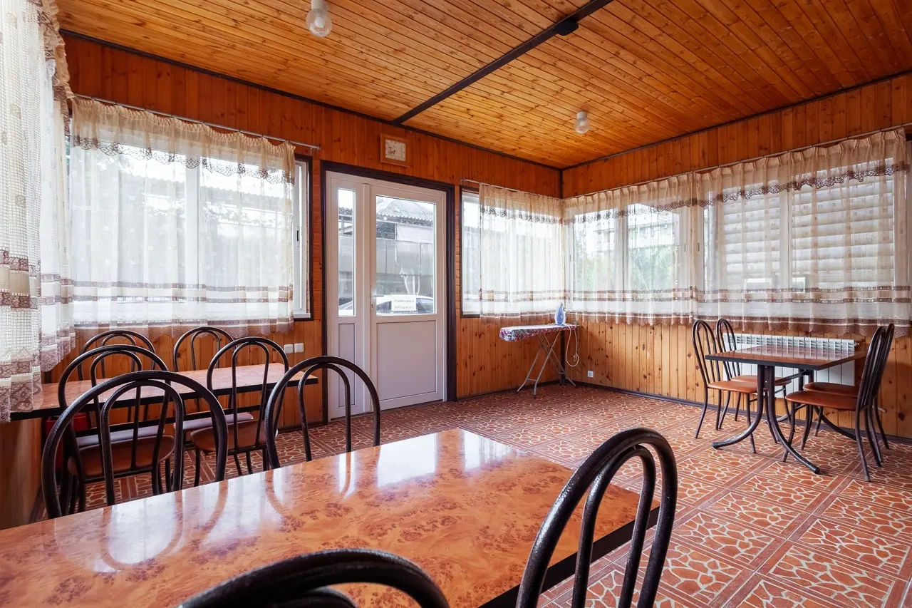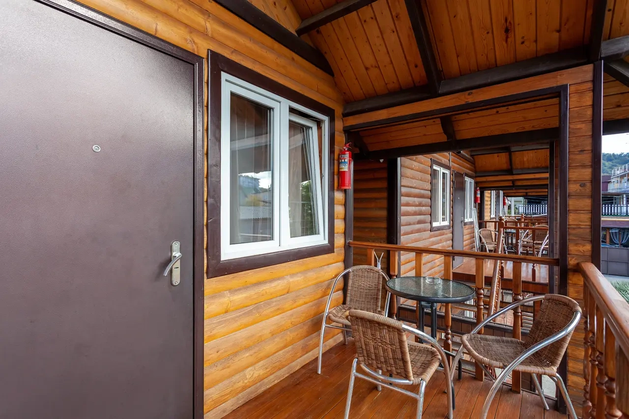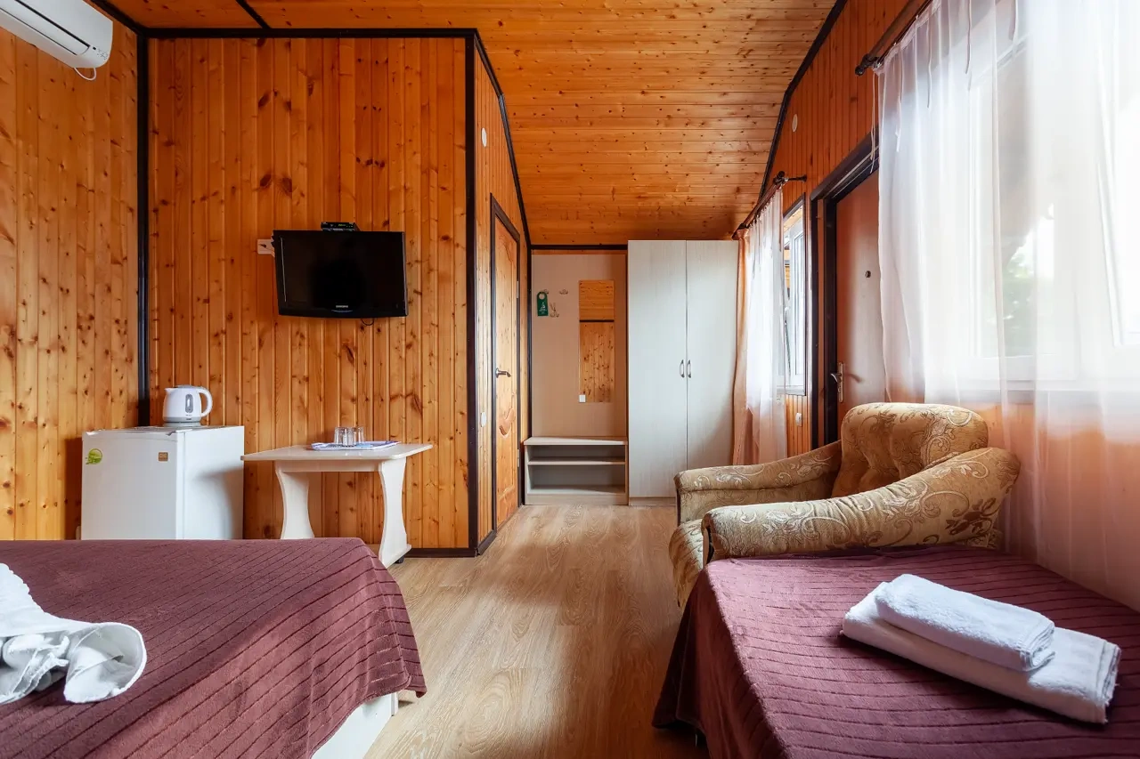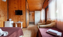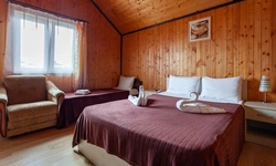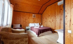 На территории находятся 4 деревянных домика (номера полностью отделаны деревом) и 3х этажное блочное здание .