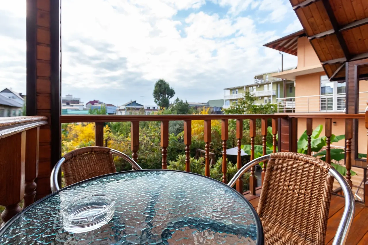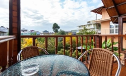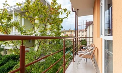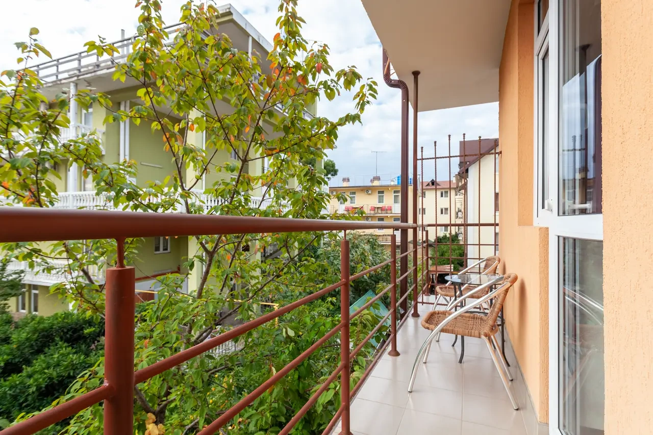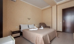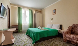 Двух комнатный номер состоящий из полностью изолированной спальни и второй комнаты которая представляет собой гостиную с полностью оборудованной кухней и сан.узел . Номер находится на втором этаже . балкон по периметру всего номера с которого открывается вид на сад и море. В спальне 2-спальная кровать и кресло-кровать в гостиной диван кровать и кресло кровать. В кухне микроволновка холодильник электрическая варочная плита. эл чайник вся необходимая посуда . В сан. узле фен. мыло. шампунь. гель для душа .тапочки. полотенца .халат.
