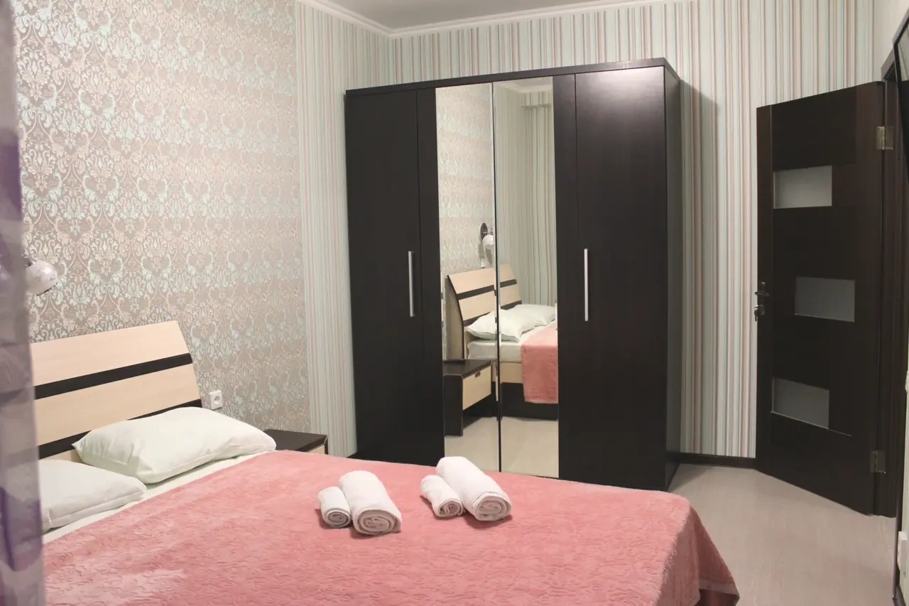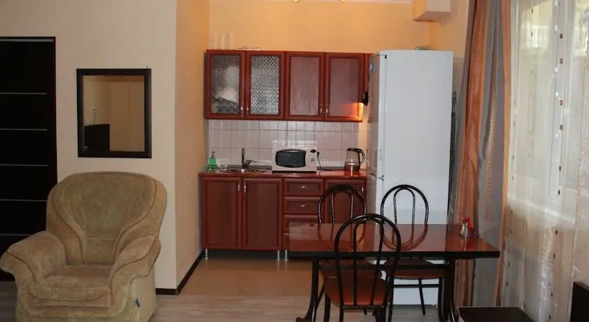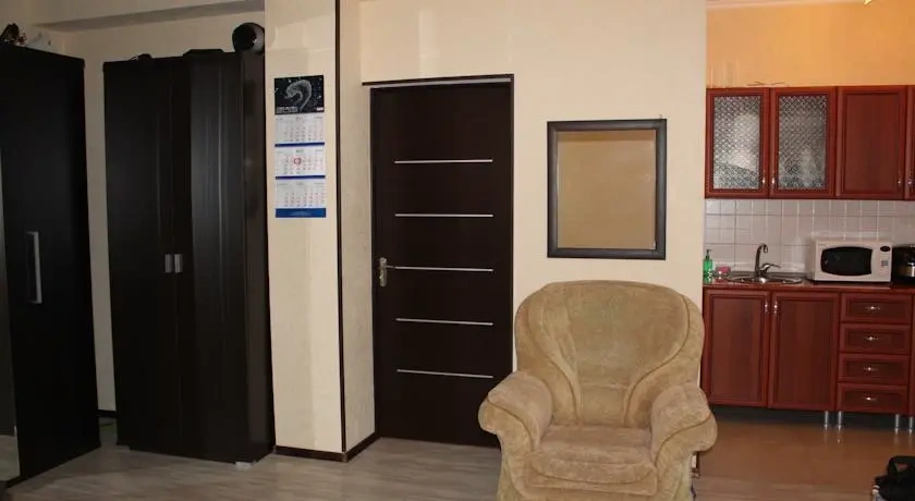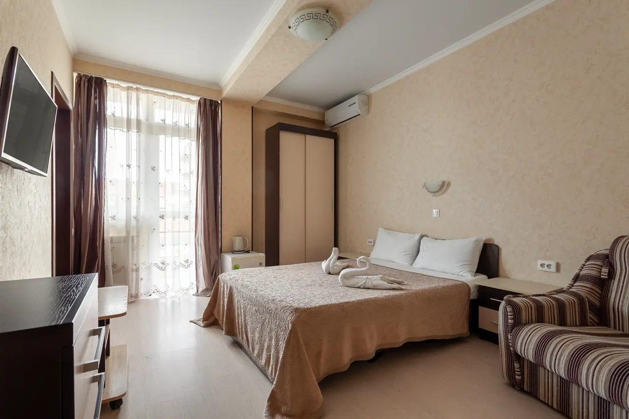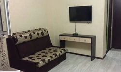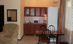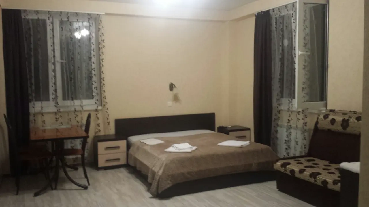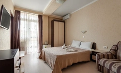 Номер студио представляет собой однокомнатный номер с собственной кухней . площадь номера 30 кв метр . Кухня полностью оборудована холодильником эл варочной поверхностью. микроволновкой. эл. чайником. столовыми приборами и посудой для приготовления пищи.В номере широкая 2-спальная кровать,односпальная кровать и диван кровать. сан узел (фен мыло. шампунь. гель для душа. тапочки. полотенца. и.т.д) Номер находится на первом высоком этаже балкона нет.