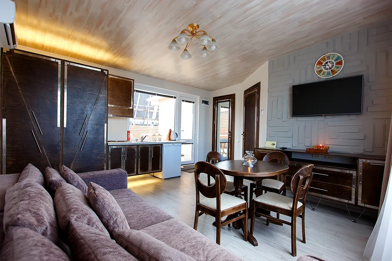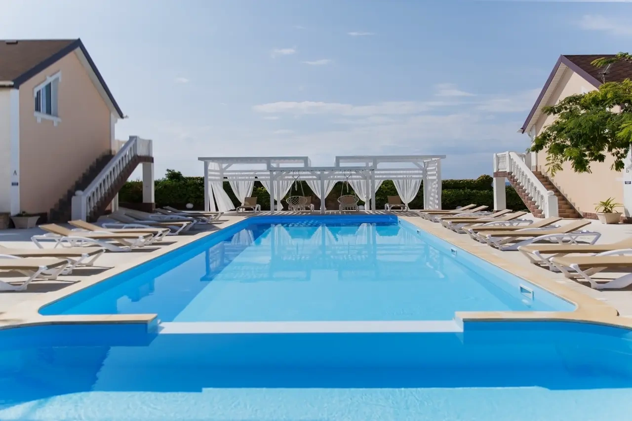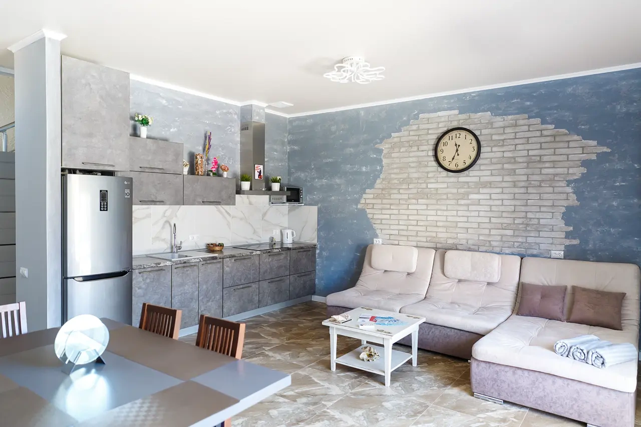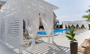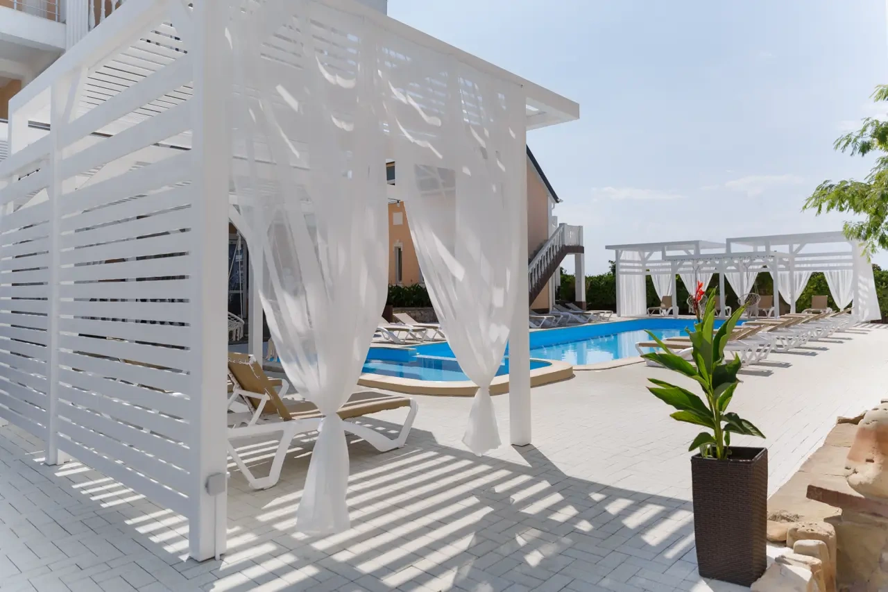 Отель у моря в Севастополе. Наш отель расположен в Севастополе в знаменитой бухте Казачья по соседству с музеем 35-я Батарея. Парк Победы и Бухта Омега 10км. Комплекс расположен на скале с видом на открытое море с террас апартаментов. Каждый апартамент имеет свою террасу на этаже. У Нас вы увидите не стандартное решение пляжного отдыха. На пляж ведут ступеньки прямо в скале, пляж оборудован ровной площадкой для отдыха и Wi Fi. Вас будут окружать только не большое количество наших гостей, море и скалы. В 2-ух км. есть ресторан и галечный пляж "Голубая бухта" с арендой каяков и SUP бордов. Для вас 12 апартаментов с кухней от 2х до 6ти человек, Лофт на крыше у бассейна и отдельный коттедж на 8+ человек. Детская площадка с горкой, качелями и батутом. Лаунж зоны у бассейна 20м. на солнечной и теневой стороне. Большая общая беседка с мангалом на 16 человек и 2 мангала у семейных корпусов. Бассейн на крыше. Аренда зала для конференций и мероприятий с караоке. Русская баня. Парковка и набережная для прогулок с Вашими питомцами.