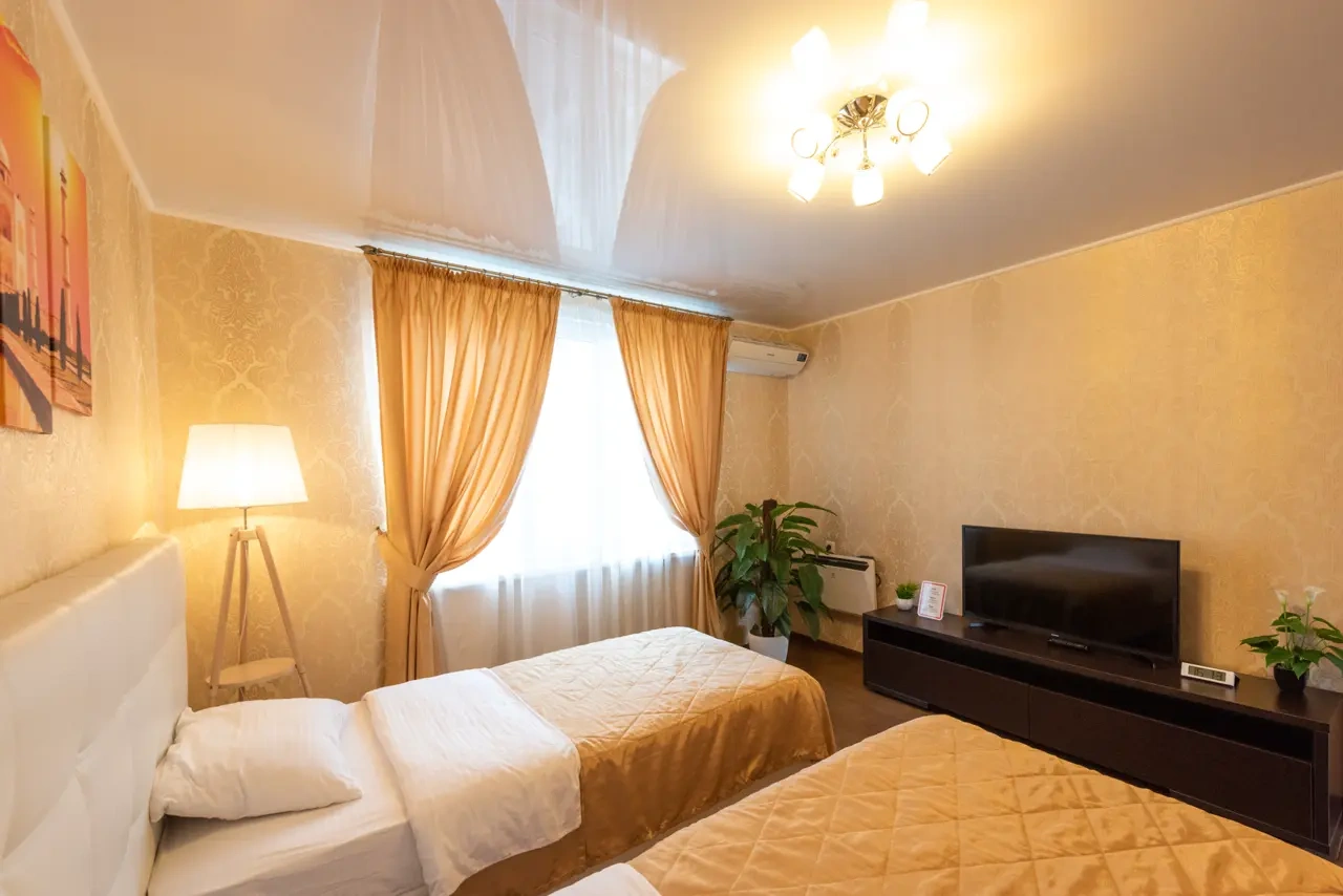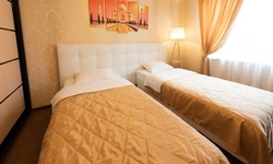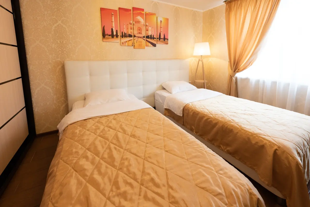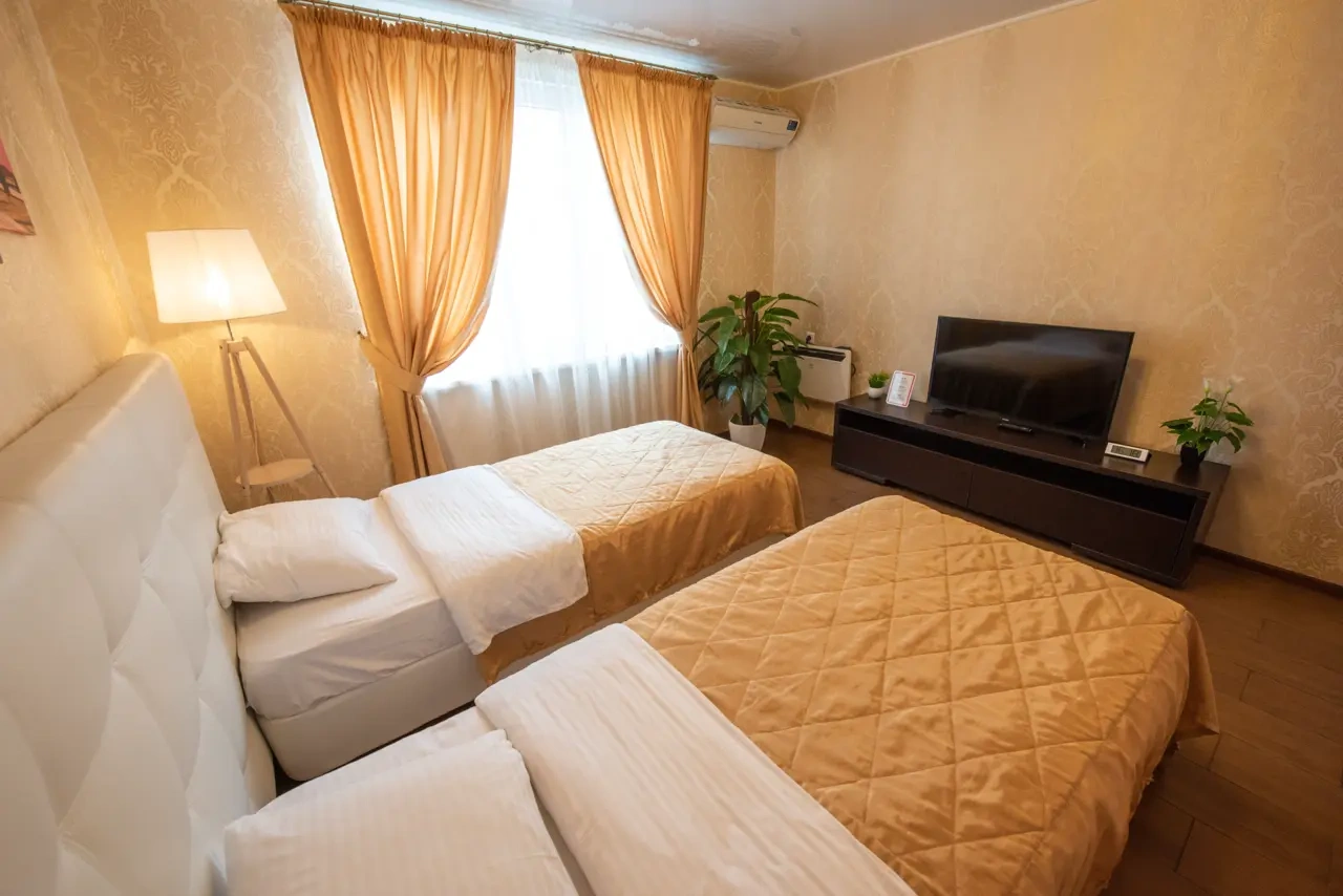 Комфортный просторный номер с двумя односпальными кроватями, состоящий из спальни, собственной кухни и ванной. В номере большой телевизор, кондиционер, сейф, стиральная машина, плита, холодильник, много посуды и есть даже кофемашина. Две односпальные кровати при необходимости сдвигаются в одну большую, также имеется дополнительная раскладная кровать с матрасом для одного ребёнка или взрослого. Идеально подходит для двух взрослых и одного ребёнка.