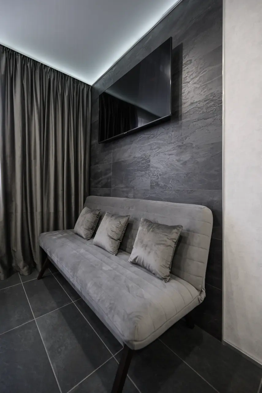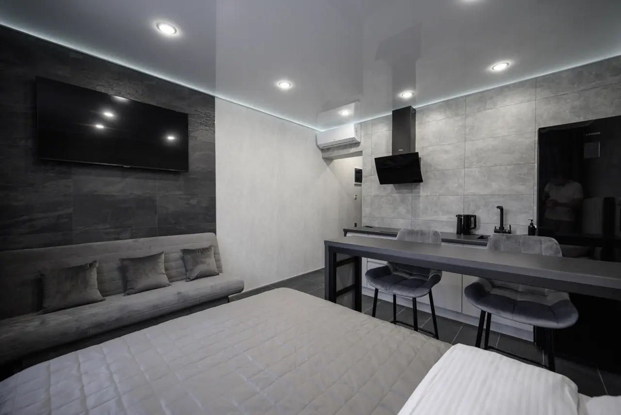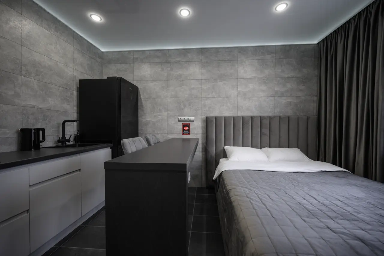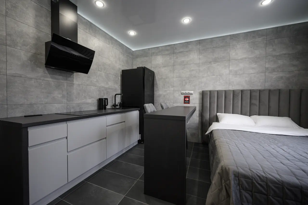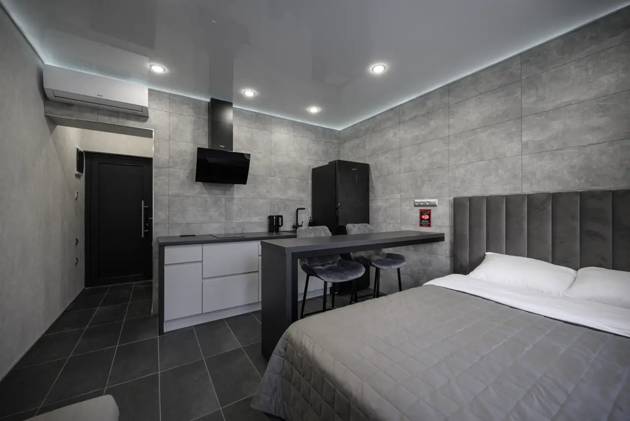 Номер с повышенной комфортностью с одной двуспальной кроватью, большей площади состоящий из спальни, собственной кухни и ванной. В номере большой телевизор, кондиционер, сейф, стиральная машина, плита, холодильник, много посуды и есть даже кофемашина. Двуспальная кровать с удобным ортопедическим матрасом, также имеется дополнительная раскладная кровать с матрасом для одного ребёнка или взрослого. Идеально подходит для семейной пары и одного ребёнка.
