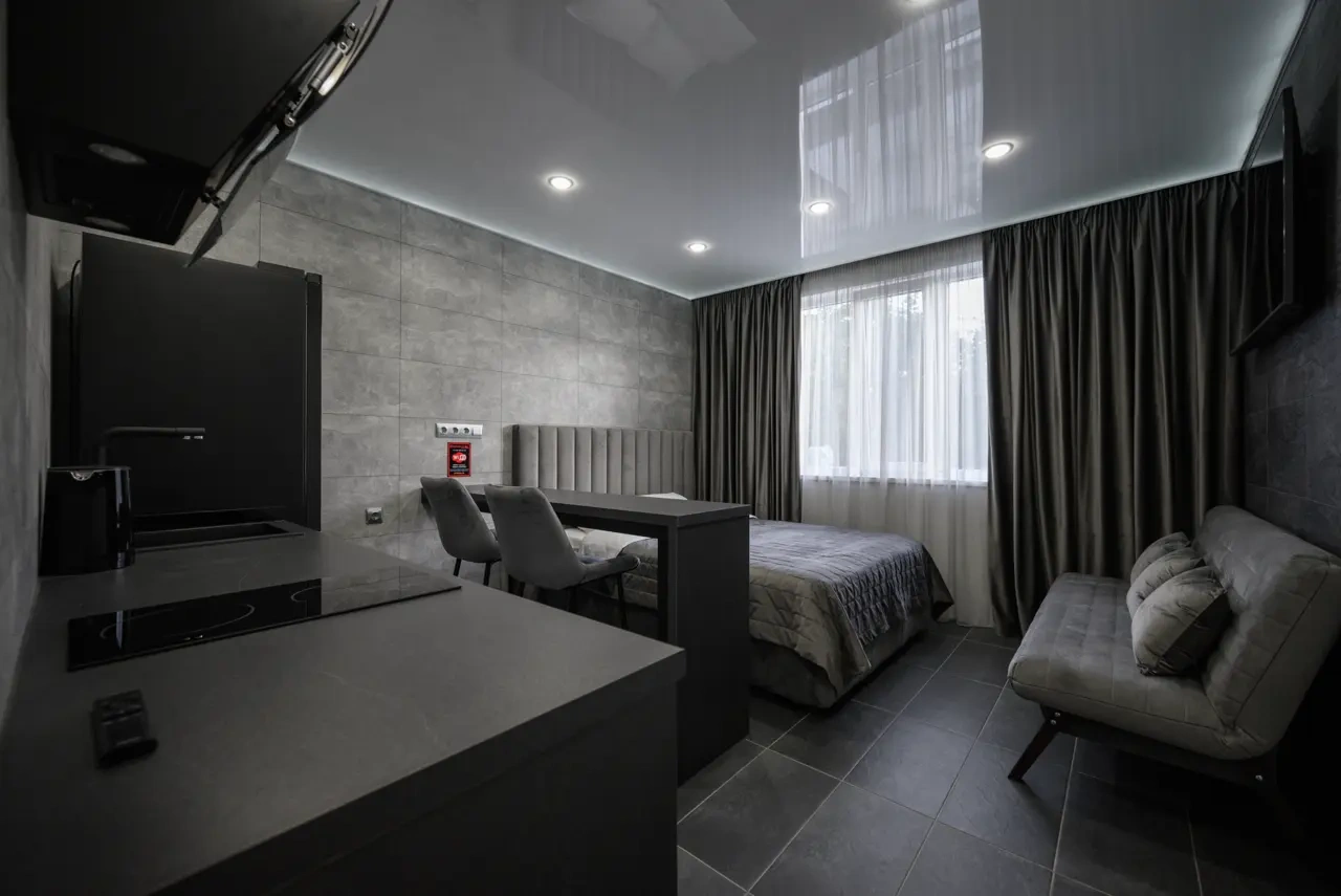 Номера категории "комфорт" с одной двуспальной кроватью и диваном спроектированы специально для гостей с НАИВЫСШИМИ требованиями с самой современной мебелью и техникой. Перед нами стояла задача чтобы гости себя чувствовали КОМФОРТНО как у себя дома или даже лучше. При строительстве данных номеров мы учли все требования современного времени: большие смарт телевизоры с поддержкой онлайн-видео, высокоскоростной бесшовный интернет, отопление с тёплым полом, супер комфортный матрас «1000 пружин» с вентиляцией внутренних слоёв гарантировано оставит приятное самочувствие после сна. Идеально подходит для семейной пары и одного ребёнка как на короткий срок так и на длительный - полный набор посуды от вилок ложек до различных кастрюлек и сковородок. Для номеров данной категории предусмотрена своя личная отдельная парковка для машин у входа в данный корпус. В шаговой доступности в радиусе 100 метрах имеется столовая и большой продовольственный магазин. Здесь каждый найдет что ищет: тишина, приключения, семейный отдых, романтика и волшебство.