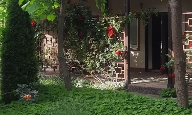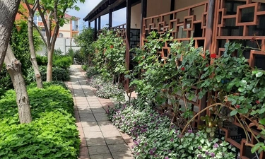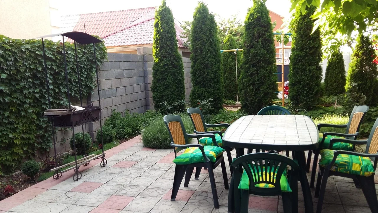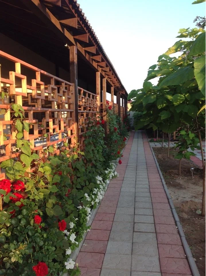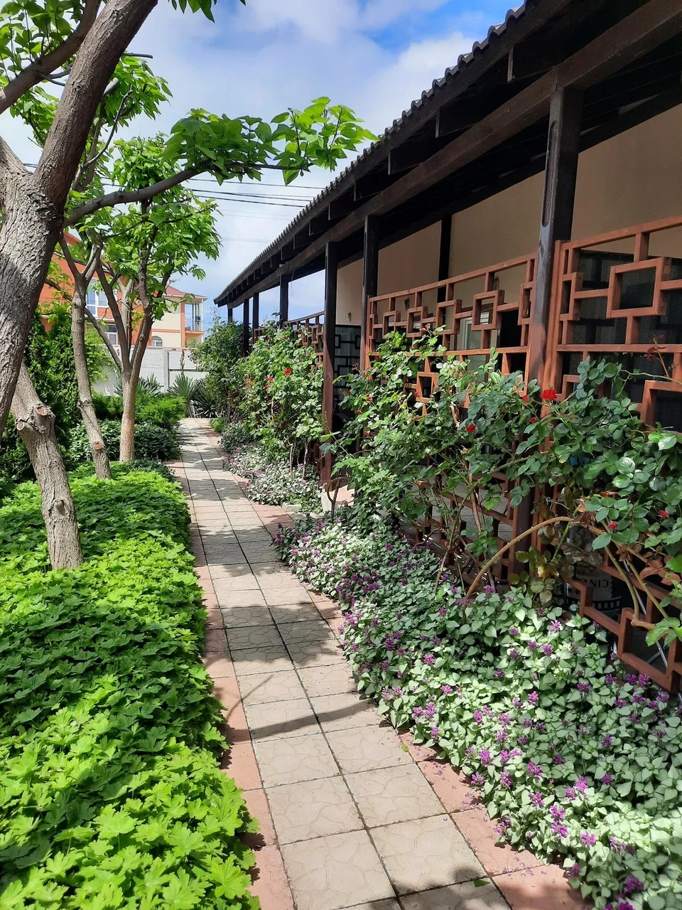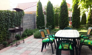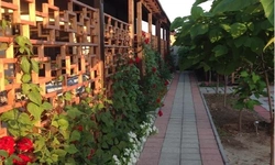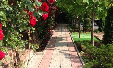 Уютный дворик, очень зеленая территория, создающая обилие тени и прохлады. Перед каждым номером своя беседочка со столиком, комфортными креслами для отдыха.