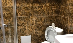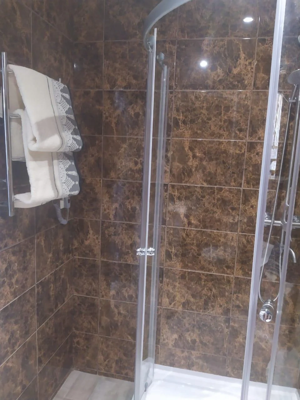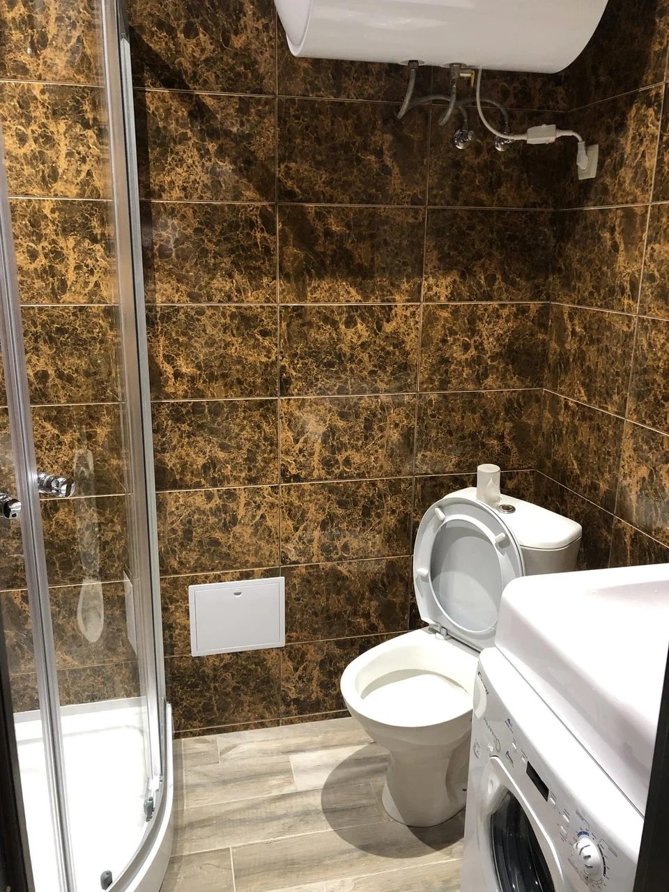 В санузле душевая кабина с системой «тропический дождь», унитаз, умывальник, полотенцесушитель, фен, стиральная машинка, тёплые полы….