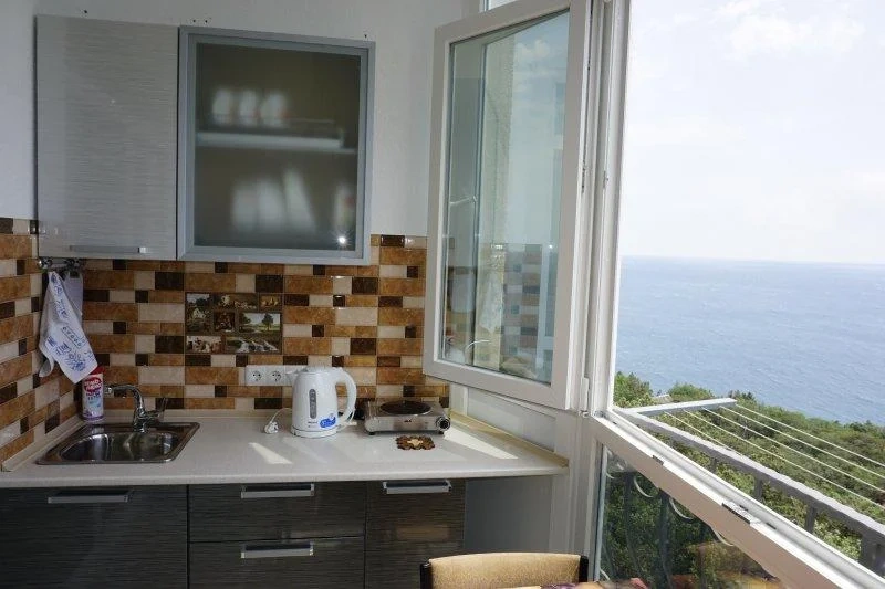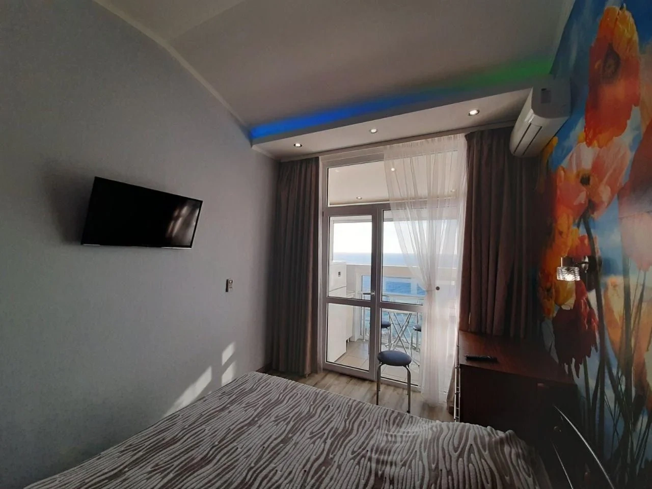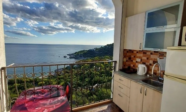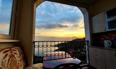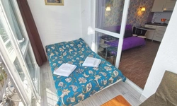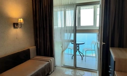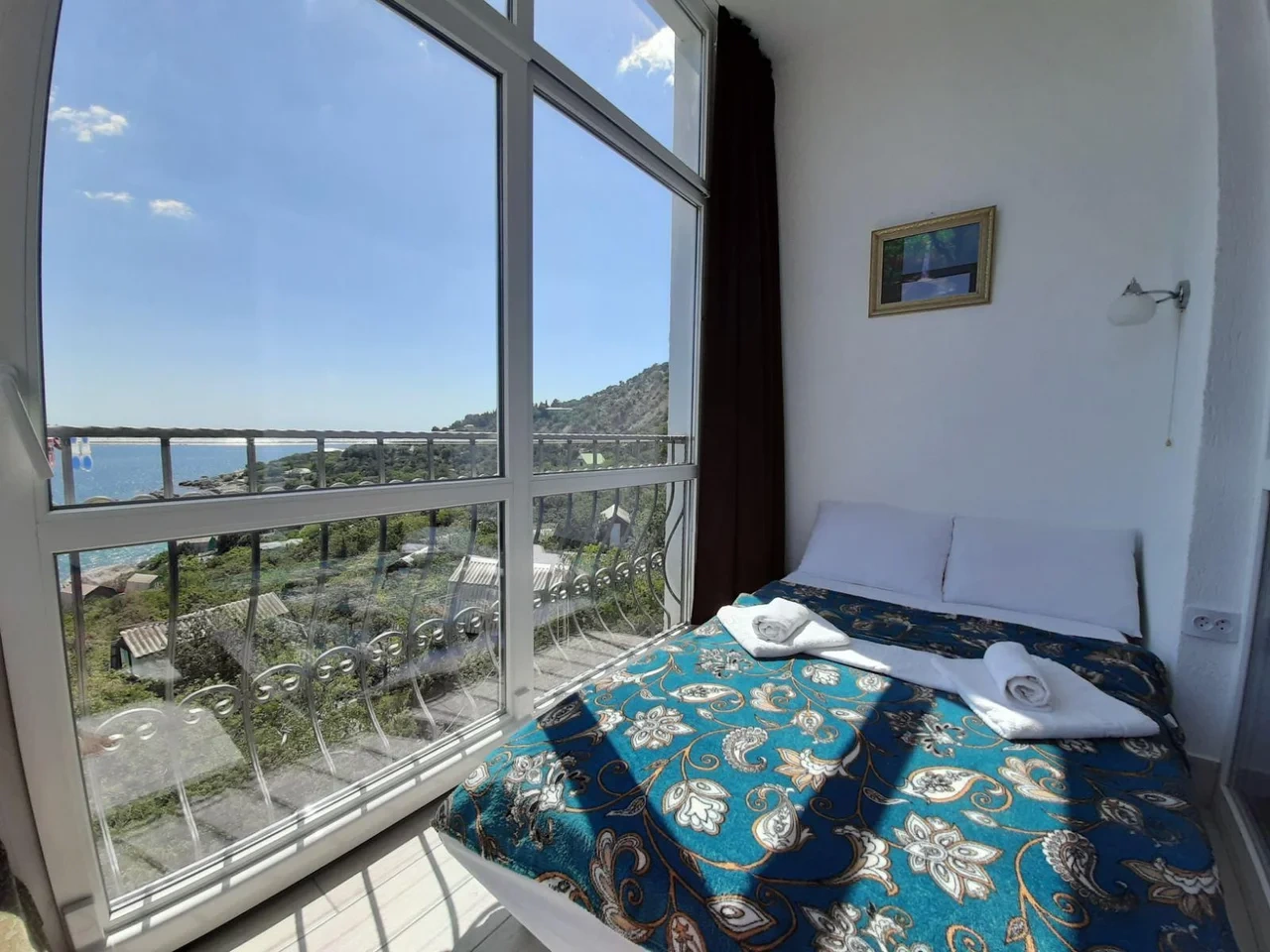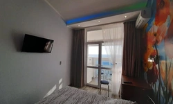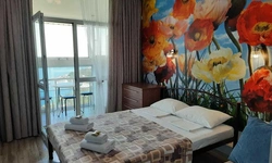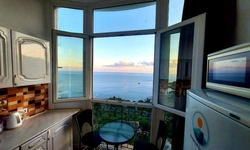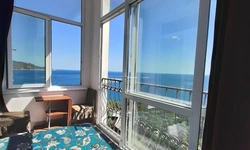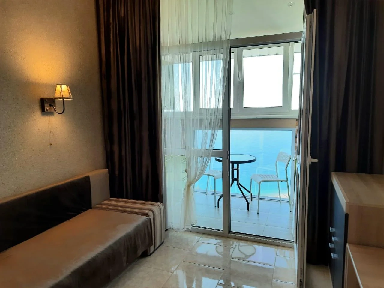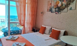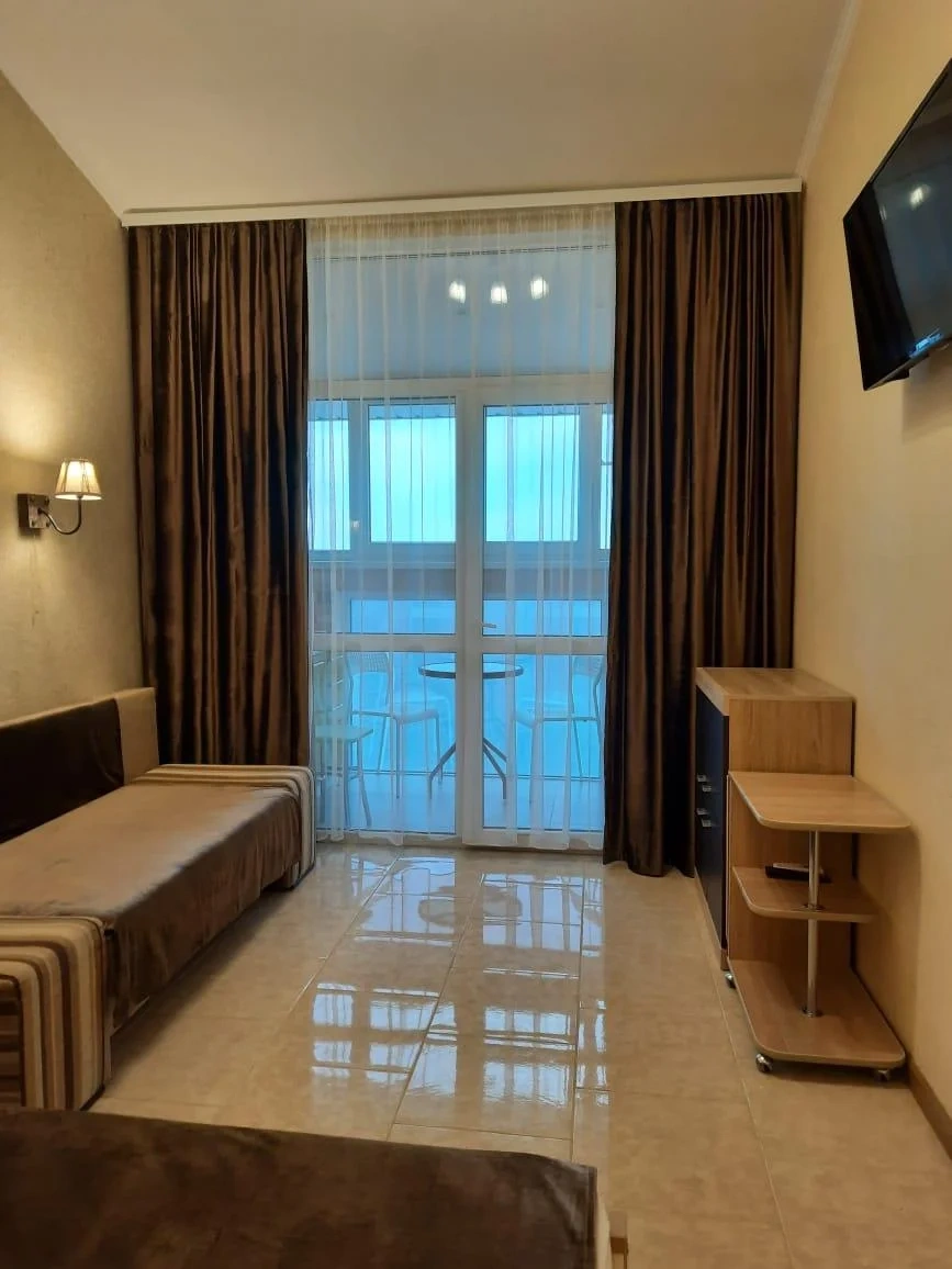 Апартамент с видом на море. Двуспальная кровать в комнате и раскладной диванчик на балконе. Балкон остеклён раздвижной системой. В номере кухня, душ, санузел, кондиционер ВайФай.