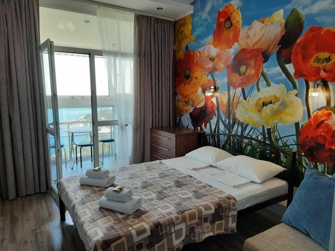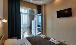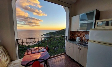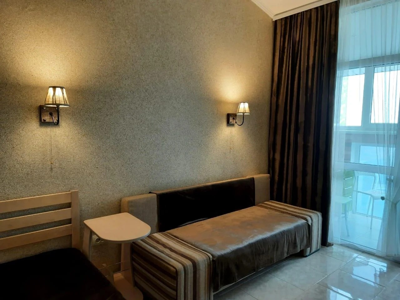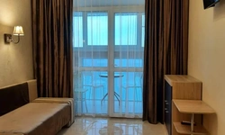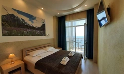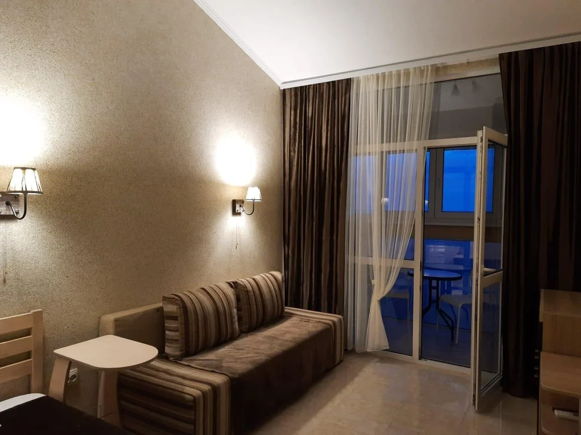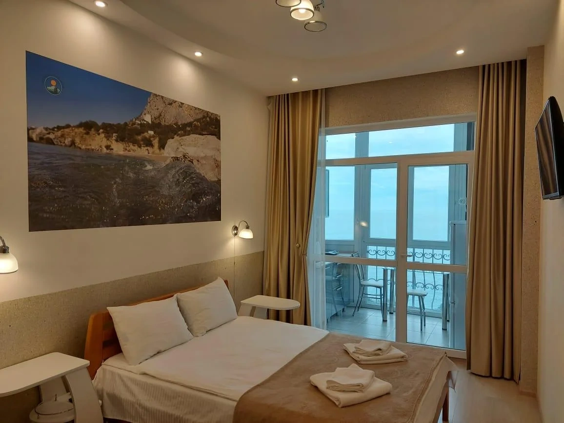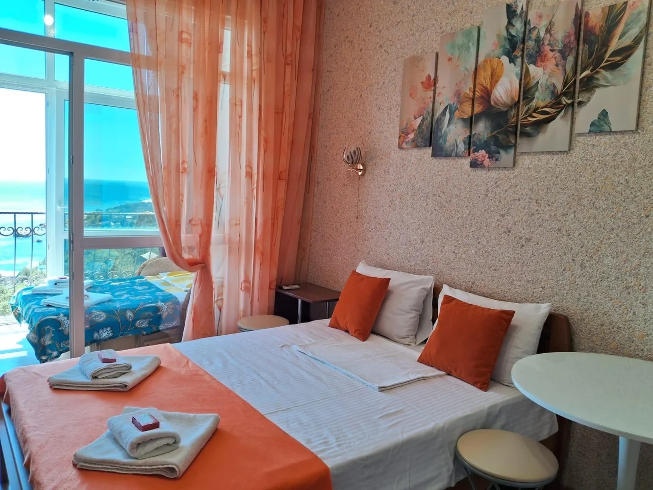 Апартамент с видом на море. Двуспальная кровать в комнате и раскладной диванчик на балконе. Балкон остеклён раздвижной системой. В номере кухня, душ, санузел, кондиционер ВайФай.