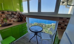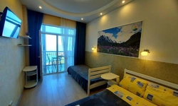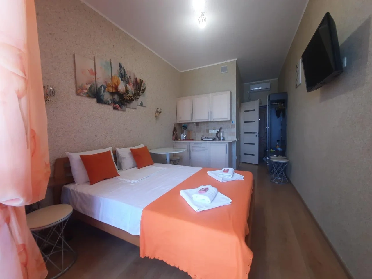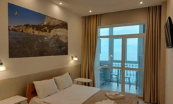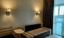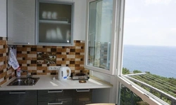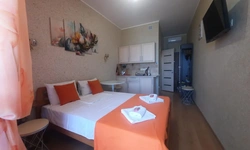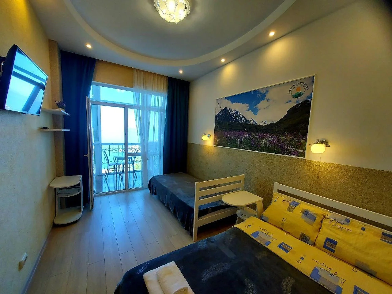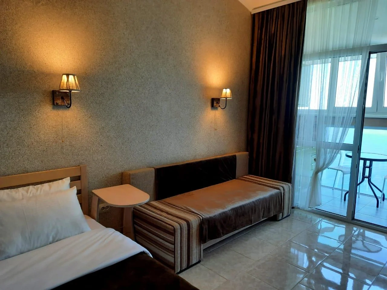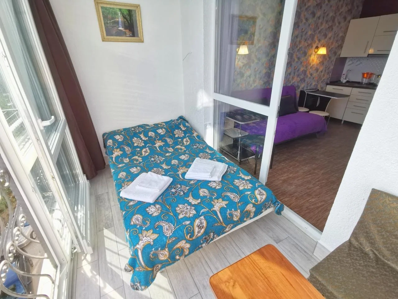 Апартамент с видом на море. Двуспальная кровать в комнате и раскладной диванчик на балконе. Балкон остеклён раздвижной системой. В номере кухня, душ, санузел, кондиционер ВайФай.