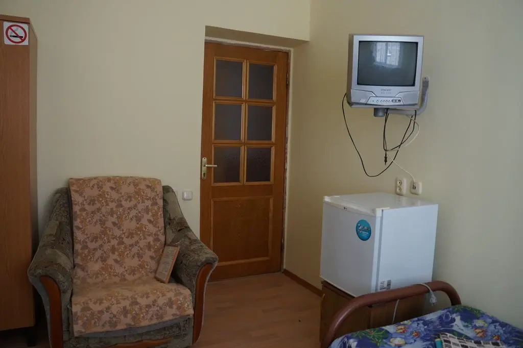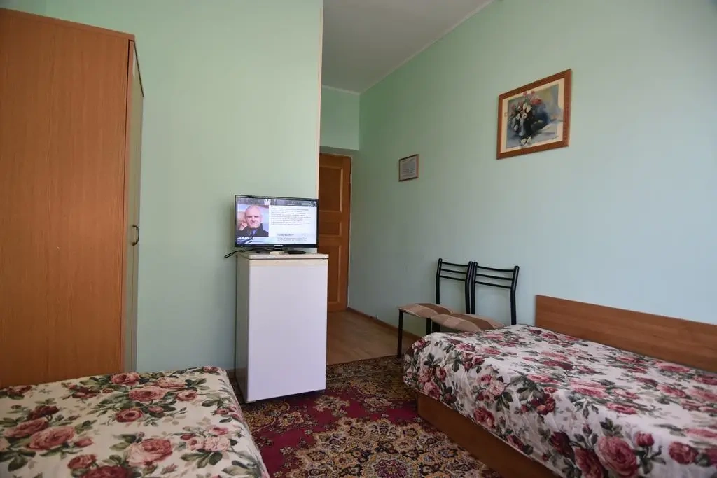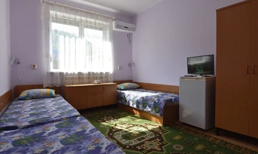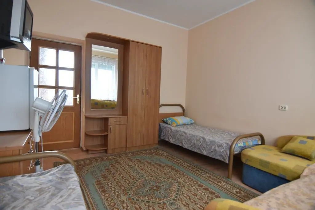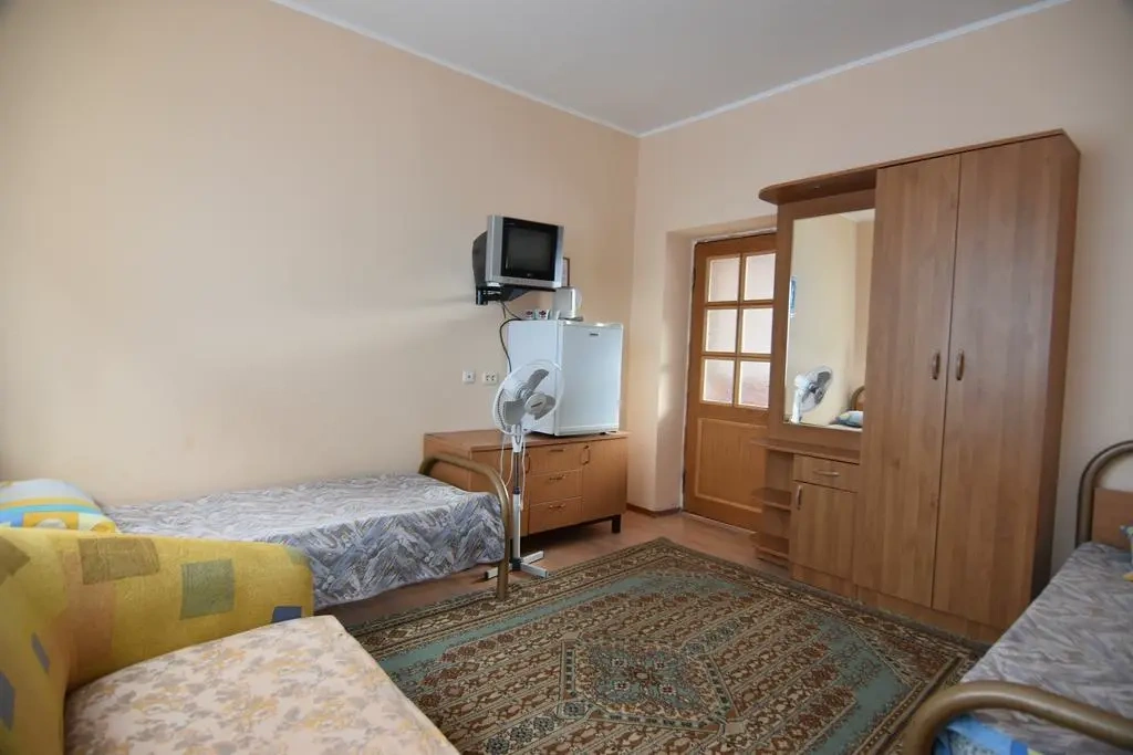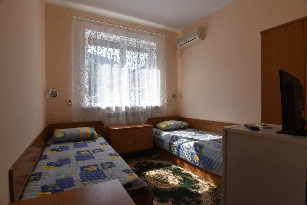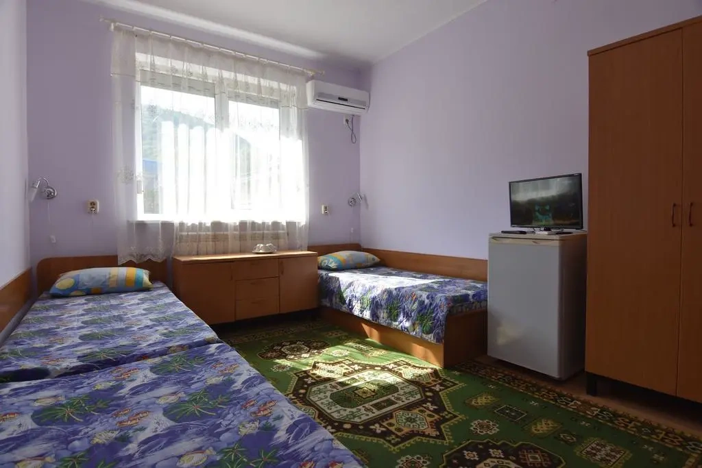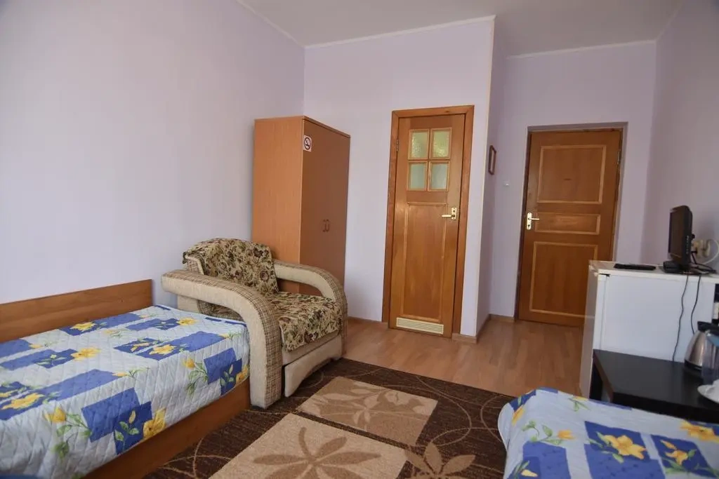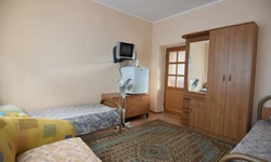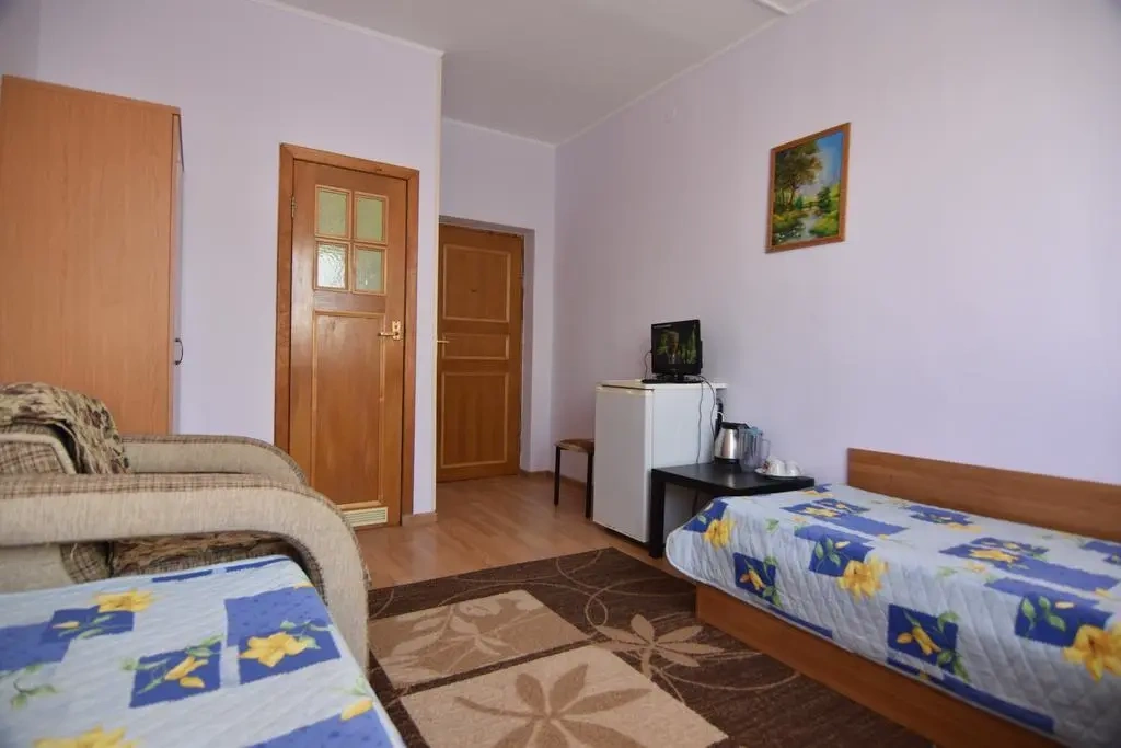 Меблированная комната: 2 односпальные кровати и 1 кресло-кровать, холодильник, тв, сплит. Санузел с душевой кабиной рядом, на этом же этаже, один на 3 номера.