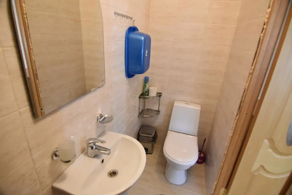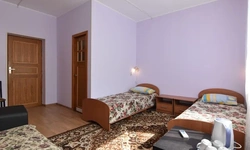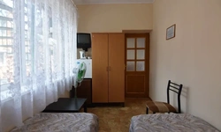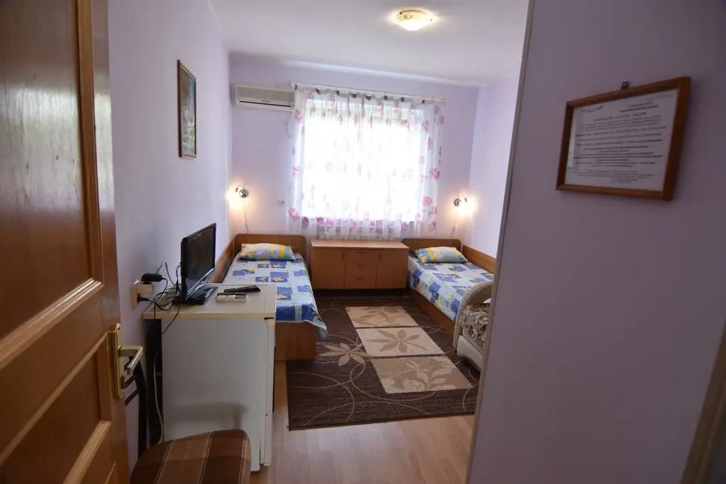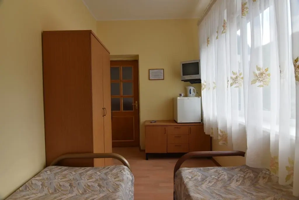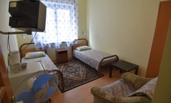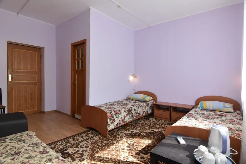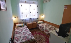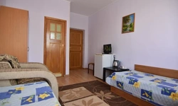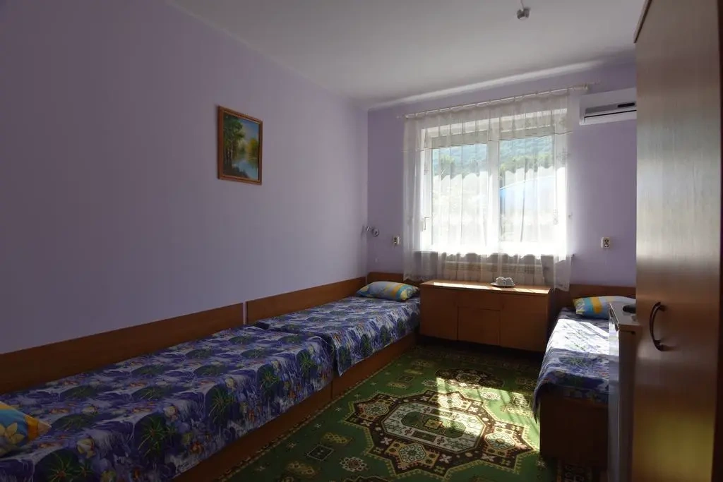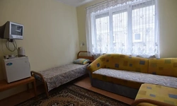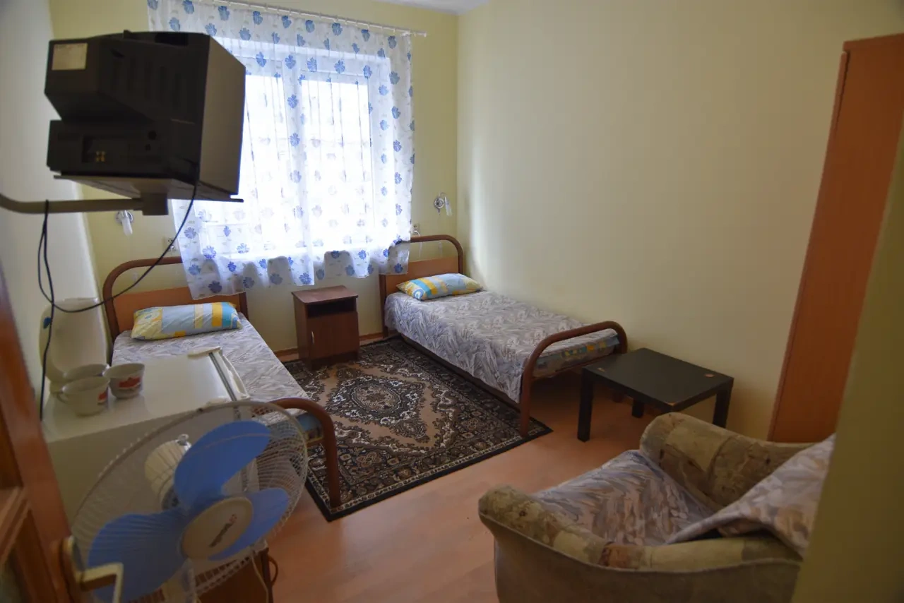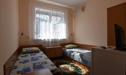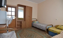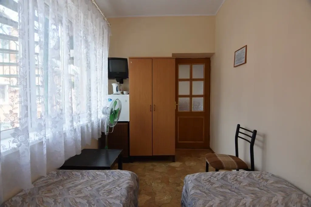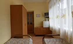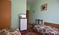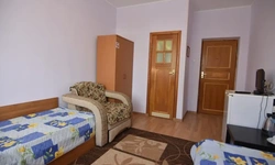 Меблированная комната: 2 односпальные кровати и 1 кресло-кровать, холодильник, тв, сплит. Санузел с душевой кабиной рядом, на этом же этаже, один на 3 номера.