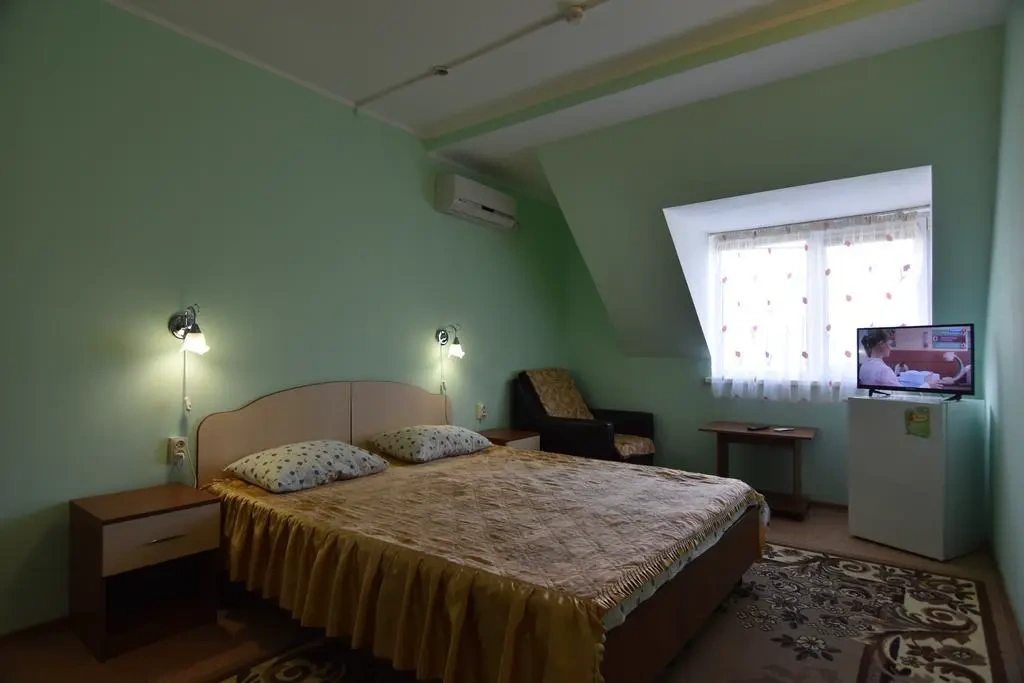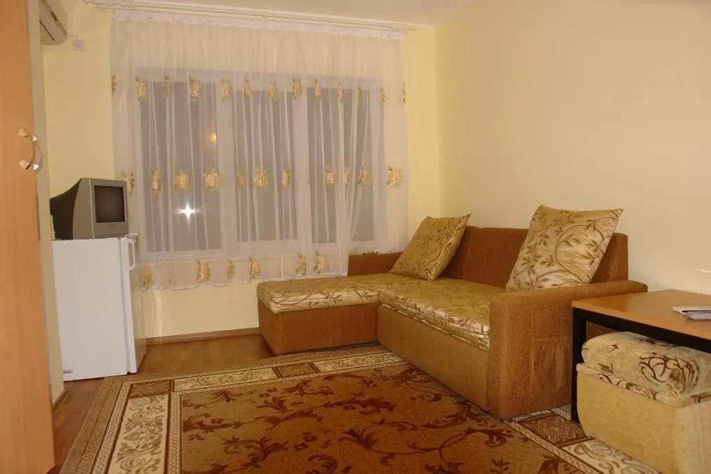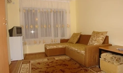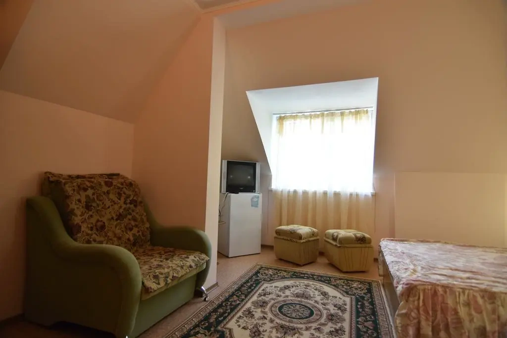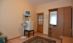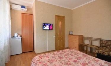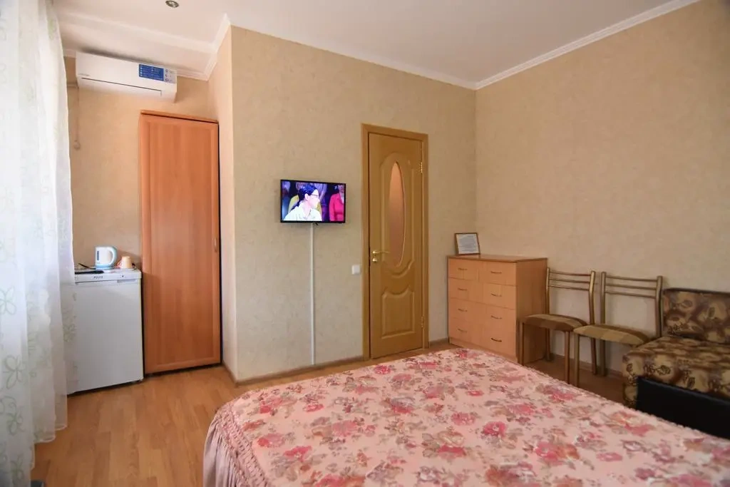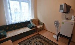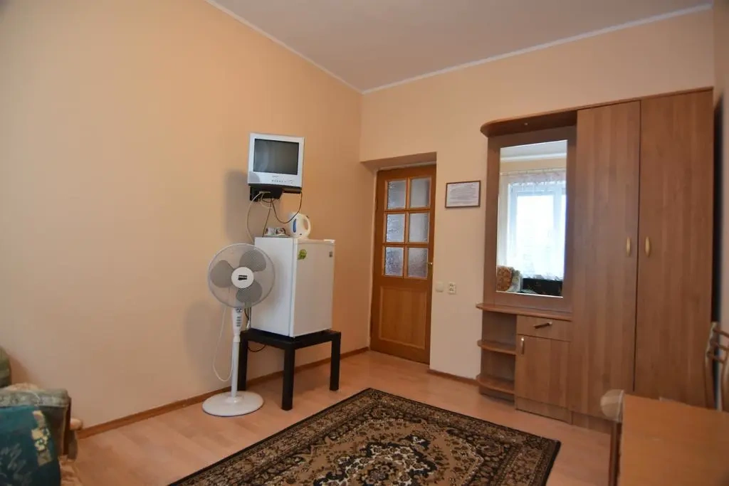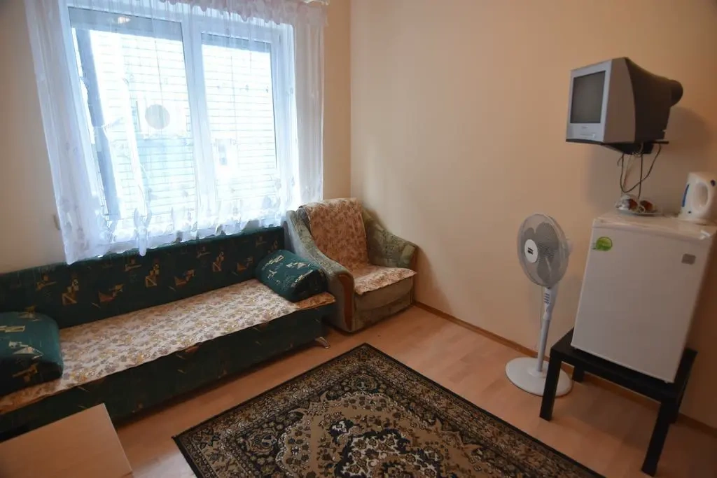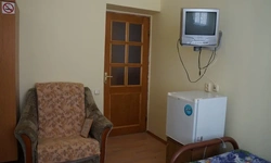 Меблированная комната: диван 2х спальный и 1 кресло-кровать , холодильник, тв, сплит. Санузел с душевой кабиной рядом, на этом же этаже, один на 3 номера