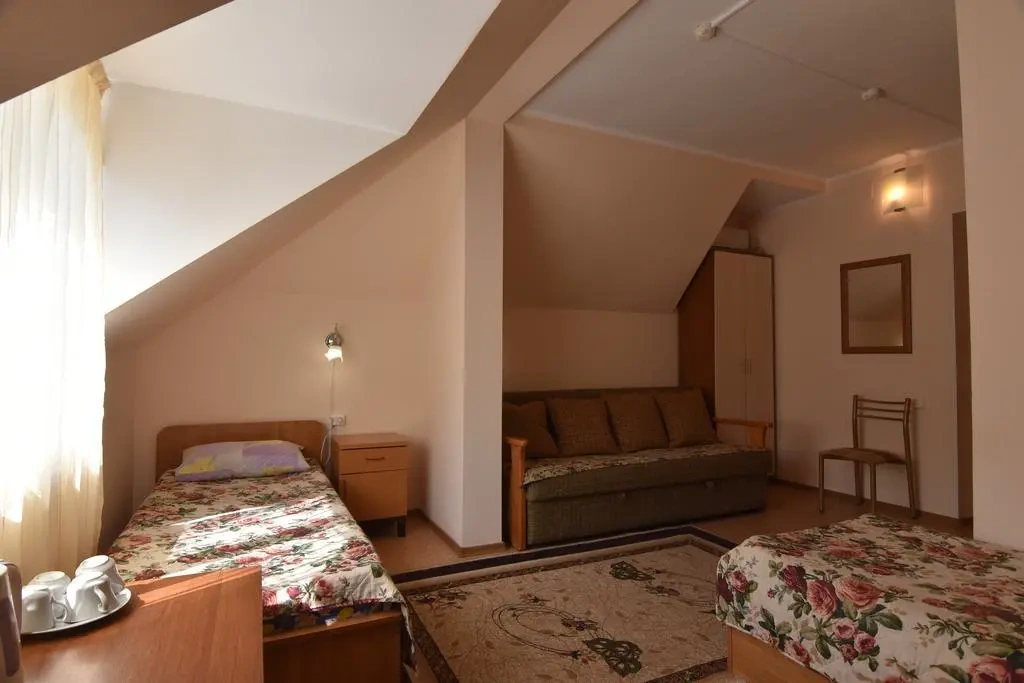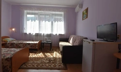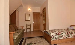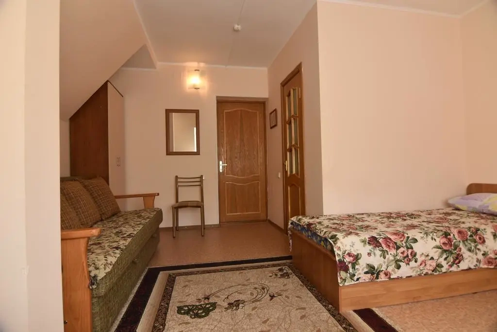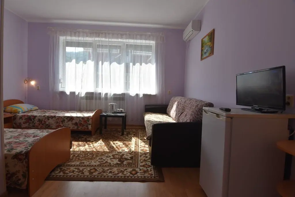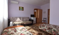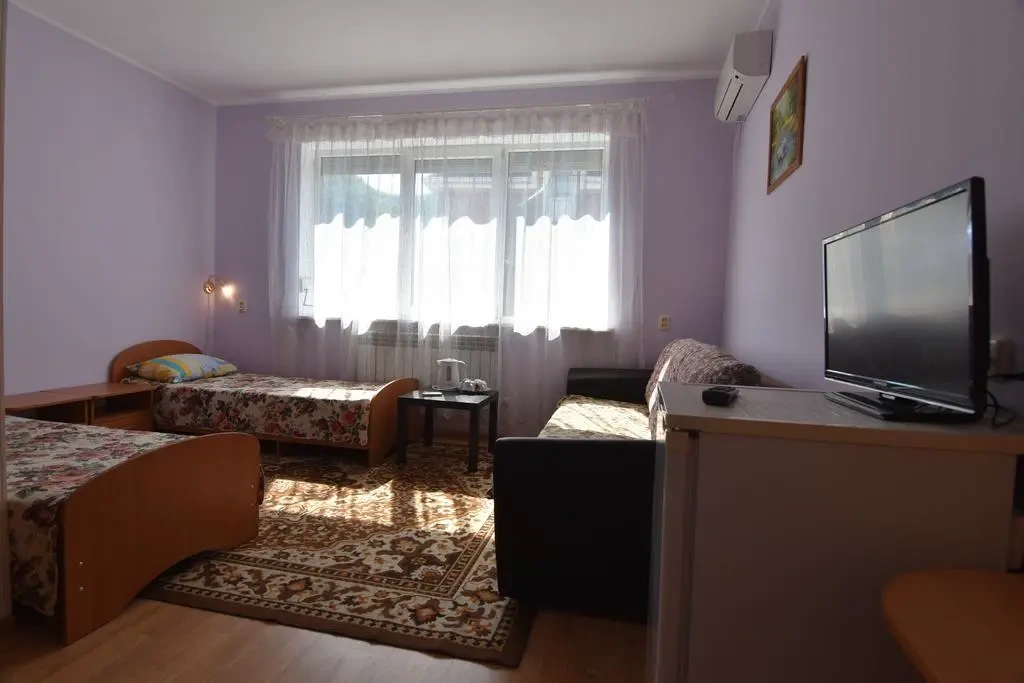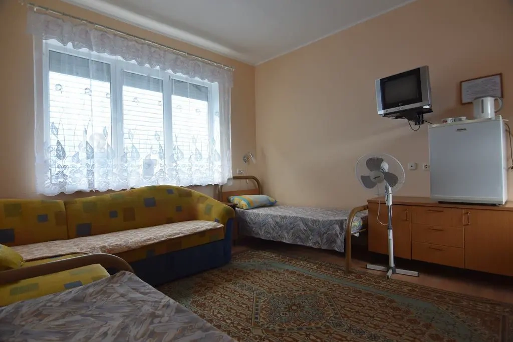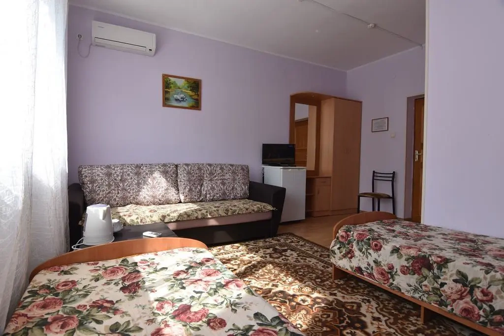Меблированная комната: диван 2х спальный и 2 односпальные кровати, холодильник, тв, сплит. Санузел с душевой кабиной рядом, на этом же этаже, один на 3 номера