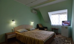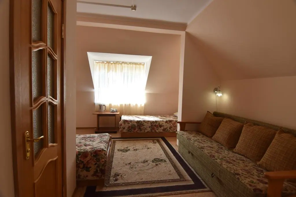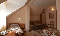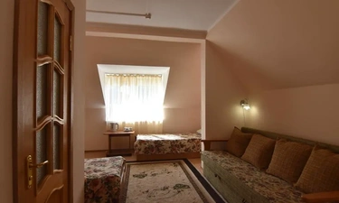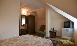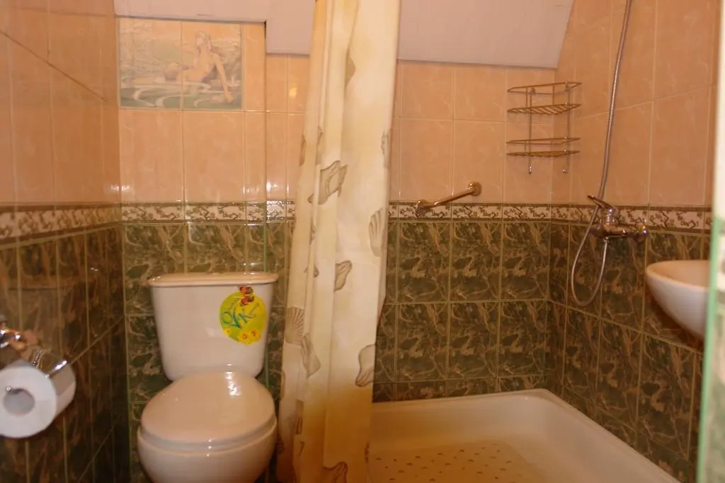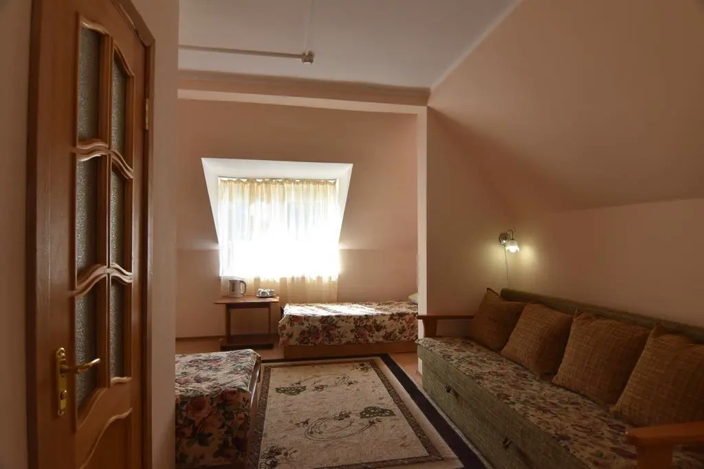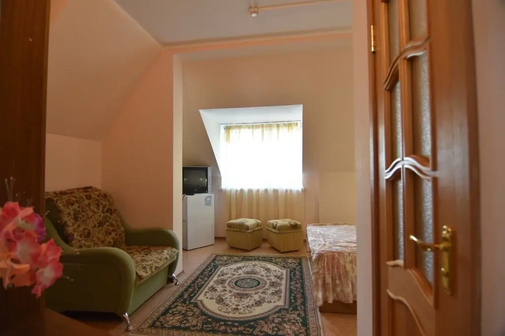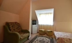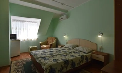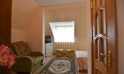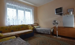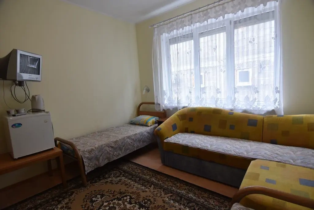 Меблированная комната: диван 2х спальный и 2 односпальные кровати, холодильник, тв, сплит. Санузел с душевой кабиной рядом, на этом же этаже, один на 3 номера