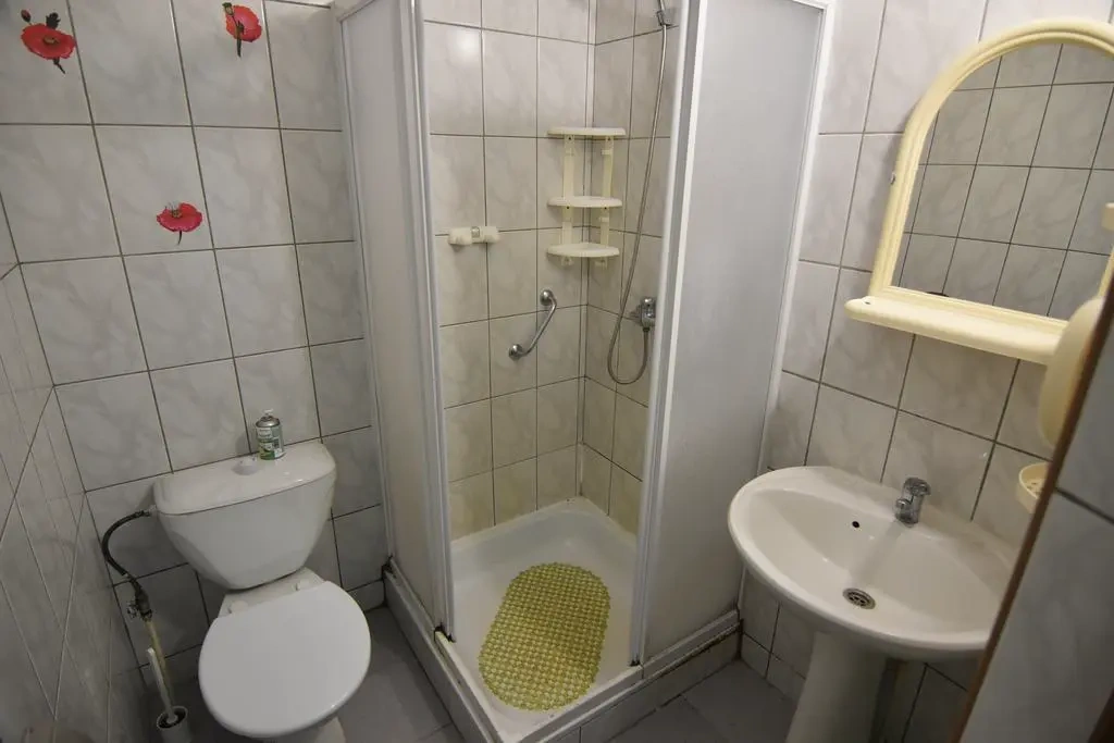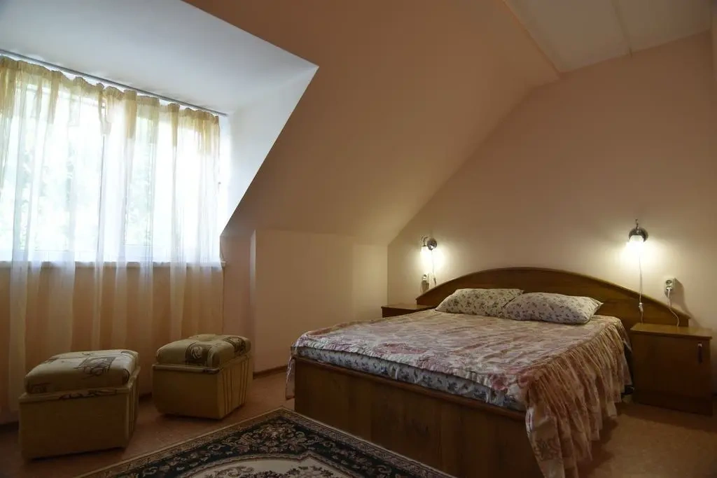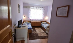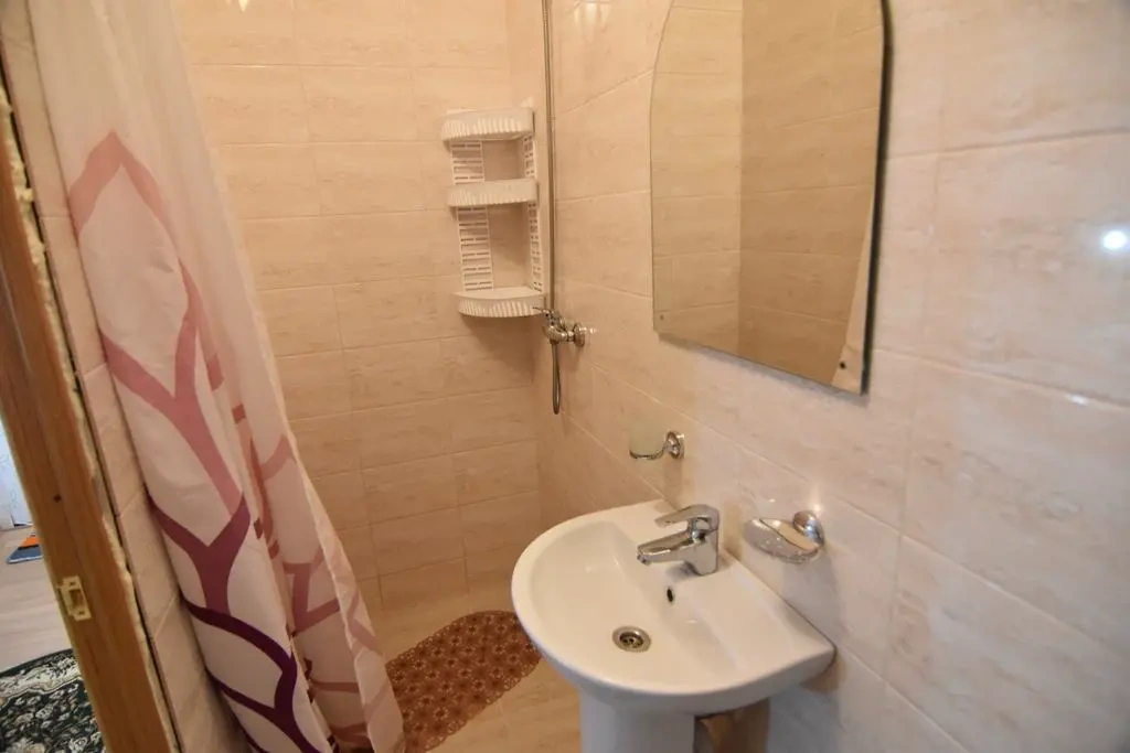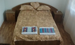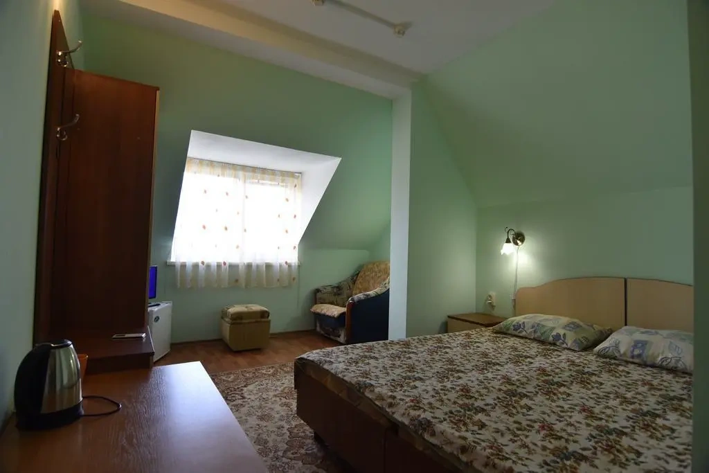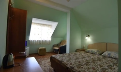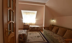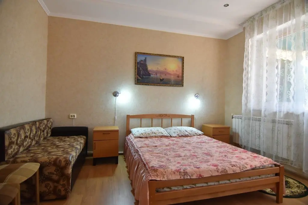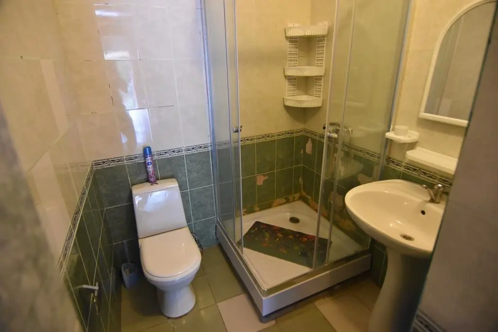 Меблированная комната: диван 2х спальный и 2 односпальные кровати, холодильник, тв, сплит. Санузел с душевой кабиной рядом, на этом же этаже, один на 3 номера