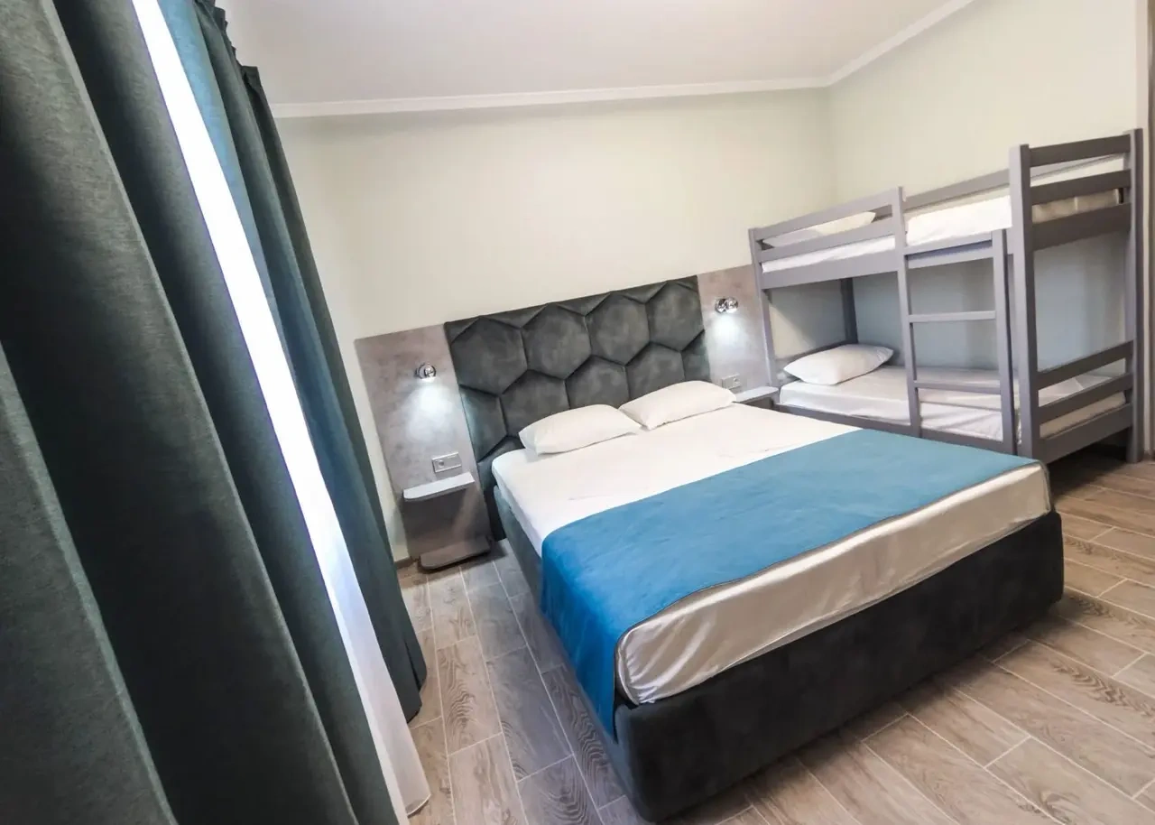 Номер семейный двуспальная кровать + двух ярусная кровать 170см в длину, для детей до 14 лет.