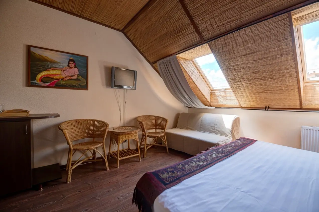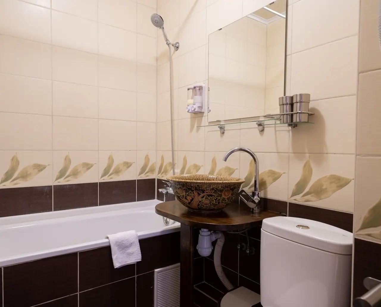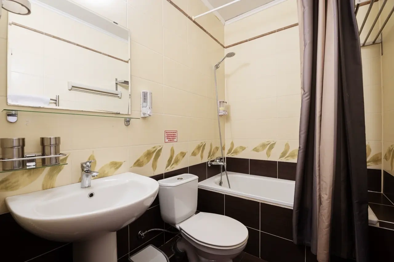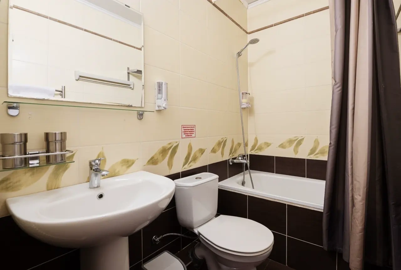Вместимость: 2 взрослых+1 ребенок на дополнительном спальном месте, либо 2 взрослых+1 взрослый на дополнительном спальном месте. Проживание одного ребенка до 1 года с двумя взрослыми без предоставления дополнительного спального места – БЕСПЛАТНО. Площадь номера: 16 м2 Уютный однокомнатный номер, прекрасно подходит для размещения пар и семей с детьми, оборудованным всем необходимым для комфортного проживания. В номере предусмотрены: большая двухспальная кровать, раскладной диван или кресло-кровать, шкаф для одежды, кондиционер, телевизор с плоским экраном, холодильник, электрический чайник, индивидуальный санузел с ванной, фен, туалетно-косметические принадлежности, халаты, тапочки. Чайный набор (пакетированный чай, кофе, сливки) – приятный бонус для наших гостей. На этаже расположены: гладильная доска, утюг.