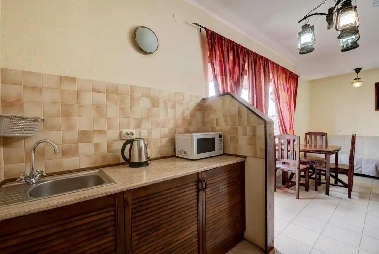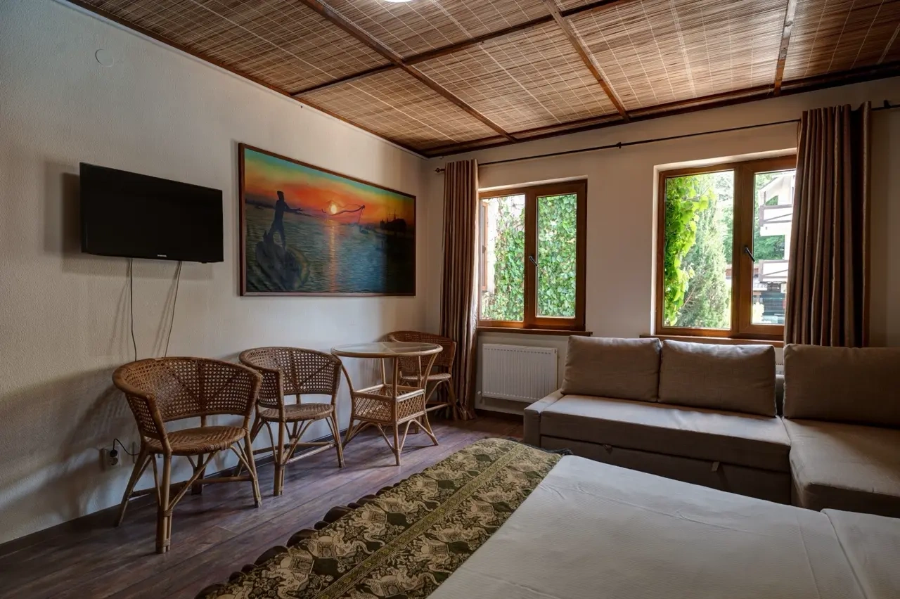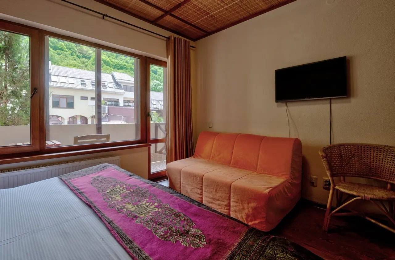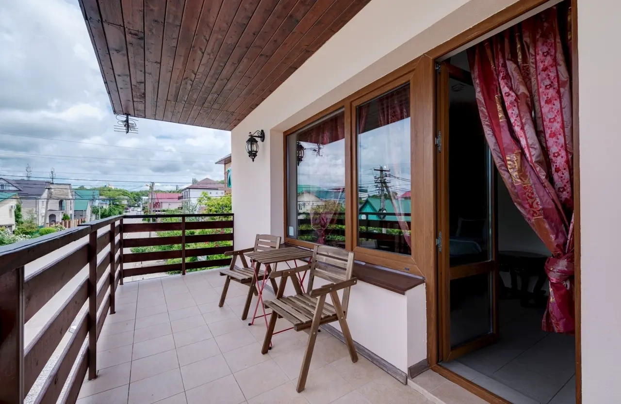 Вместимость: 2 взрослых+2 ребенка на дополнительном спальном месте, либо 2 взрослых+1 взрослый на дополнительном спальном месте. Дополнительное спальное место для ВТОРОГО РЕБЕНКА оплачивается отдельно при заселении. Проживание одного ребенка до 1 года с двумя взрослыми без предоставления дополнительного спального места – БЕСПЛАТНО. Площадь номера: 25 м2 Уютный однокомнатный номер с балконом и мини-кухней, прекрасно подходит для размещения пар и семей с детьми, оборудованным всем необходимым для комфортного проживания. В номере предусмотрены: большая двухспальная кровать, раскладной диван, шкаф для одежды, кондиционер, телевизор с плоским экраном, холодильник, электрический чайник, сейф, индивидуальный санузел с ванной, фен, туалетно-косметические принадлежности, халаты, тапочки. Чайный набор (пакетированный чай, кофе, сливки) – приятный бонус для наших гостей. На этаже расположены: гладильная доска, утюг.