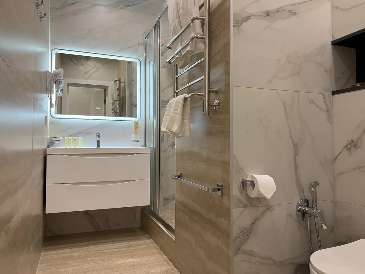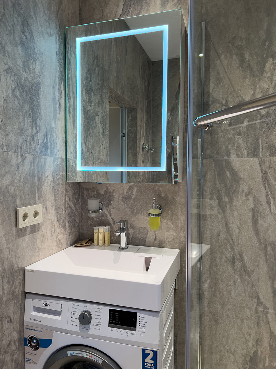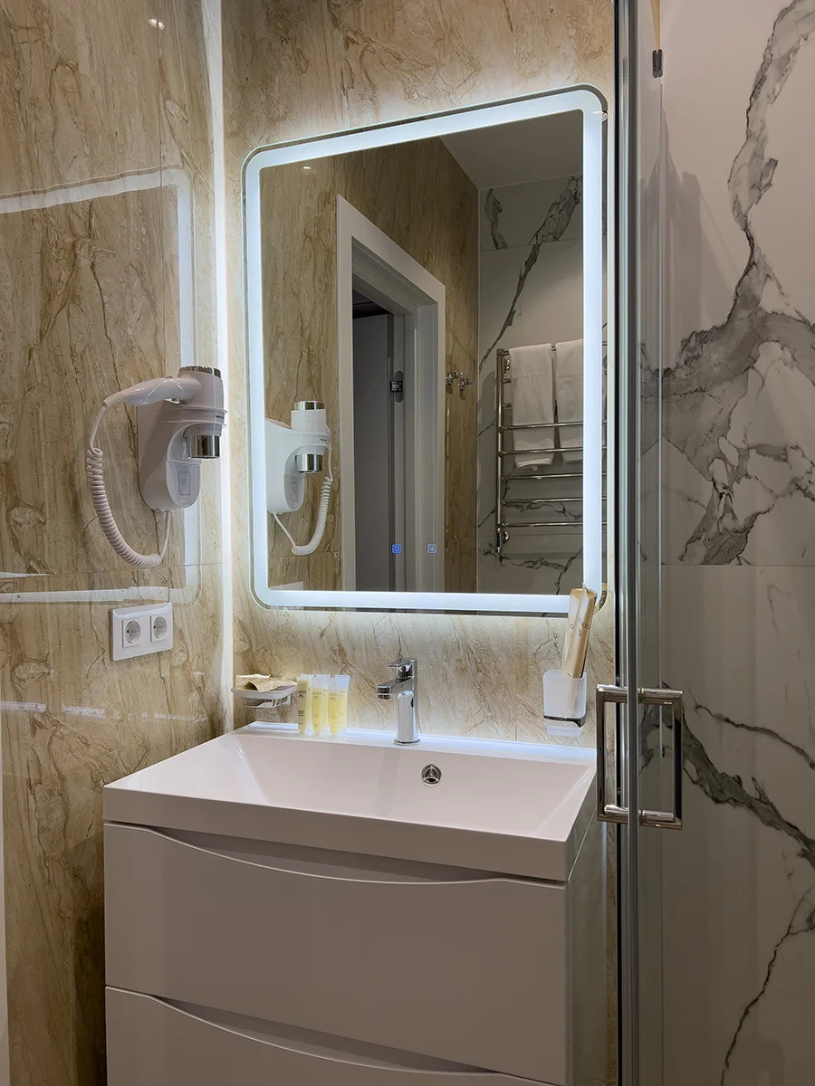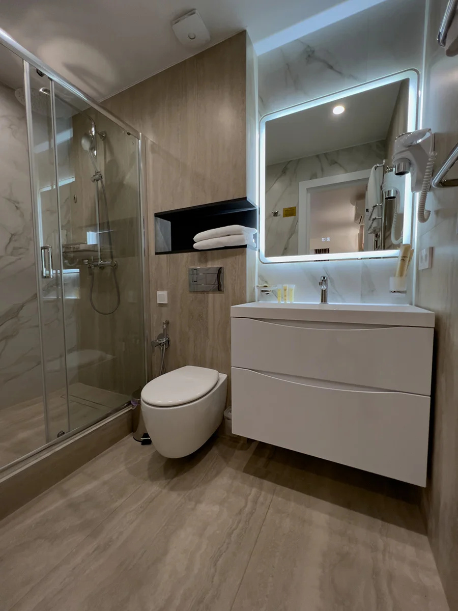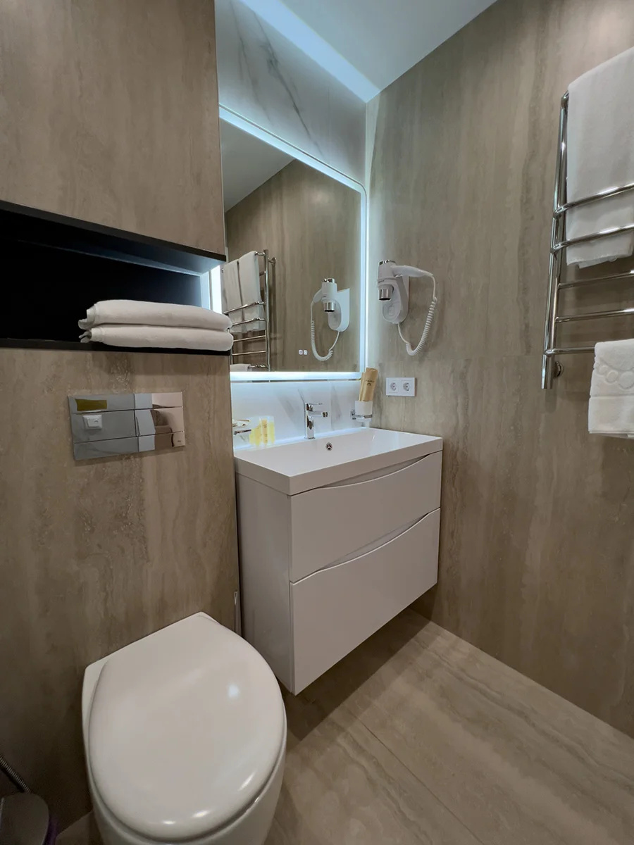 Современный чистый уютный отель. В туалете даже подогрев пола и зеркала.