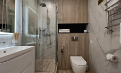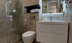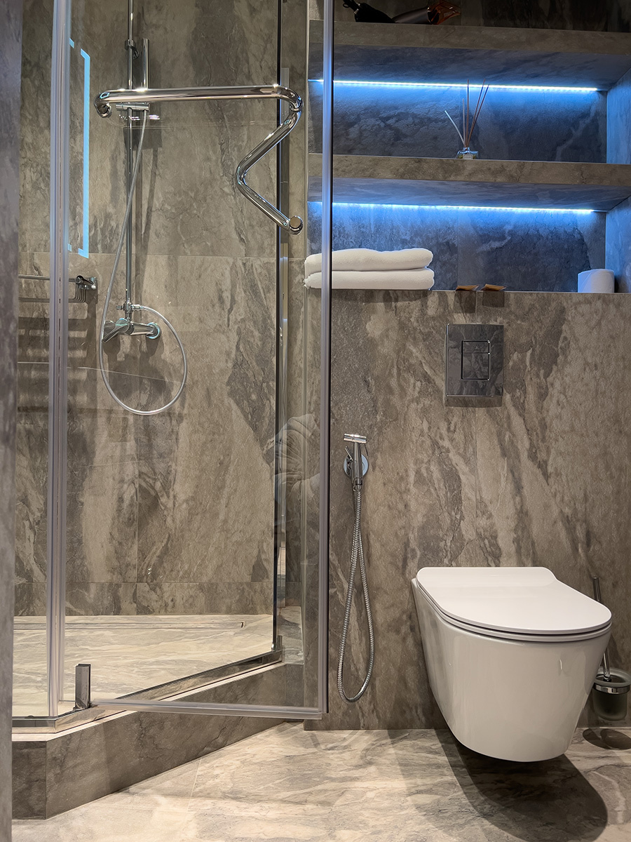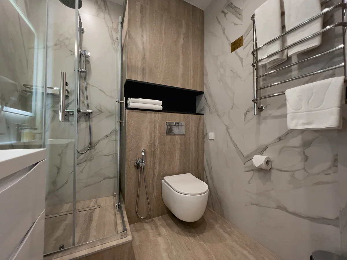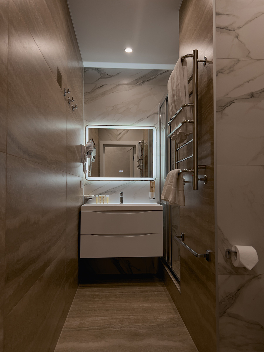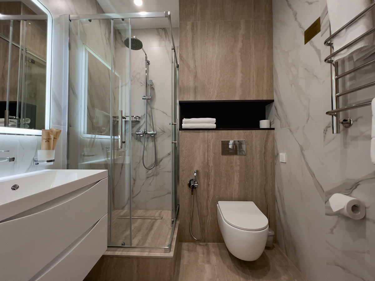 Современный чистый уютный отель. В туалете даже подогрев пола и зеркала.