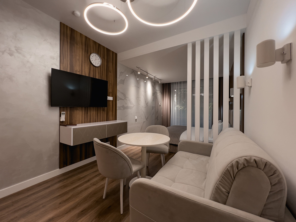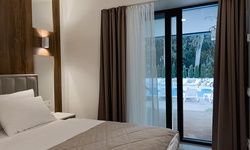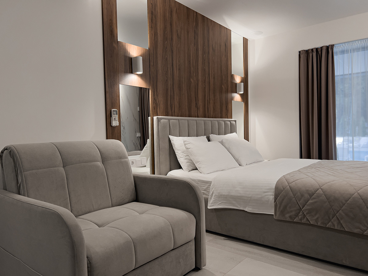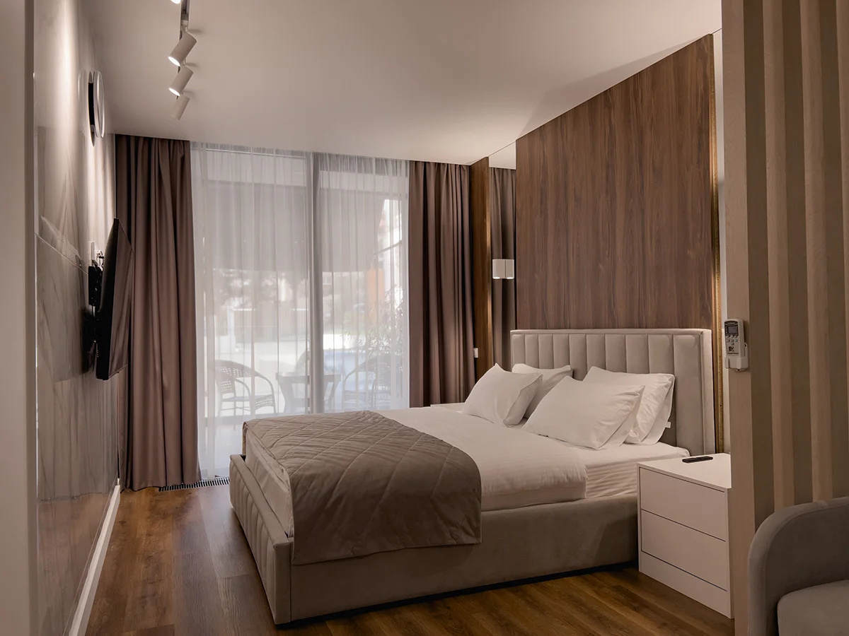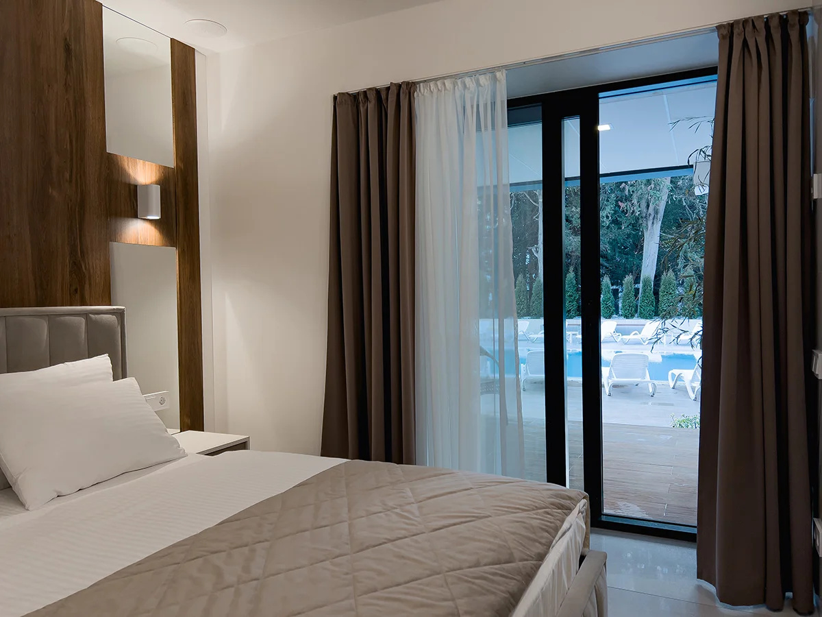 Номер с видом на бассейн - отличный, современный и светлый, теплый, с добной кроватью. Наличие кухонного уголка с микроволновкой, с возможностью сделать горячий завтрак - для нас это было актуально. Неподалеку есть Перекресток, поэтому можно купить всё необходимое.
