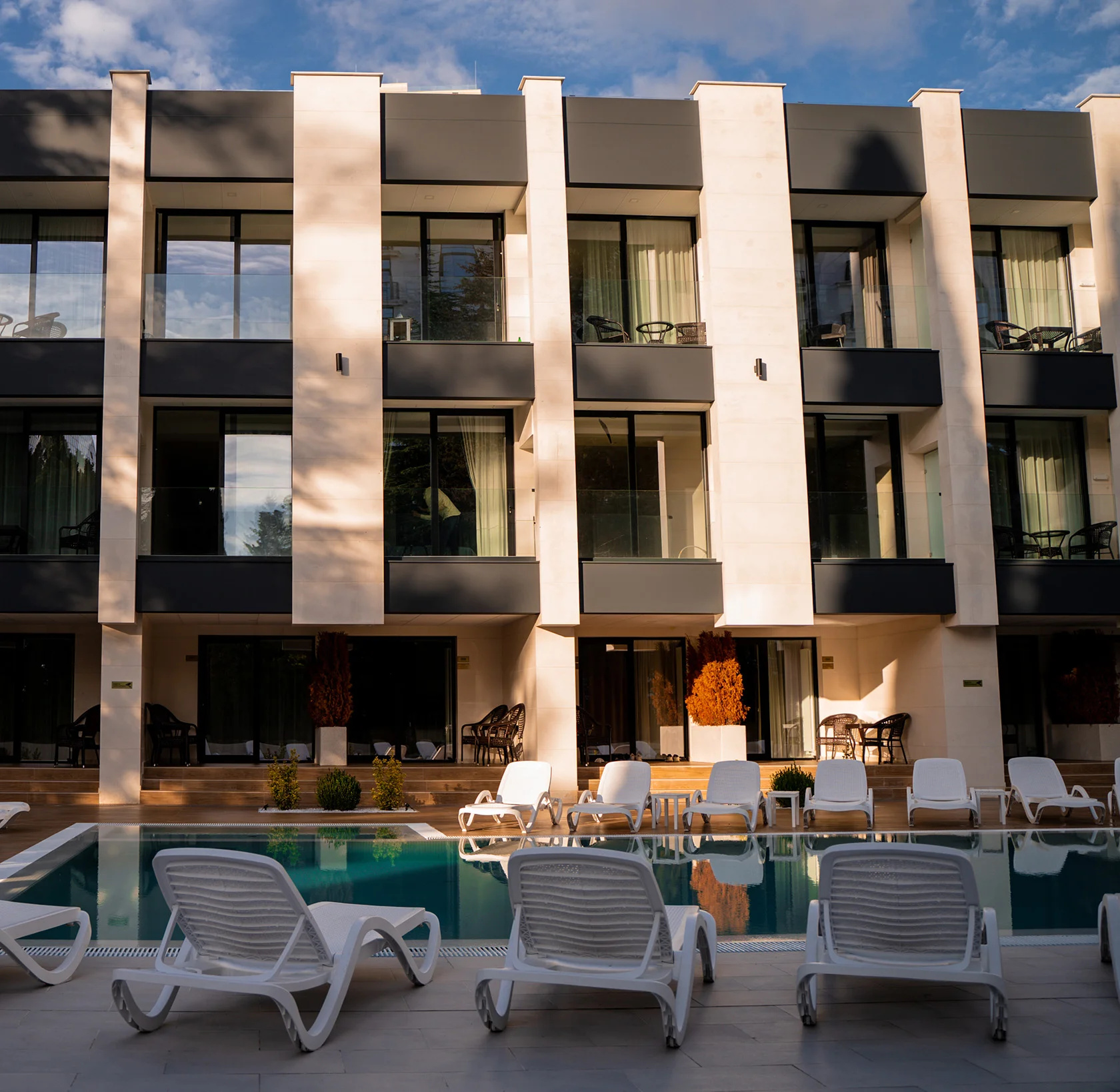 Прекрасный отель! Очень вежливый персонал, девушки на ресепшене сразу решают любые возникшие вопросы. Завтраки замечательные, приносят к желаемому времени прямо в номер. Бассейн красивый, с подсветкой, теплый, работает до 22 часов. Уборка на 5+, придраться не к чему, все на уровне! Обязательно вернемся в этот отель!