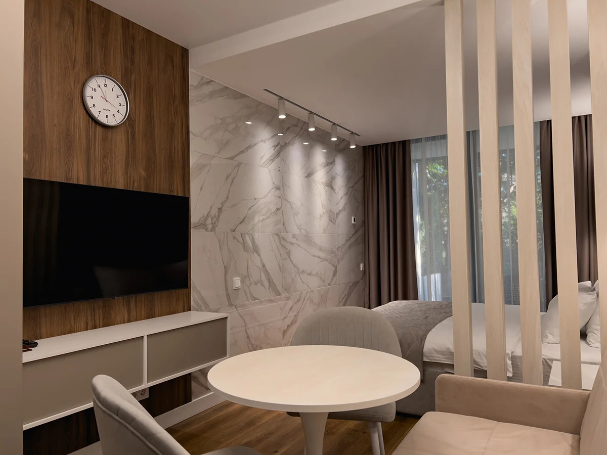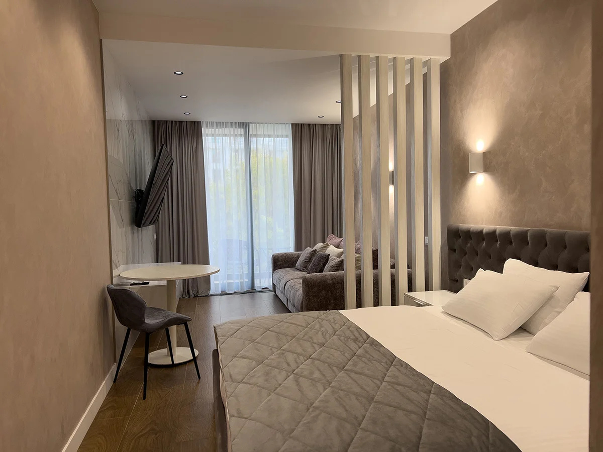 Были в сентябре 2023. Бассейн большой , чистый и приятной теплоты+ хороший период работы: с 8 до 22. В номере были чай и кофе. Ребёнок спал на хорошем большом раскладном диване. Можно курить на балконе. Есть колонка Алиса. Приятная косметика для душа