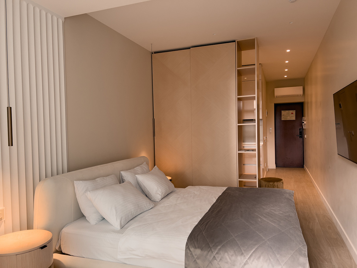 Номер небольшой, но грамотно спроектирован, места достаточно для семьи из 3 человек. Удобная кровать, хорошее белье. Подушки немного неудобные.