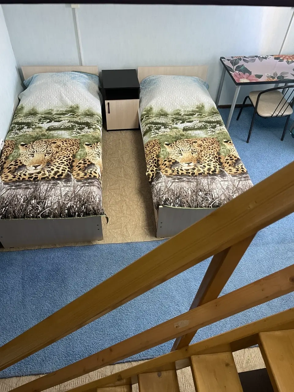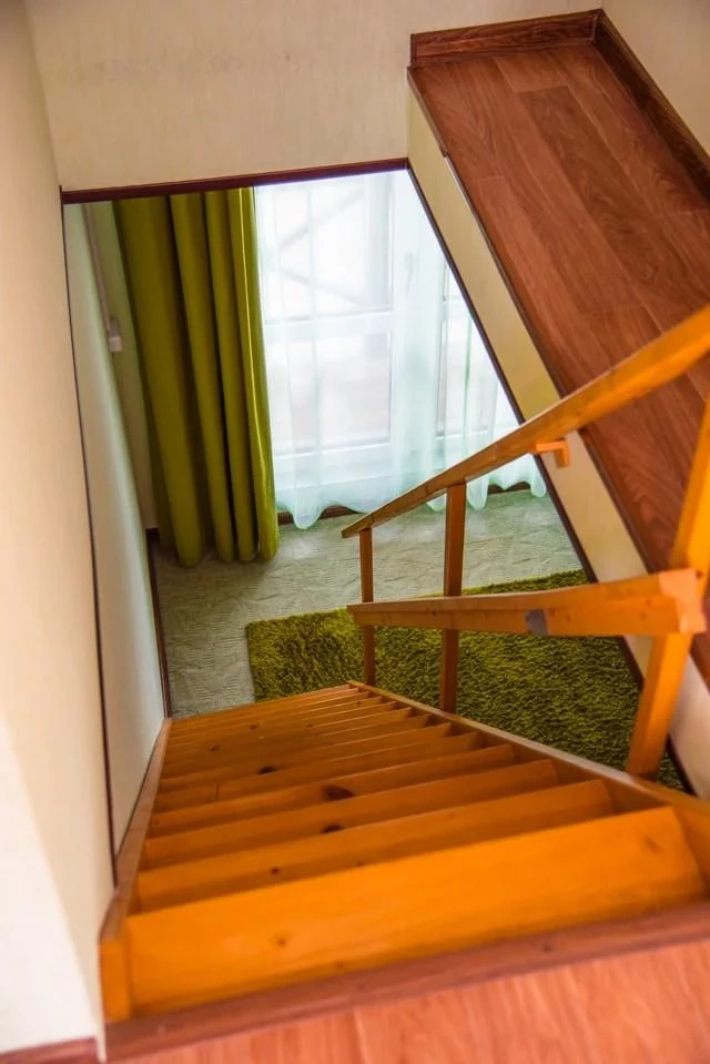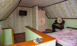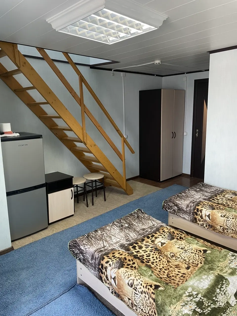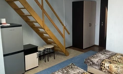 Комнаты изолированные. В первой комнате двухместный диван, кухня, холодильник, стол, балкон, лестница во вторую комнату. Во второй комнате двуспальная кровать, тумбочка, шкаф, телевизор, сплит-система. В номере санузел с душем.