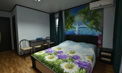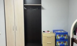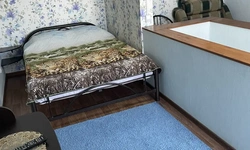 Размещение взрослых и детей в разных комнатах. Двуспальная кровать, тумбочка, шкаф, телевизор, сплит-система. В детской двухъярусная кровать. В номере холодильник, стол, санузел с душем, кухня, балкон